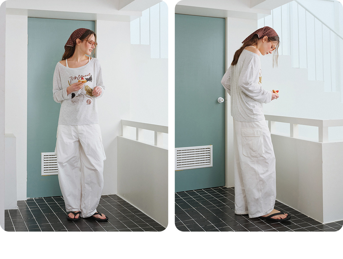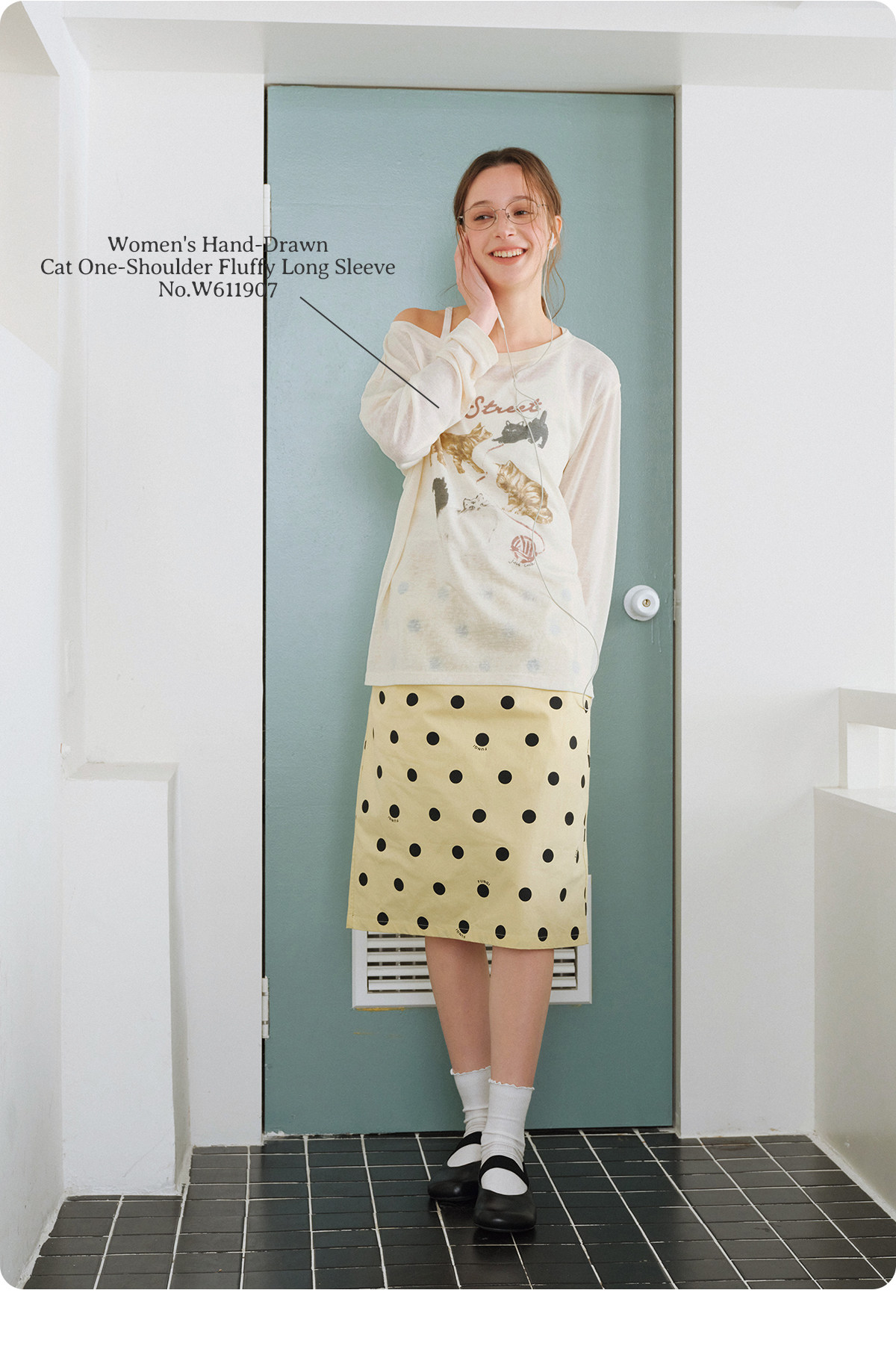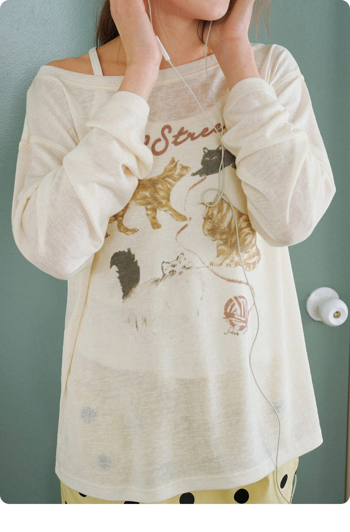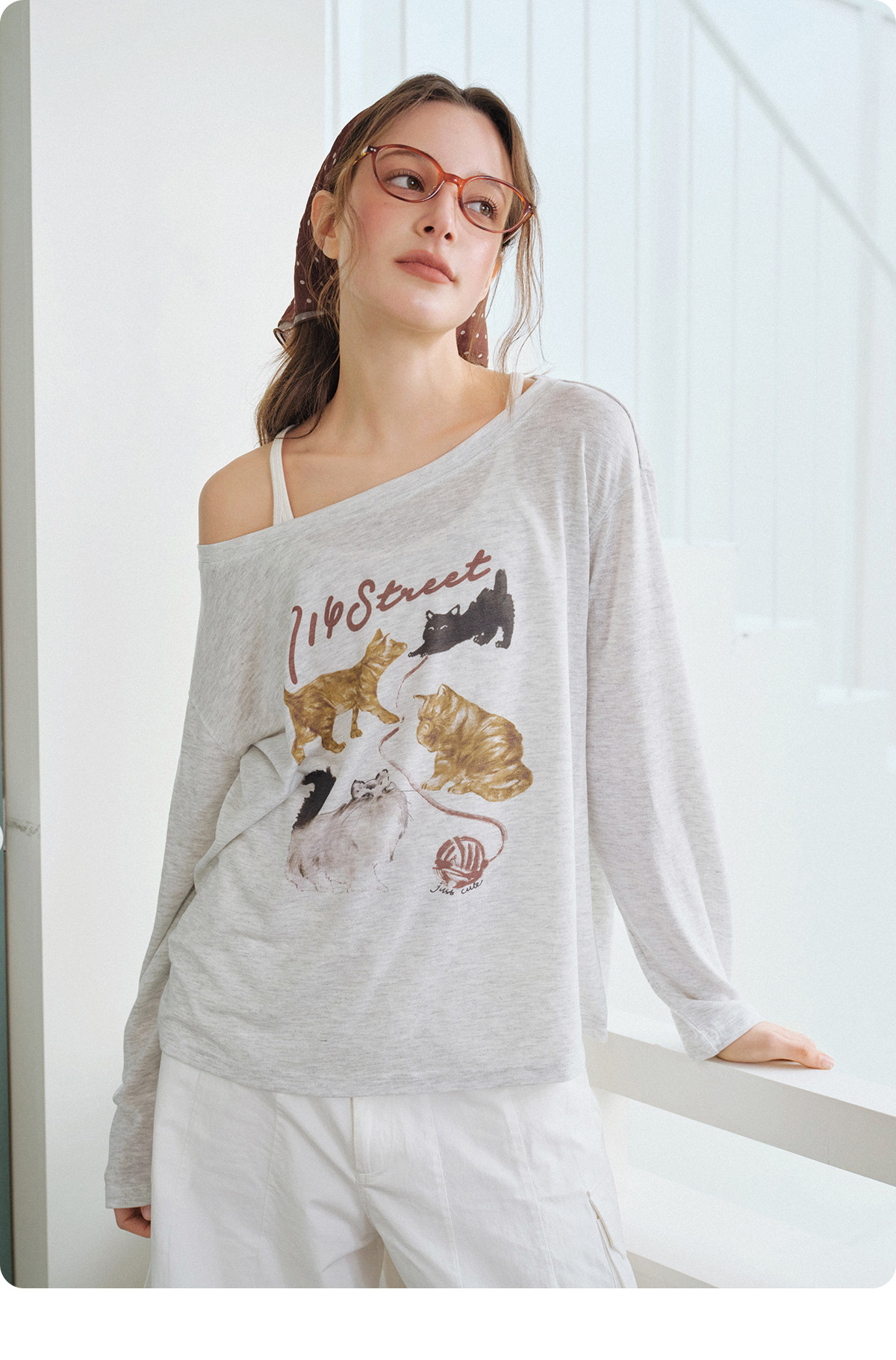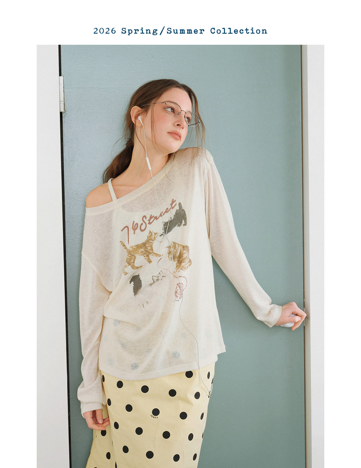 714street轻薄小猫一字肩长袖罩衫2026春夏雪花肌理宽松斜肩T恤女