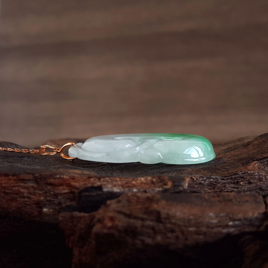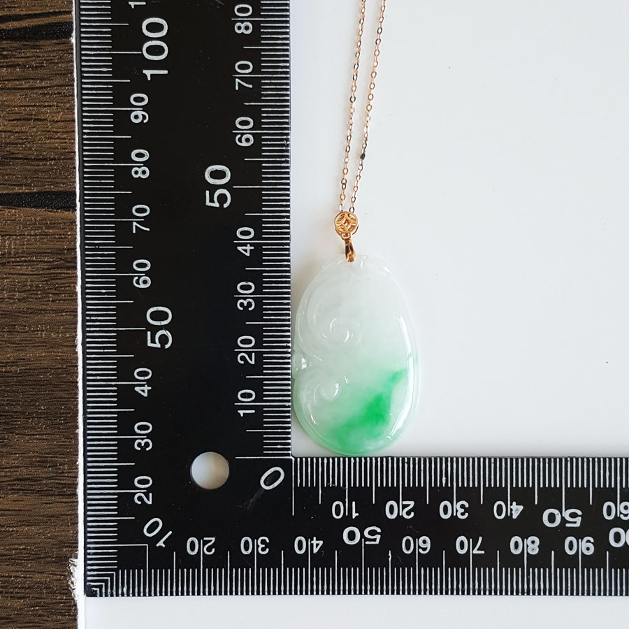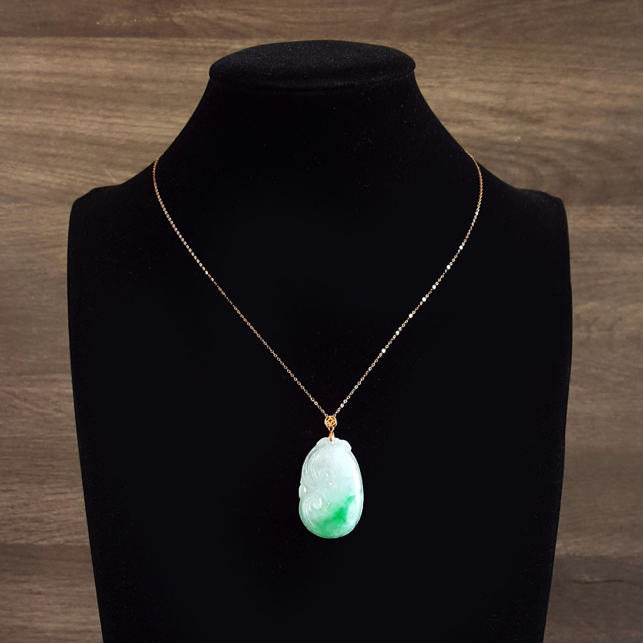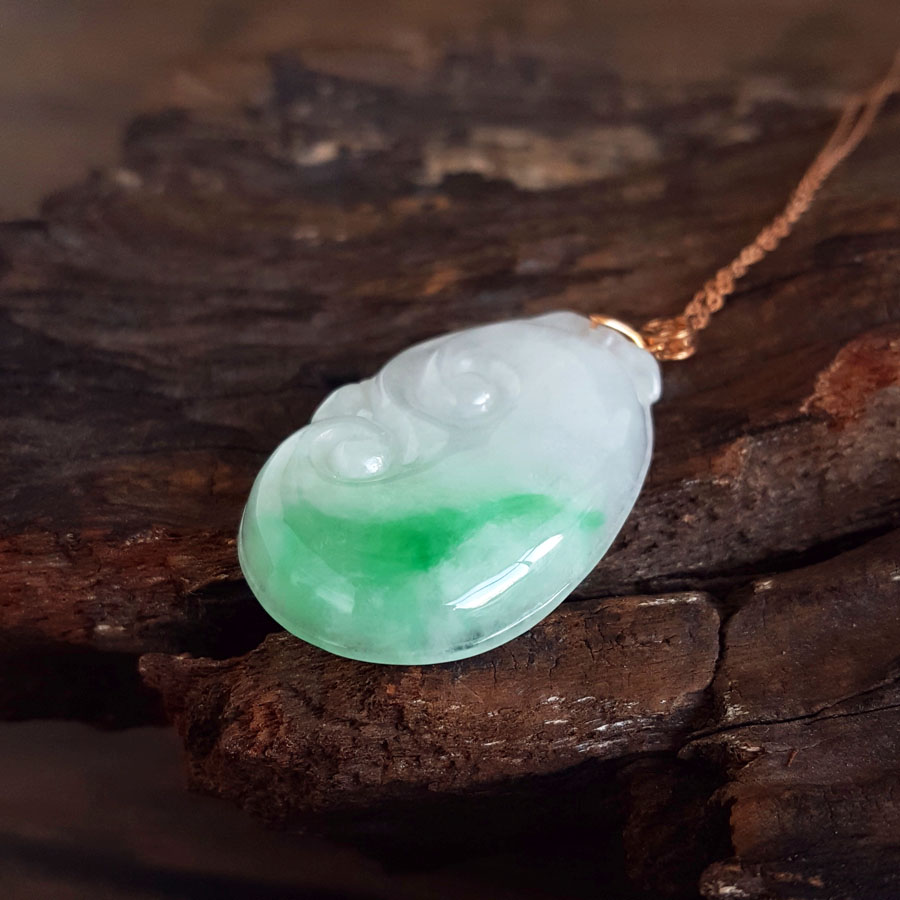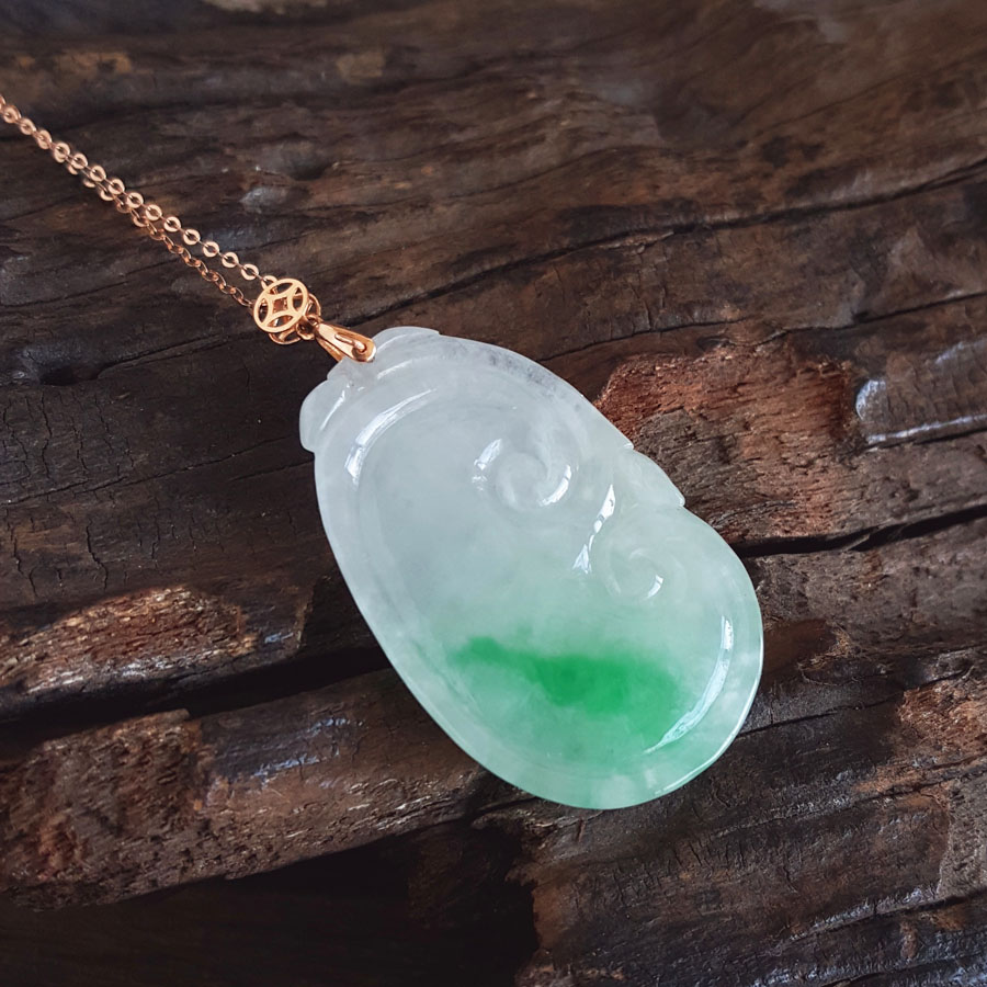名称 | AU750玫瑰金镶天然细腻糯冰种飘辣阳绿如意(万事如意)翡翠吊坠项链 |