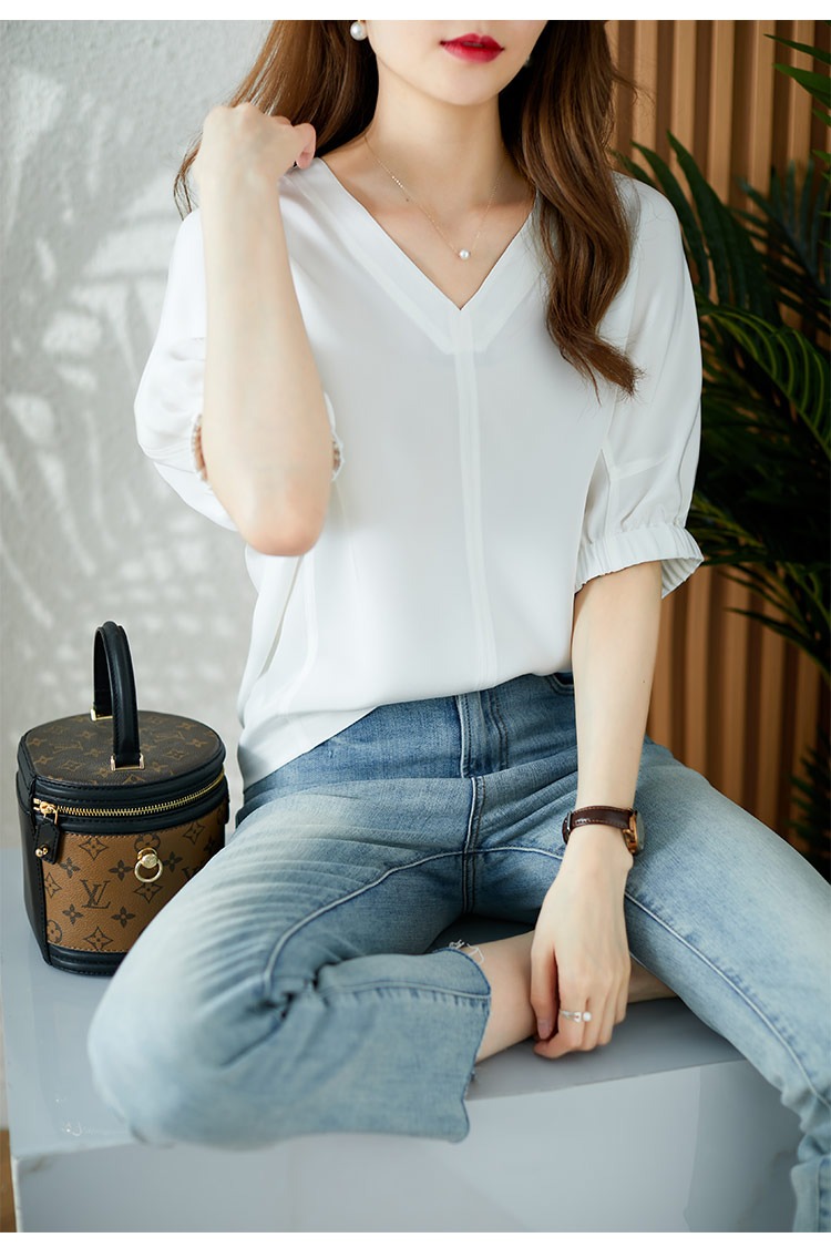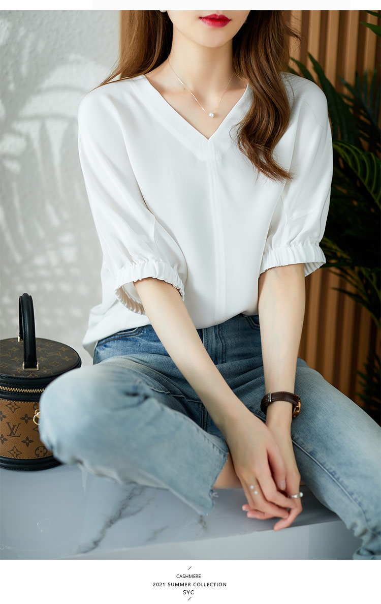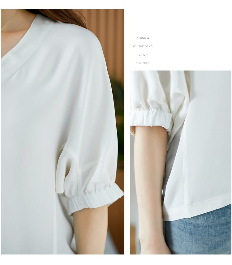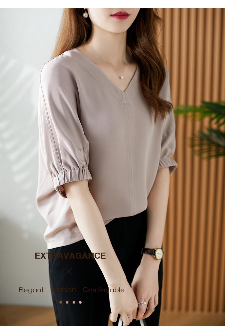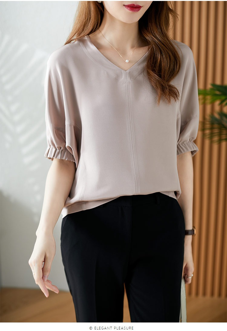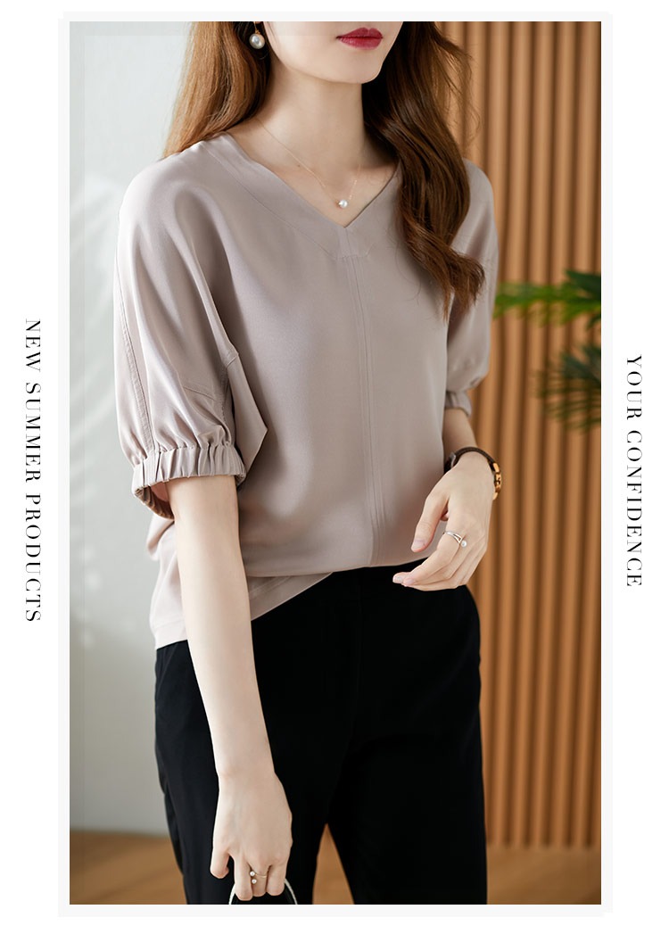 YX【现货7天】FSW优雅气质v领短袖T恤设计感灯笼袖休闲上衣