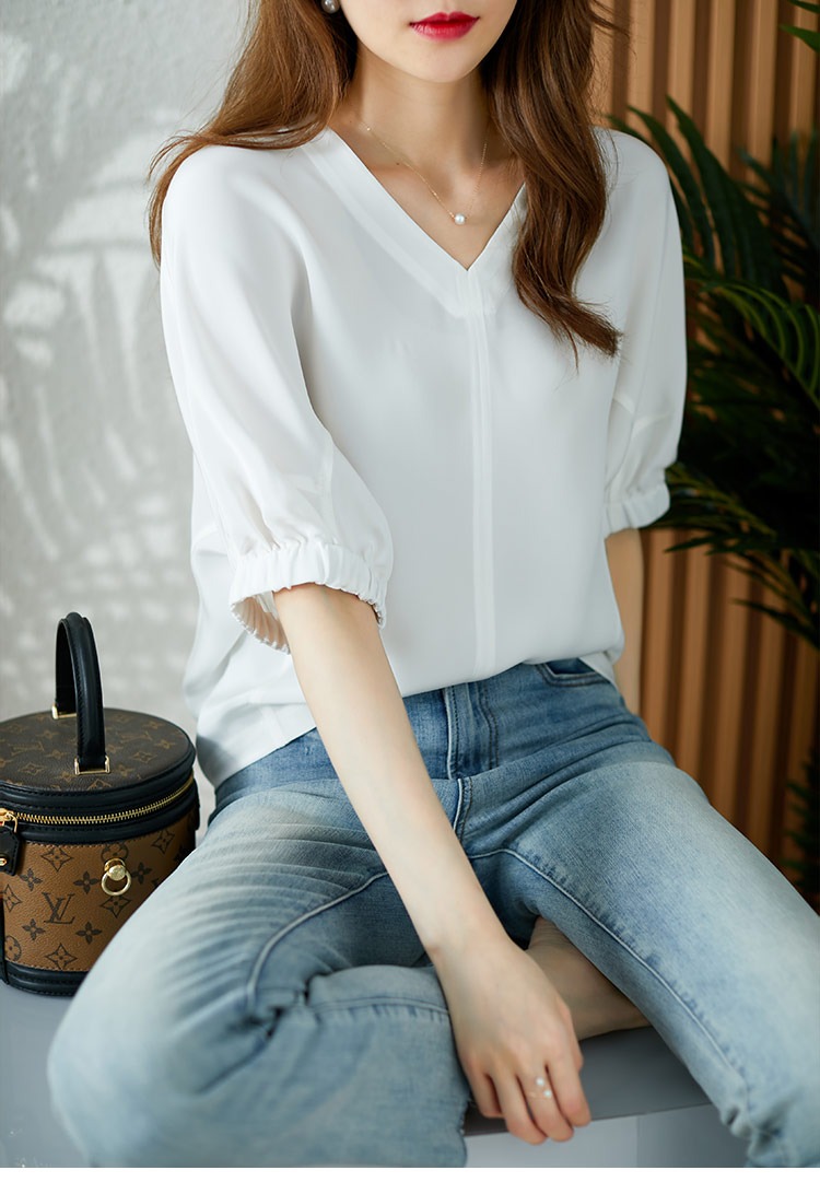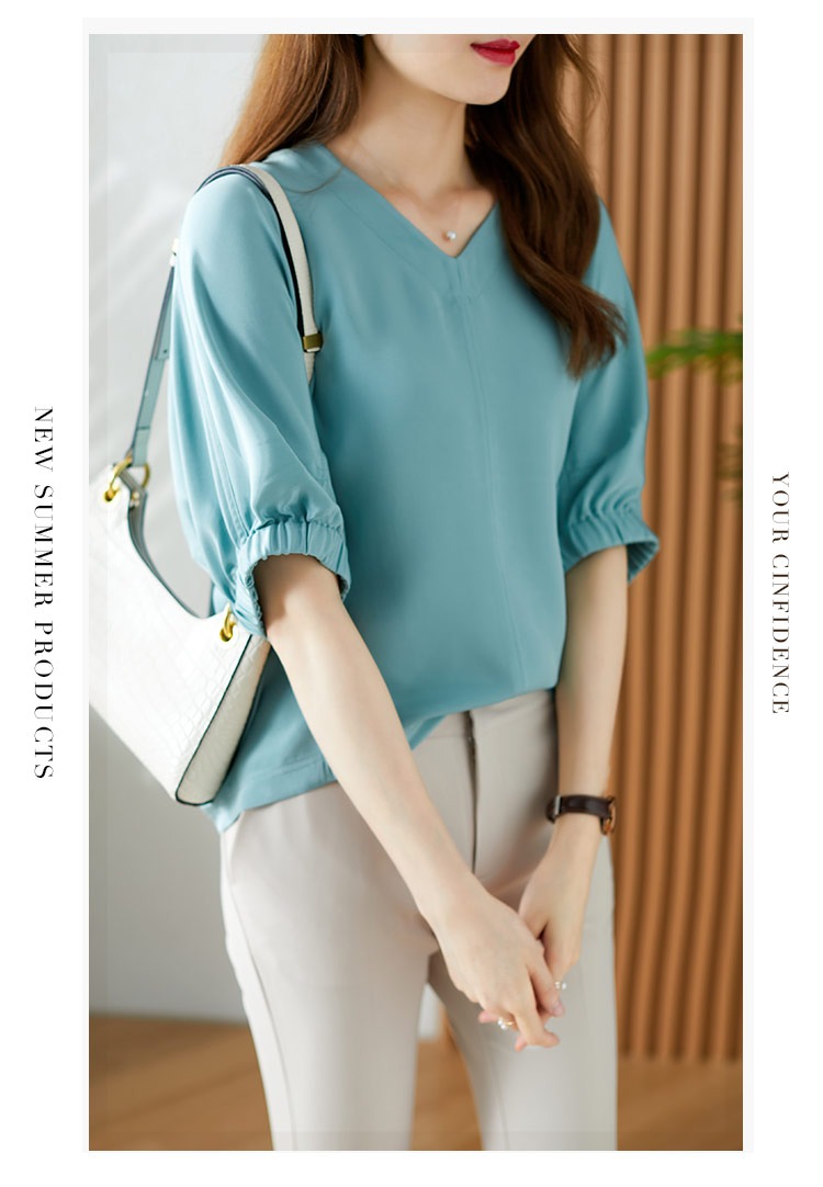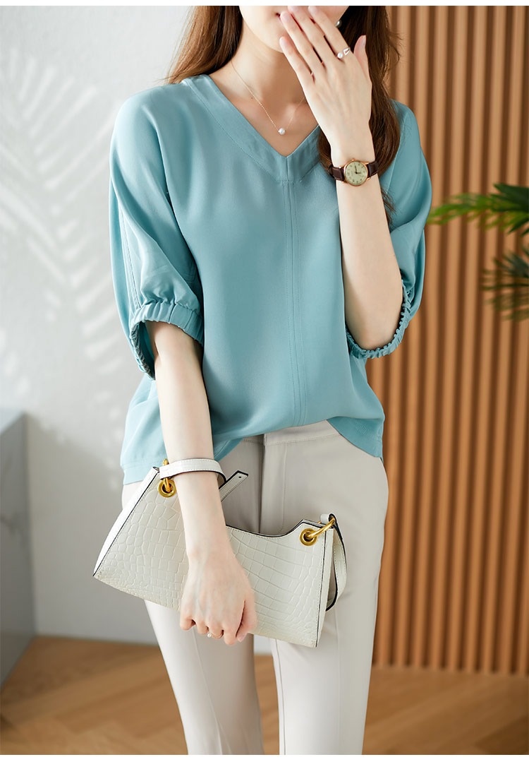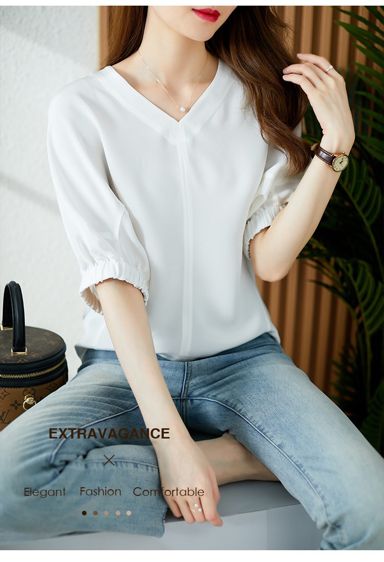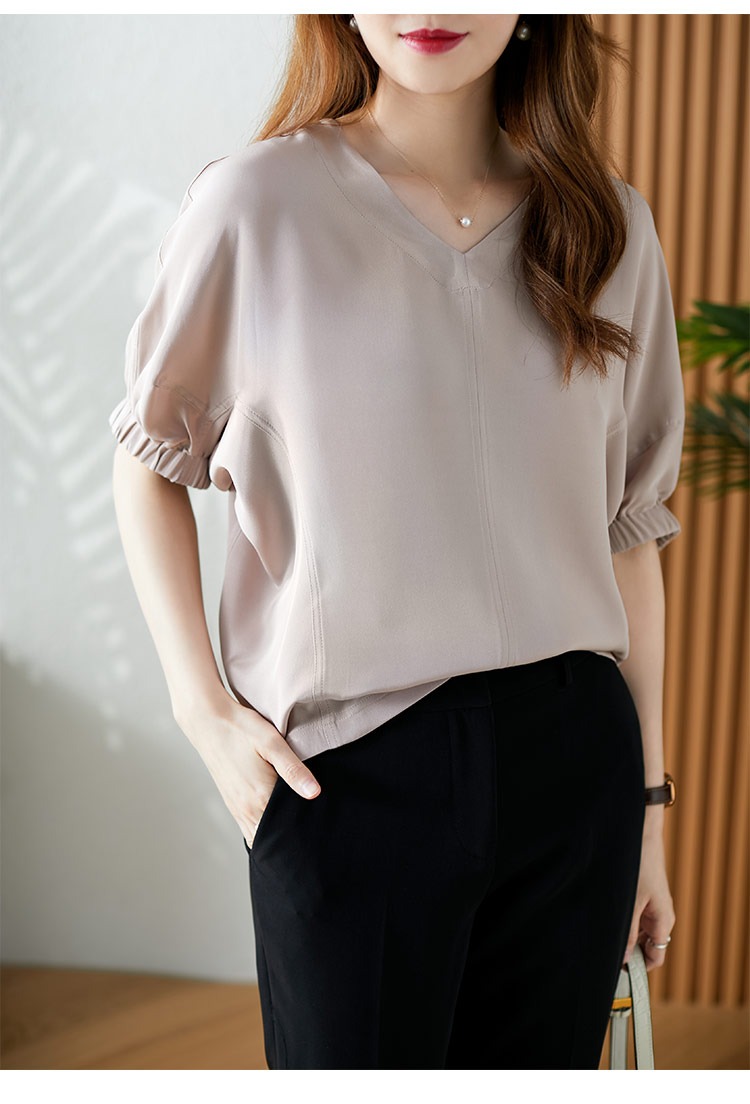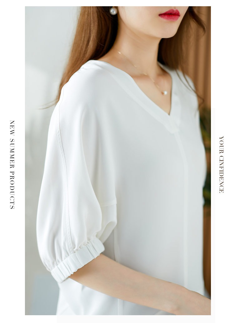 YX【现货7天】FSW优雅气质v领短袖T恤设计感灯笼袖休闲上衣