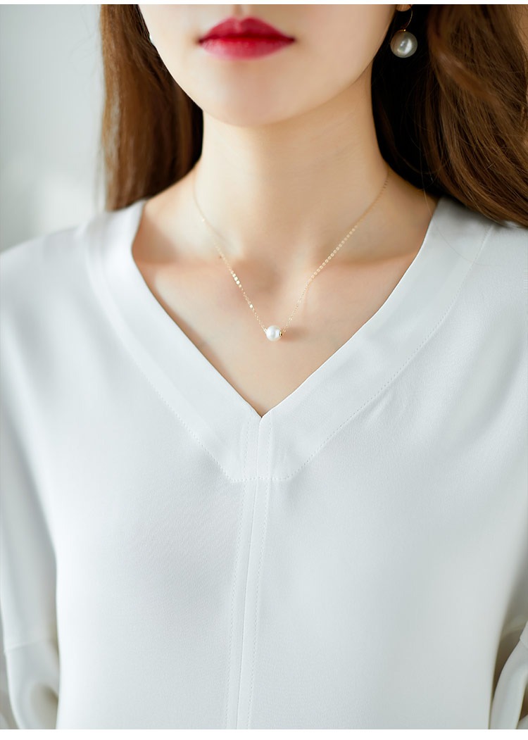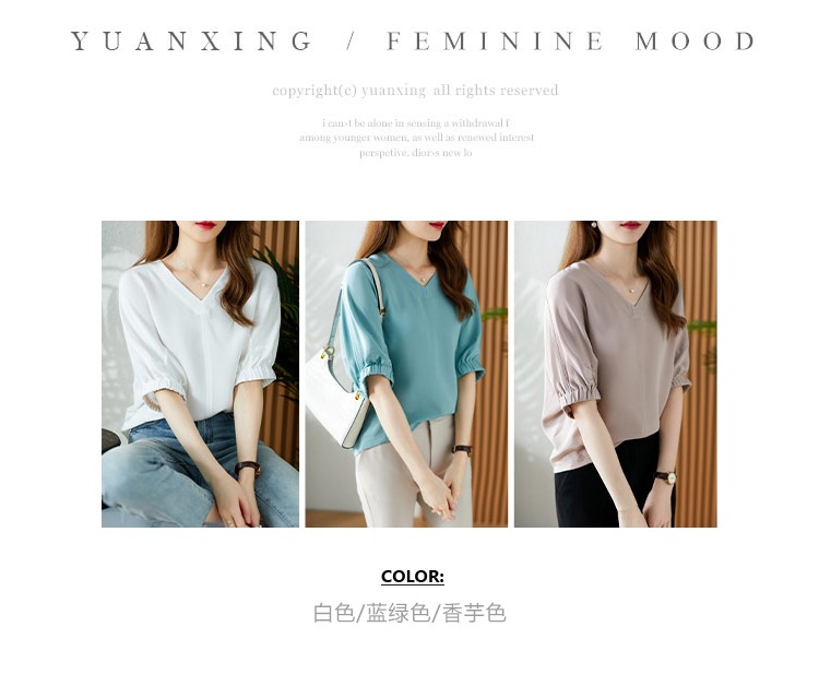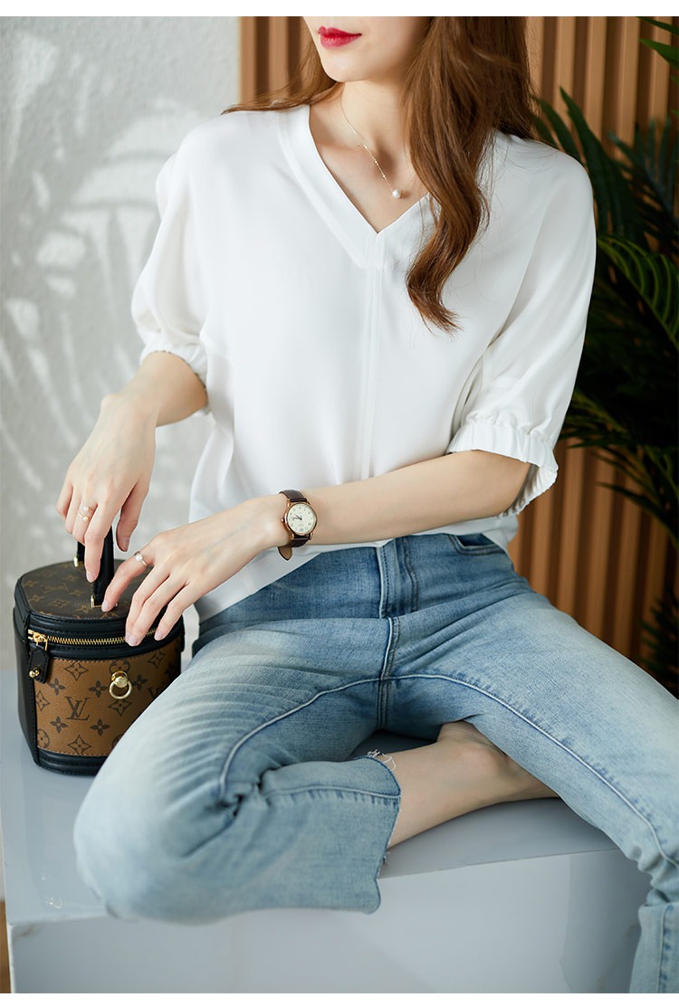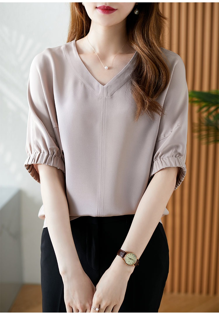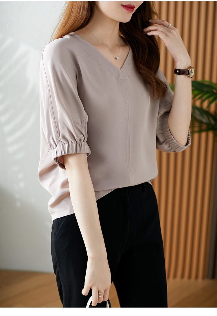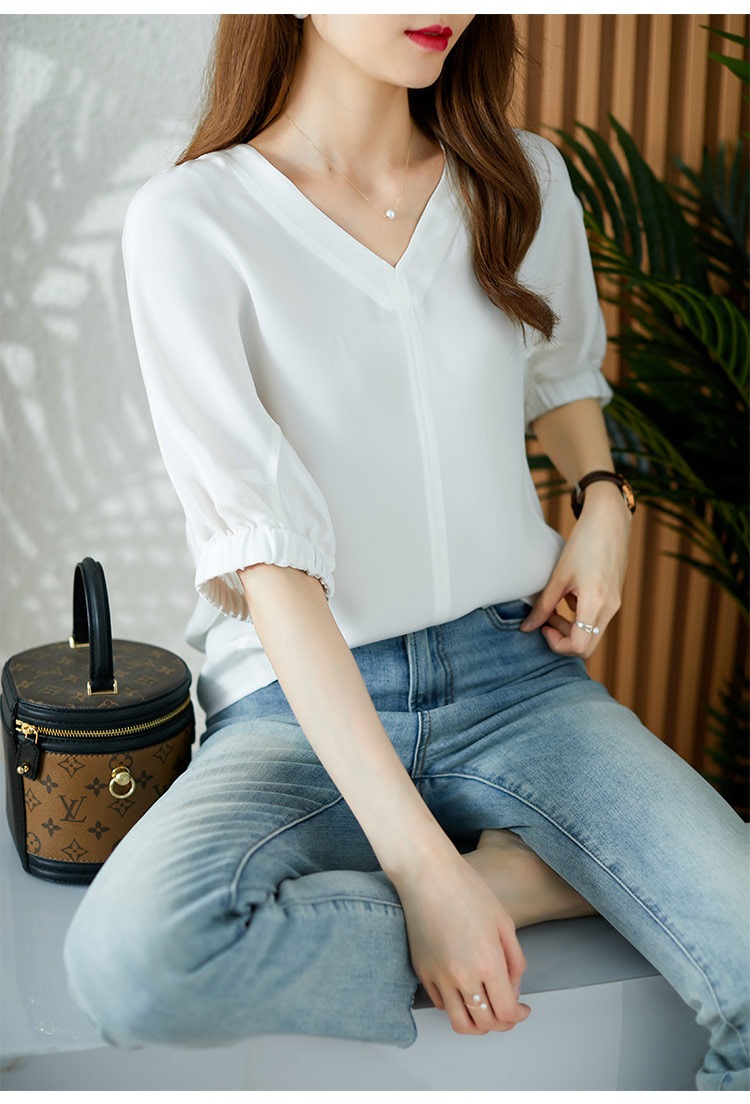 YX【现货7天】FSW优雅气质v领短袖T恤设计感灯笼袖休闲上衣