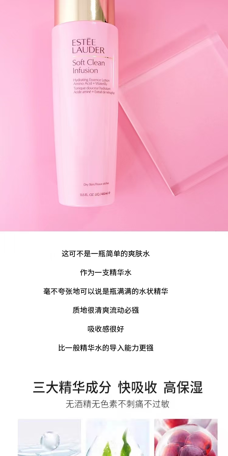 雅诗兰黛粉水,一瓶嫩•亮•滑,保湿力MAX,蕴含深层补水透明质酸钠和碳酰胺两大高渗透保湿精华,为肌肤注入源源水力,长效锁水海藻糖形成水分保护膜,持久水润在线,肌肤柔嫩饱满。