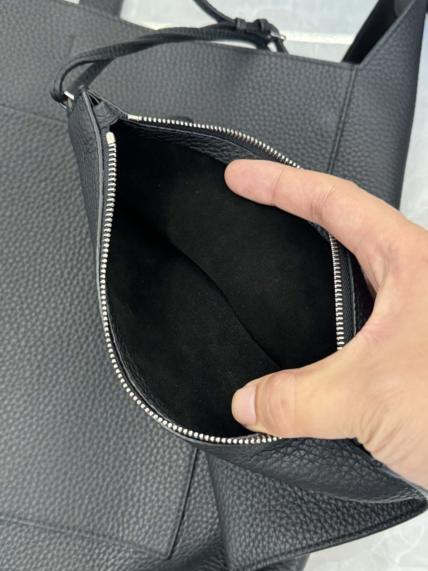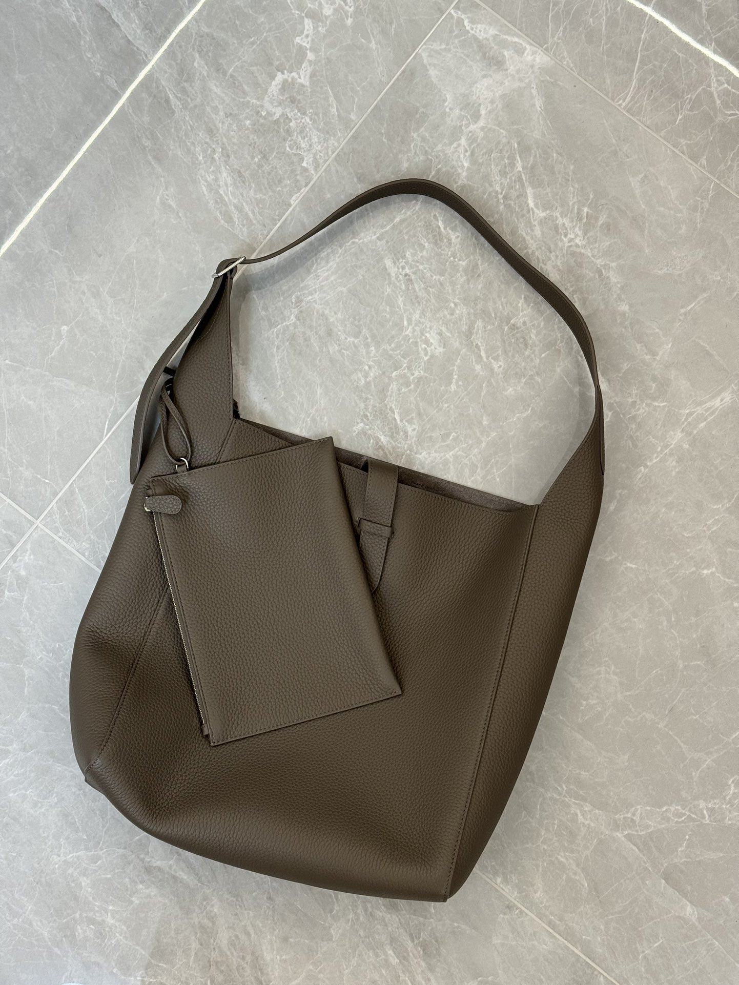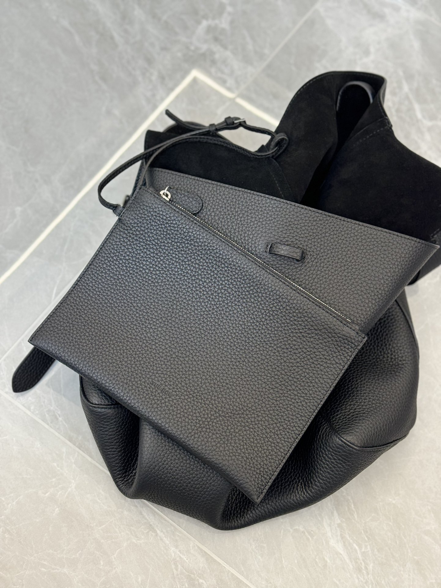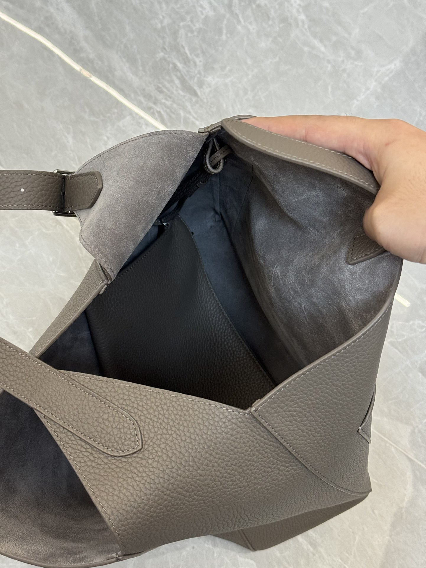 子母袋款式,内里有一个可拆卸的拉链袋,结构简单没有多余的五金点缀,包身是意大利产小牛皮,内里也是反绒和大手提同款皮料