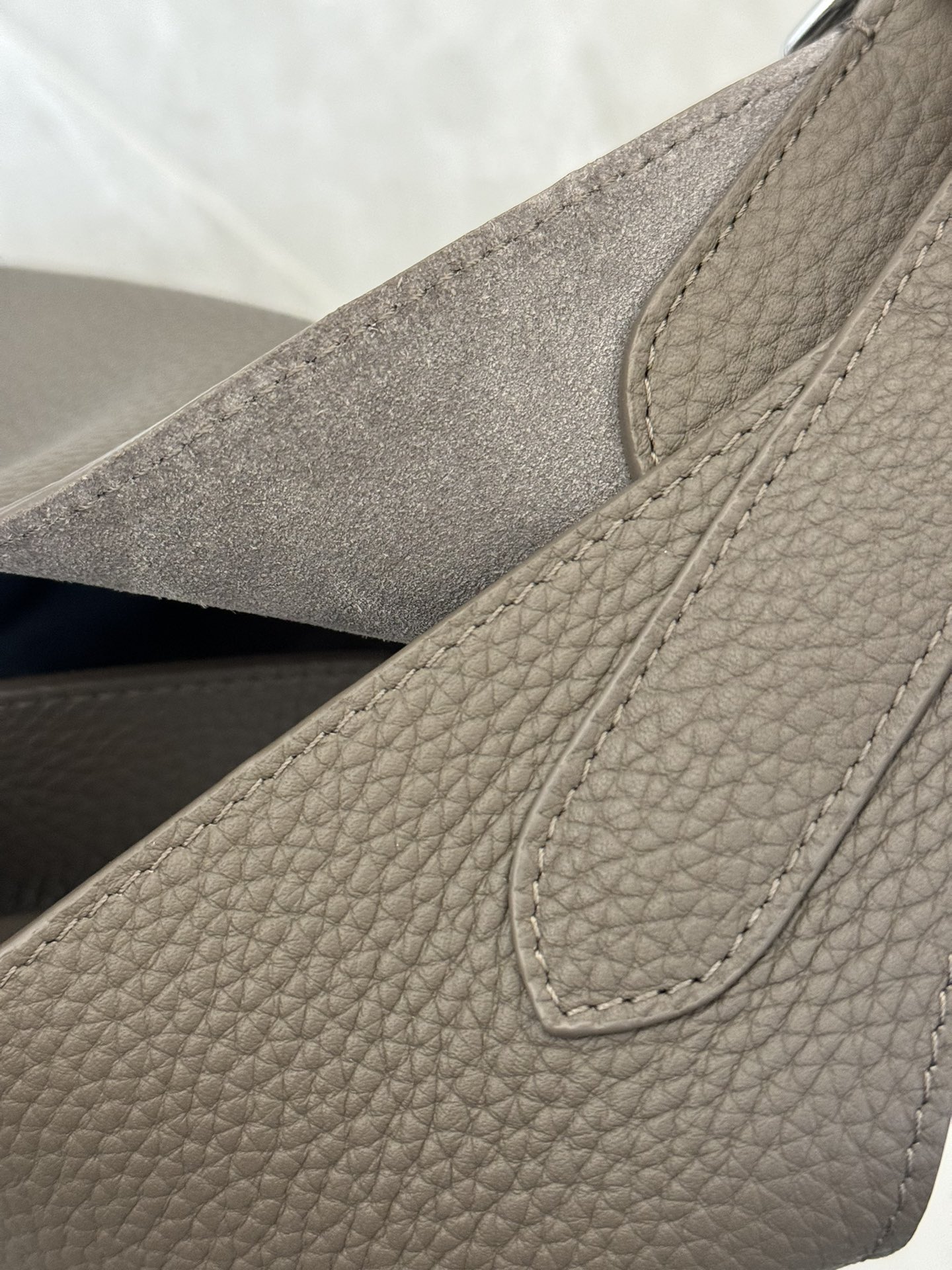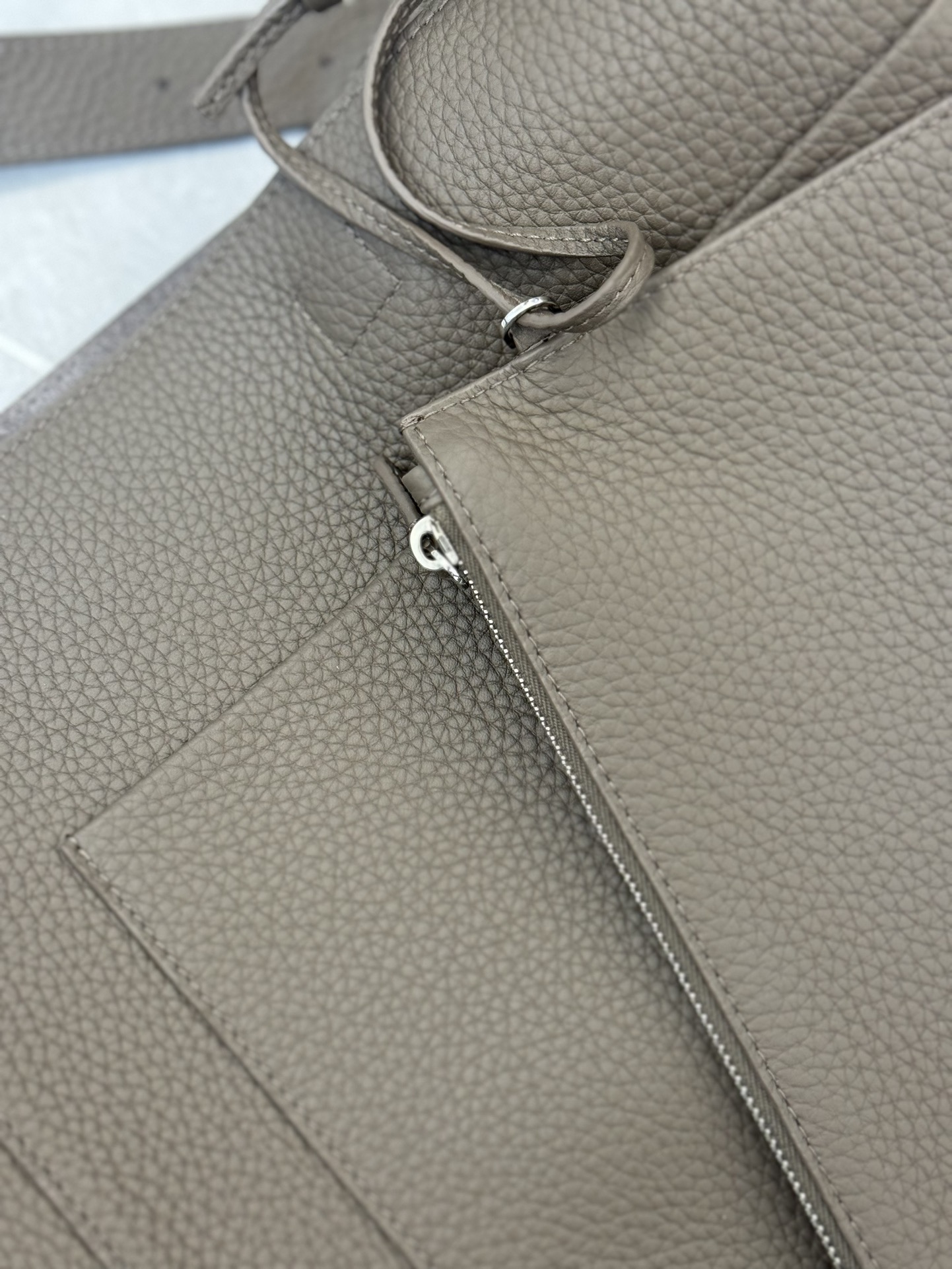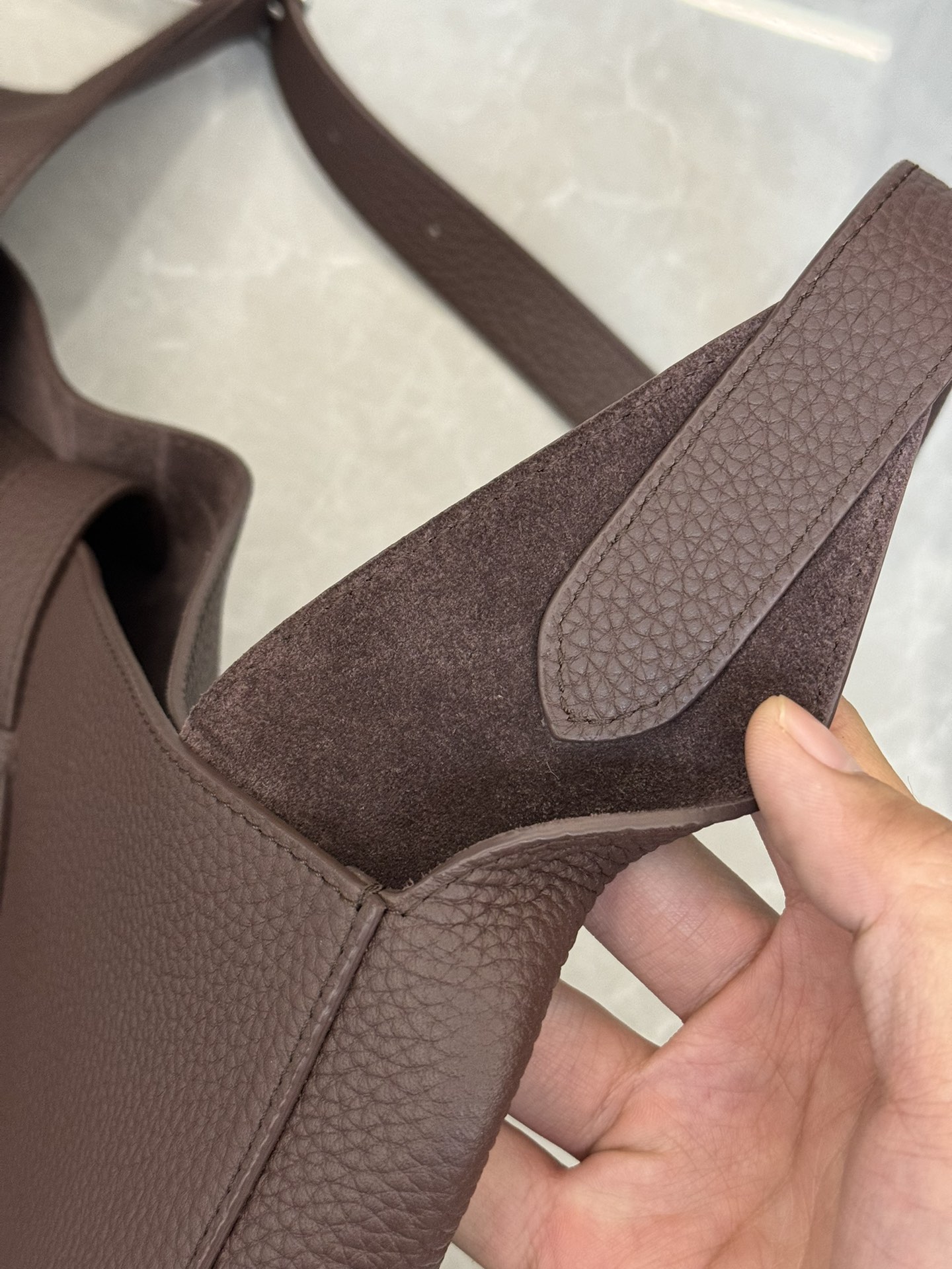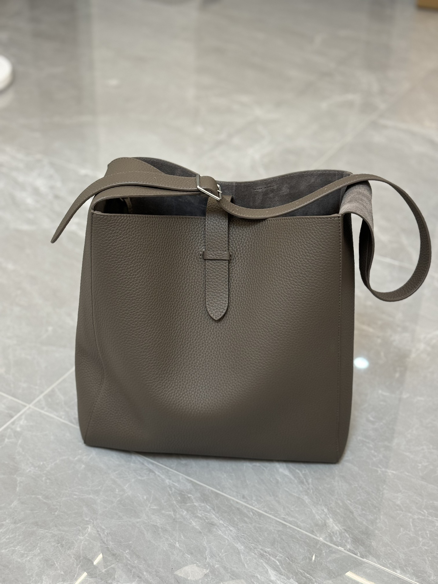 子母袋款式,内里有一个可拆卸的拉链袋,结构简单没有多余的五金点缀,包身是意大利产小牛皮,内里也是反绒和大手提同款皮料