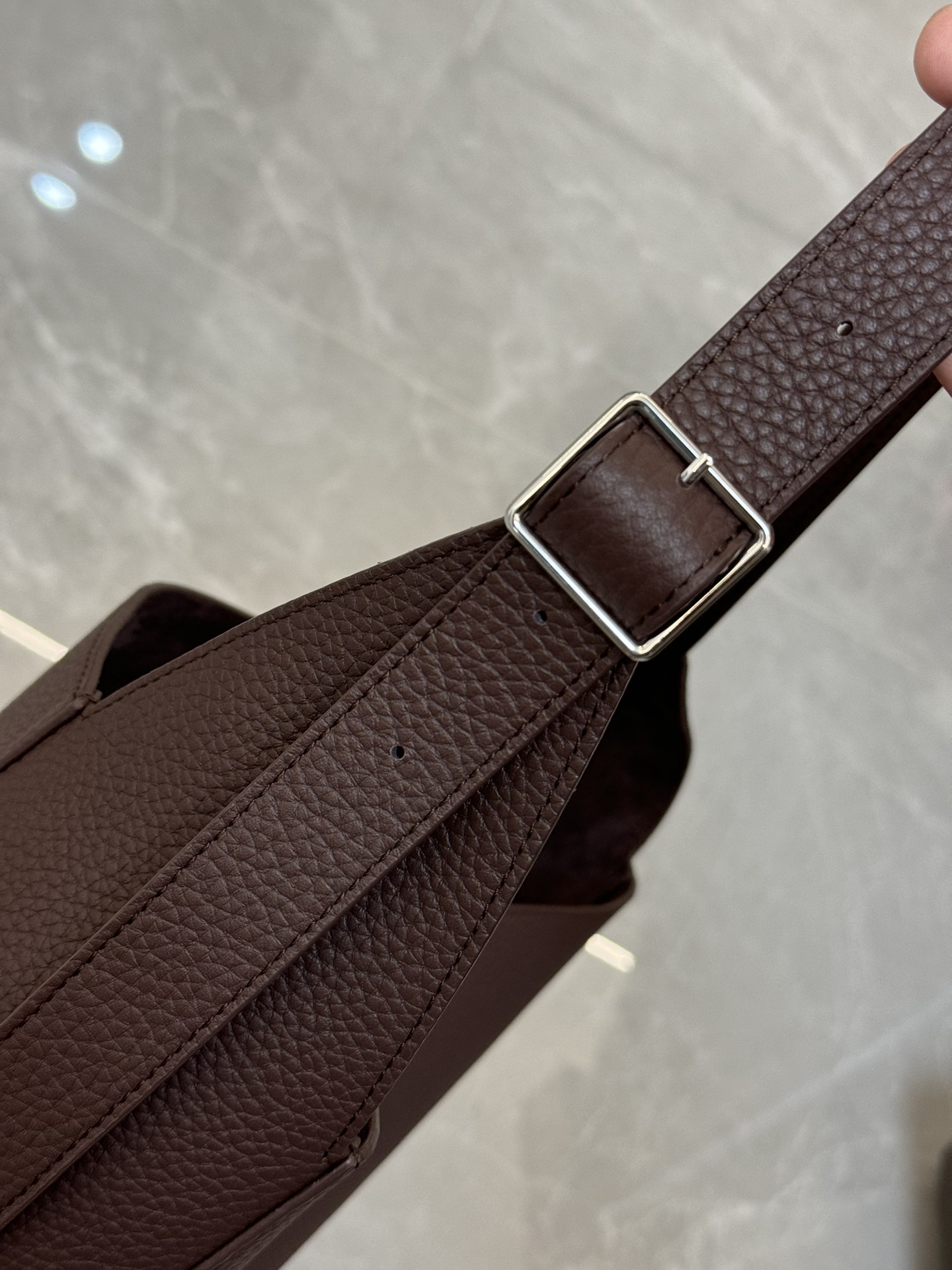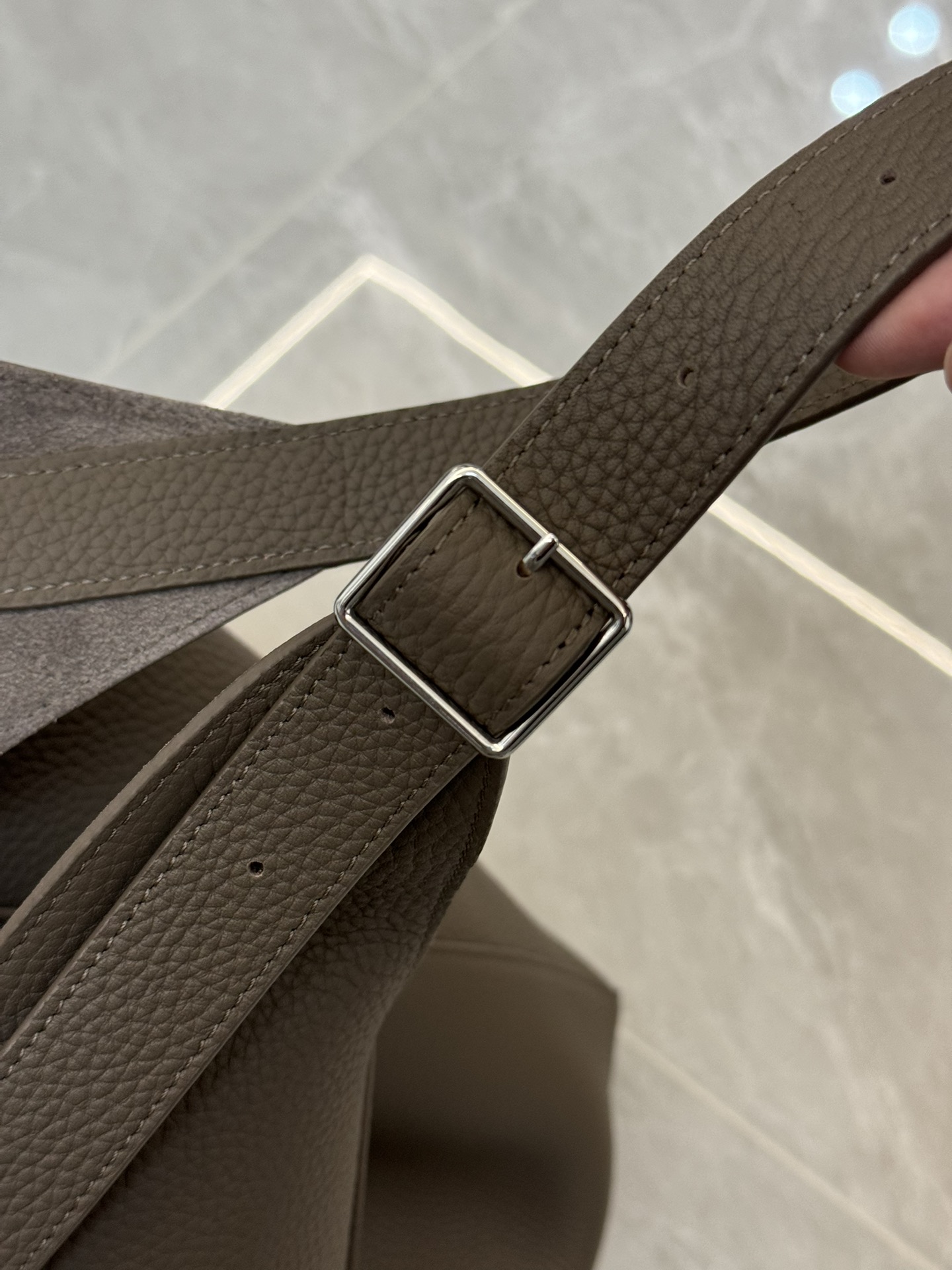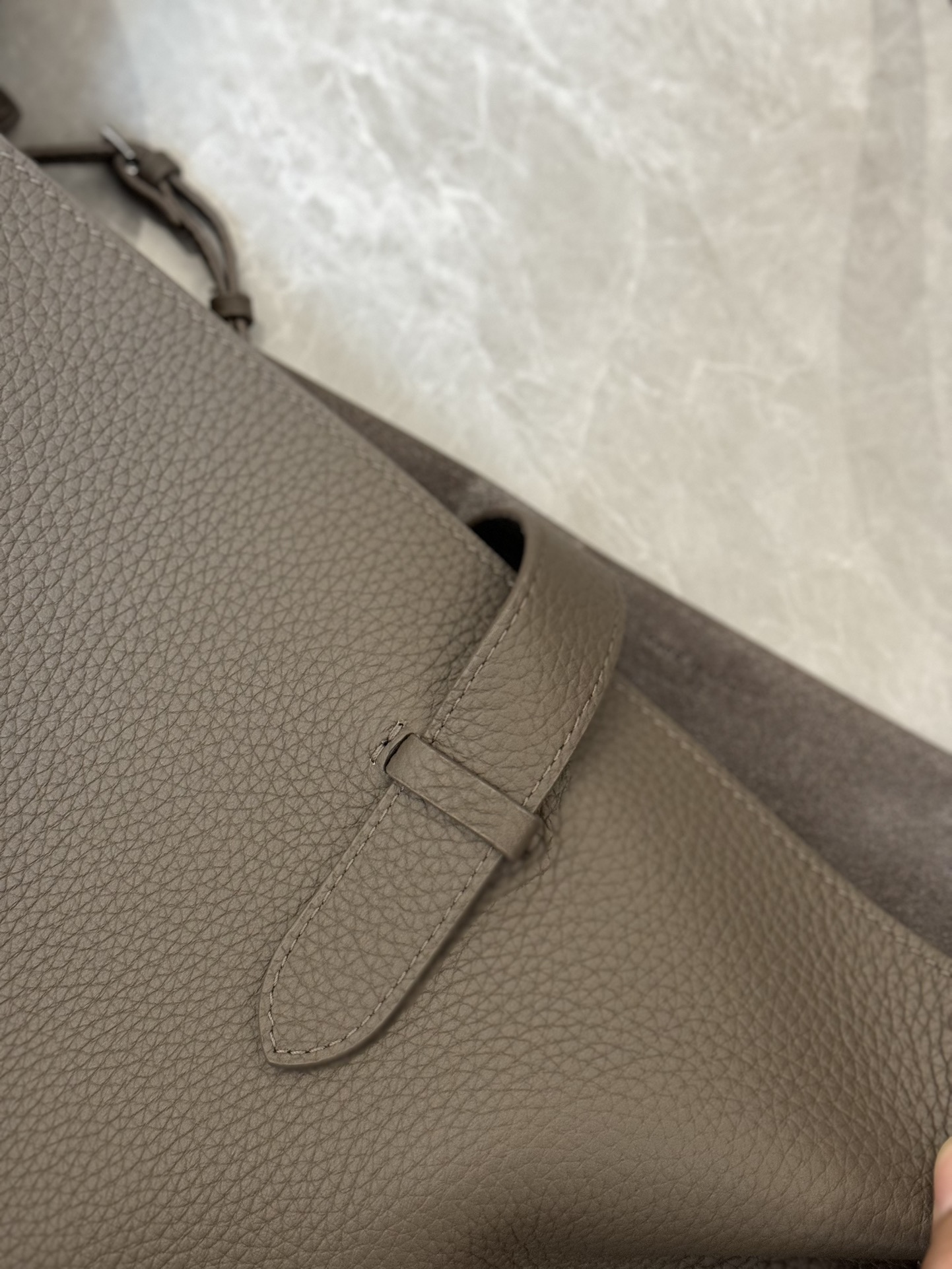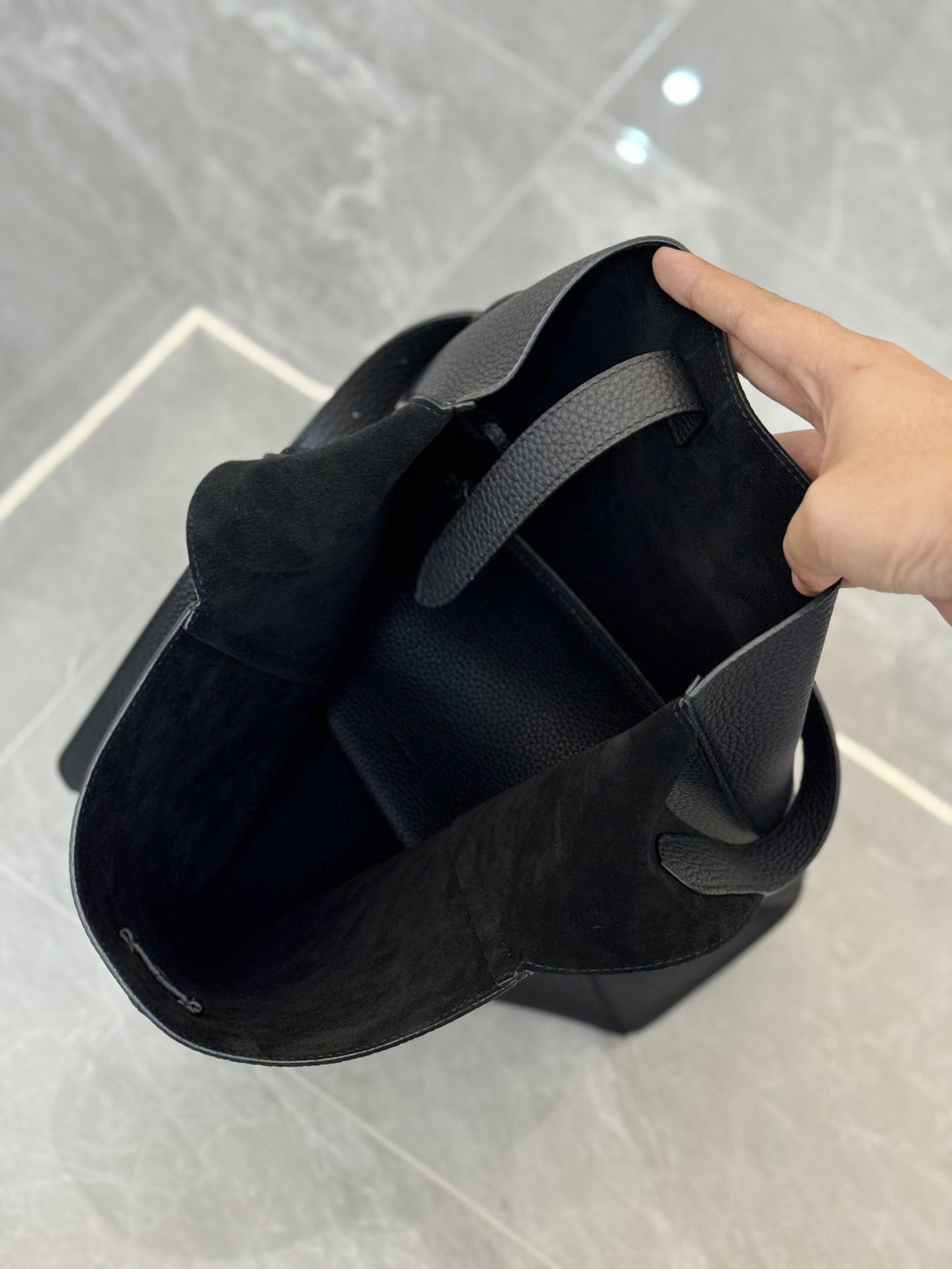 子母袋款式,内里有一个可拆卸的拉链袋,结构简单没有多余的五金点缀,包身是意大利产小牛皮,内里也是反绒和大手提同款皮料