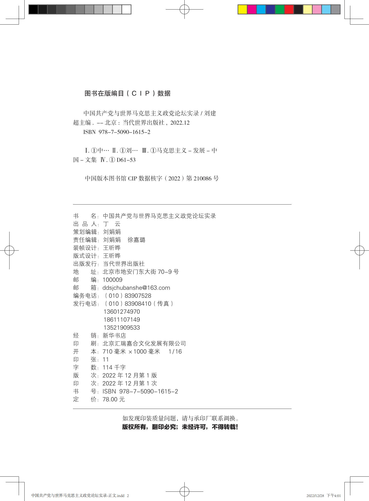 2022年7月,中共中央对外联络部以视频方式举办中国共产党与世界马克思主义政党论坛,论坛主题为“二十一世纪马克思主义本土化时代化”。来自70多个国家100多个马克思主义政党、左翼政党和政治组织的代表共300多人线上参会。为反映此次论坛的情况,本书由中联部部长刘建超主编,分为四个部分,包括“外国领导人致贺”“全体会议”“分论坛一”“分论坛二”,共收录外国领导人致贺3篇、发言35篇。