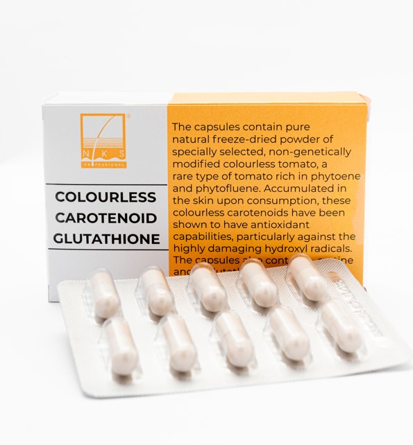 本品采用天然、非转基因无色番茄干粉,结合L-胱氨酸和L-谷胱甘肽,调节黑色素生成,帮助提亮、均匀肤色,并提供紫外线防护,减少光老化带来的肤色暗沉问题。