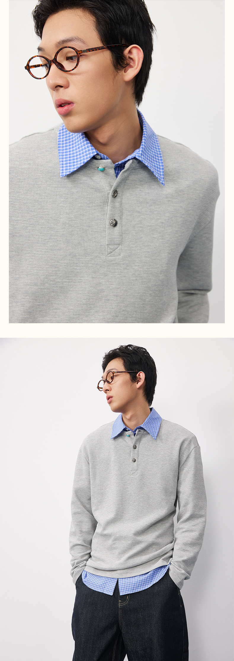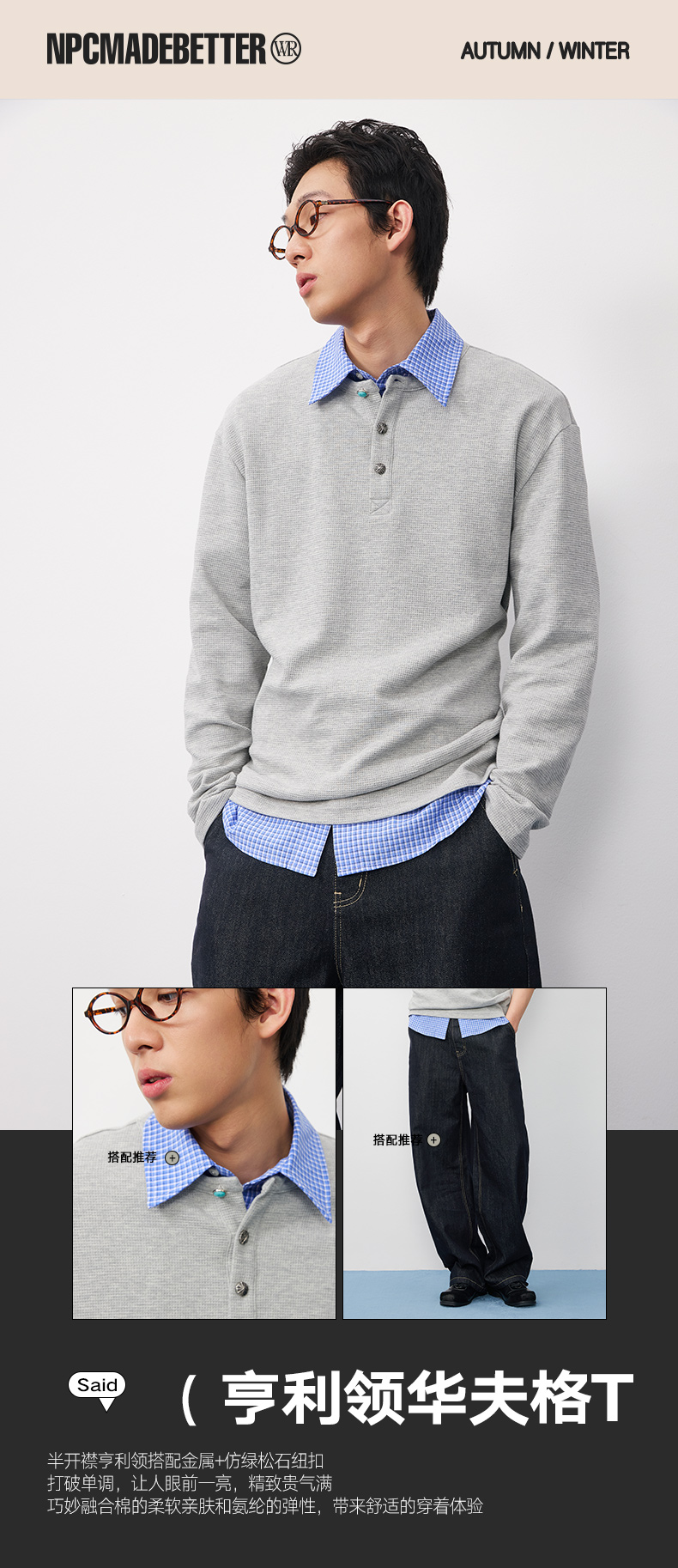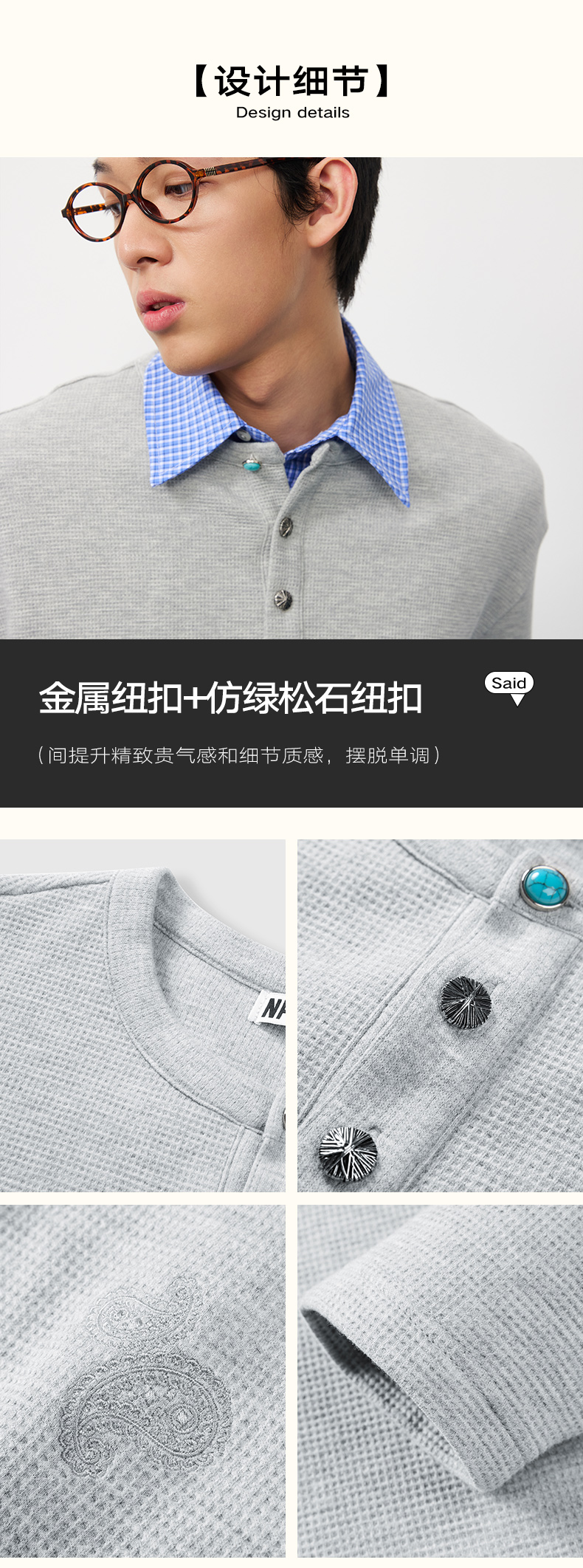 潮牌腰果花刺绣仿【绿松石】扣华夫格长袖T恤男亨利领NP58TL18