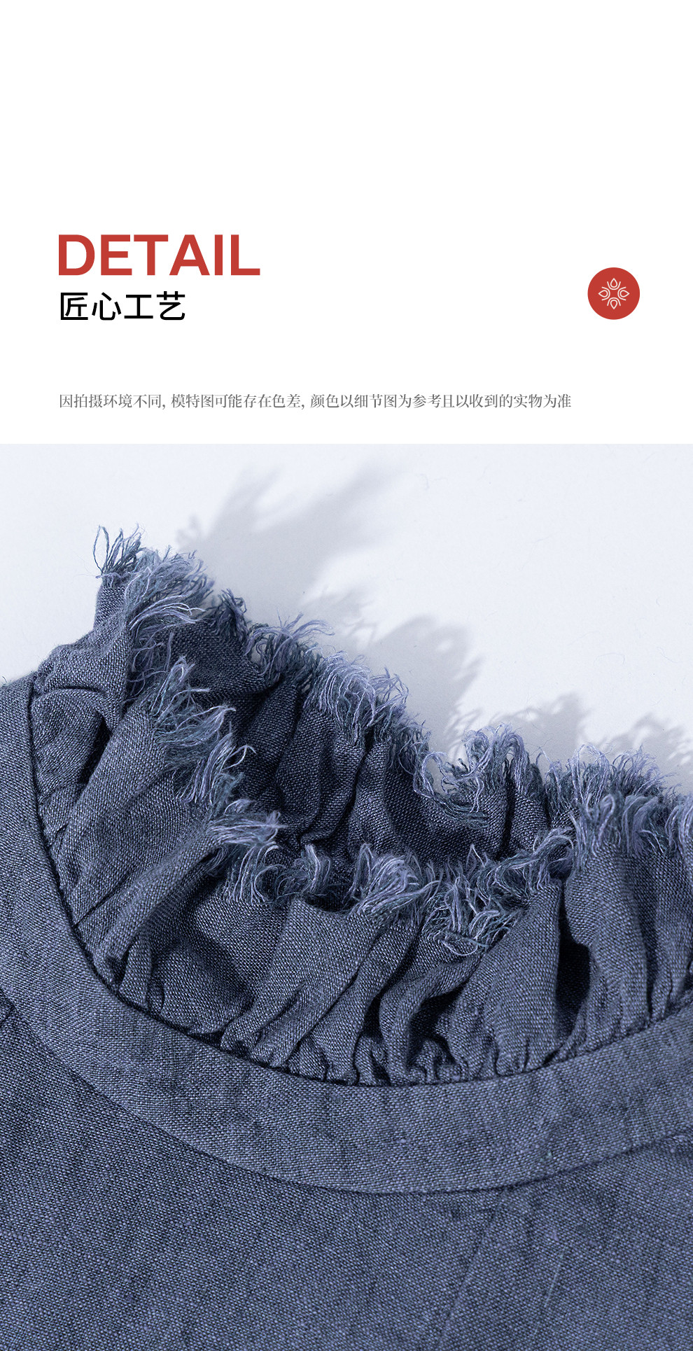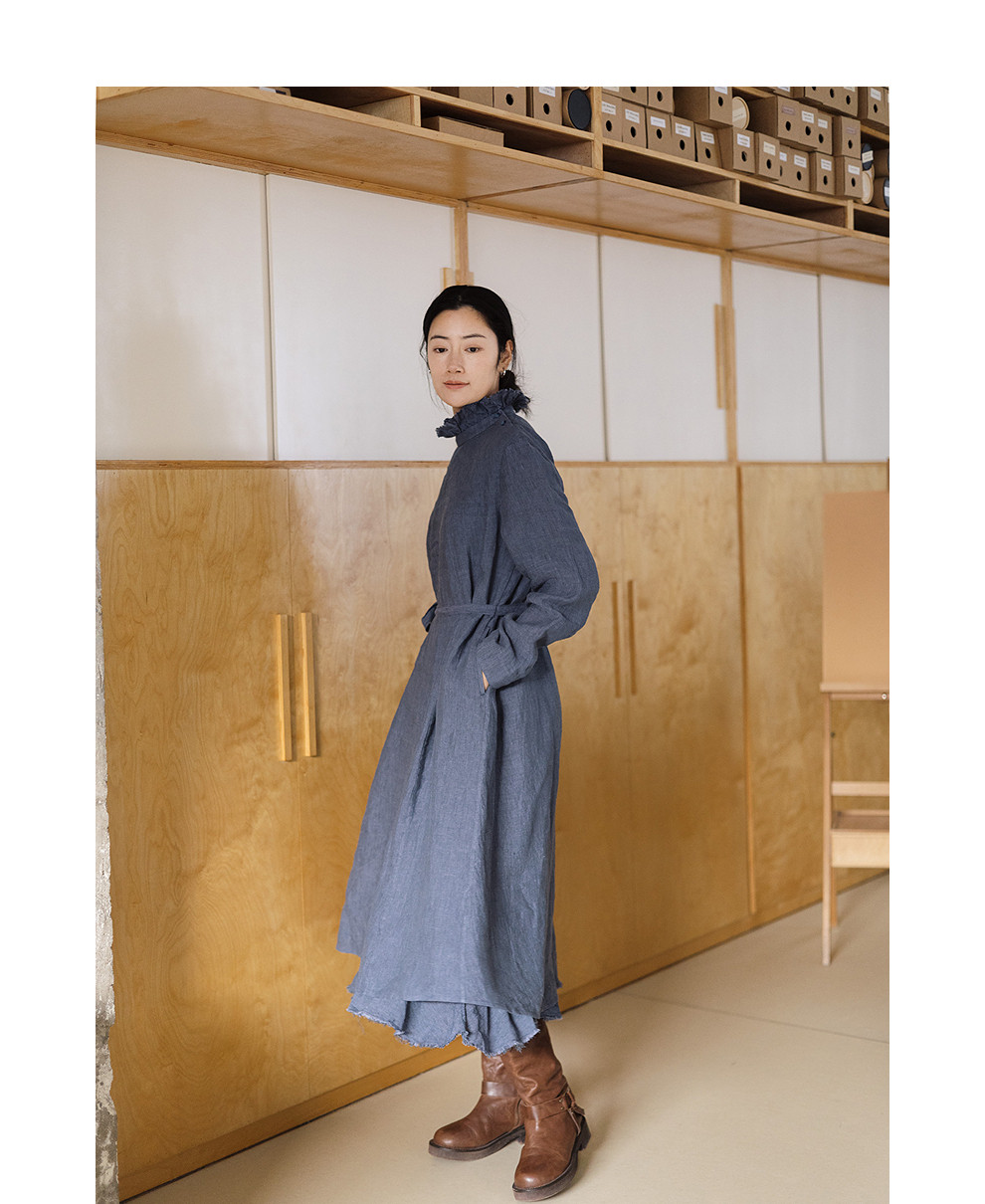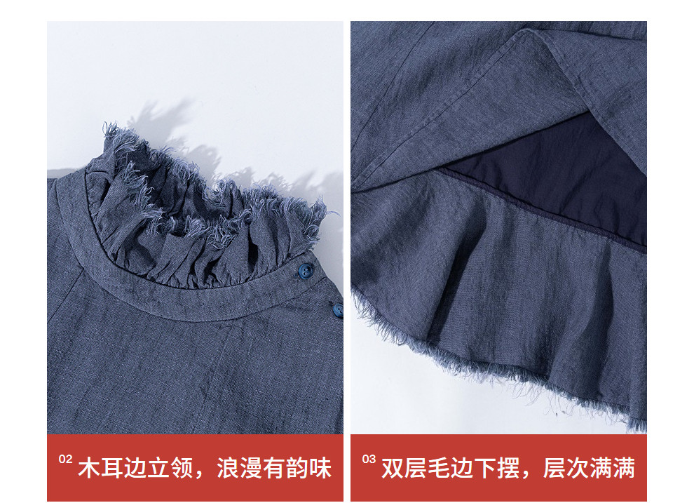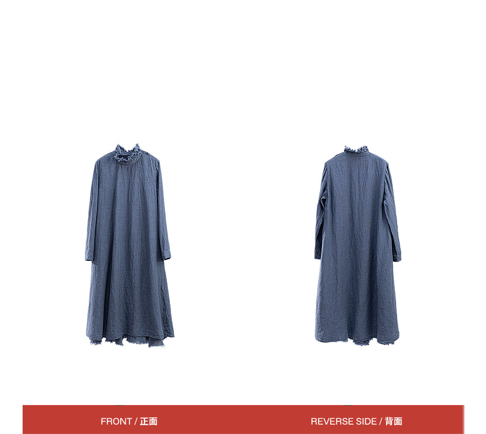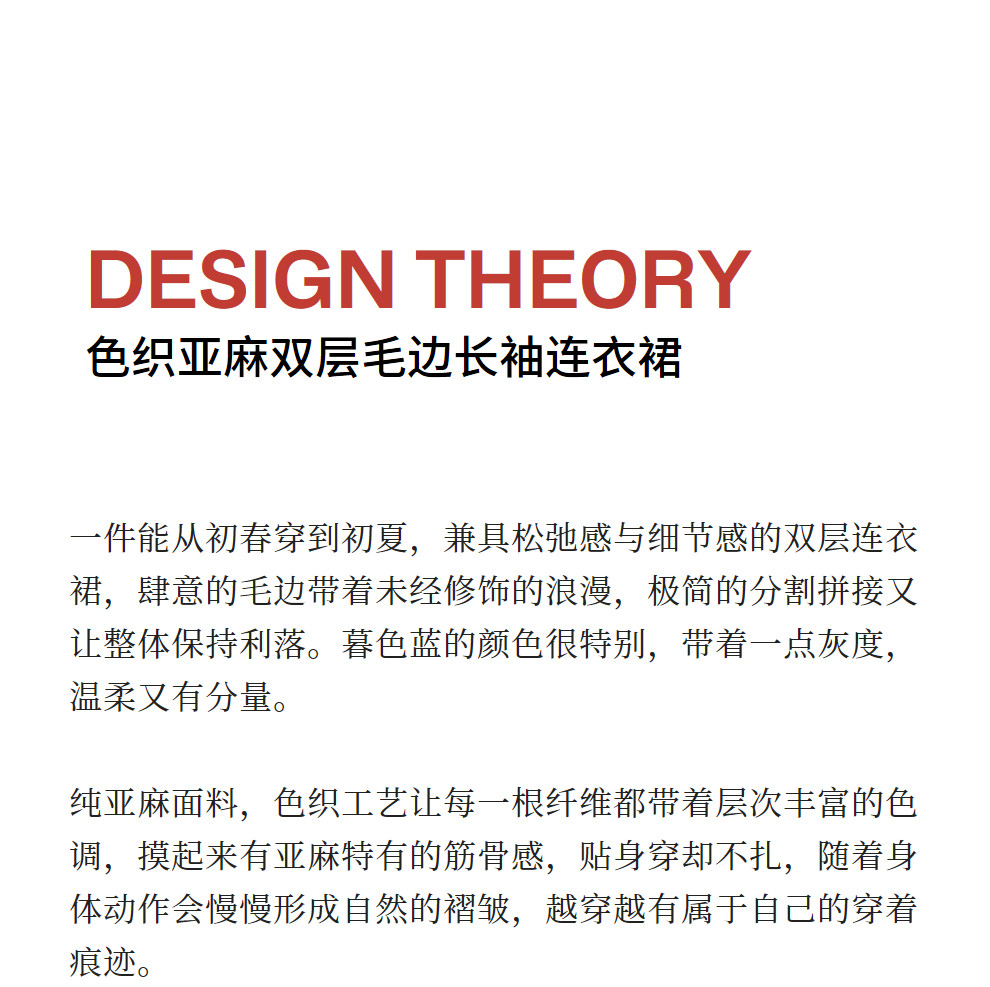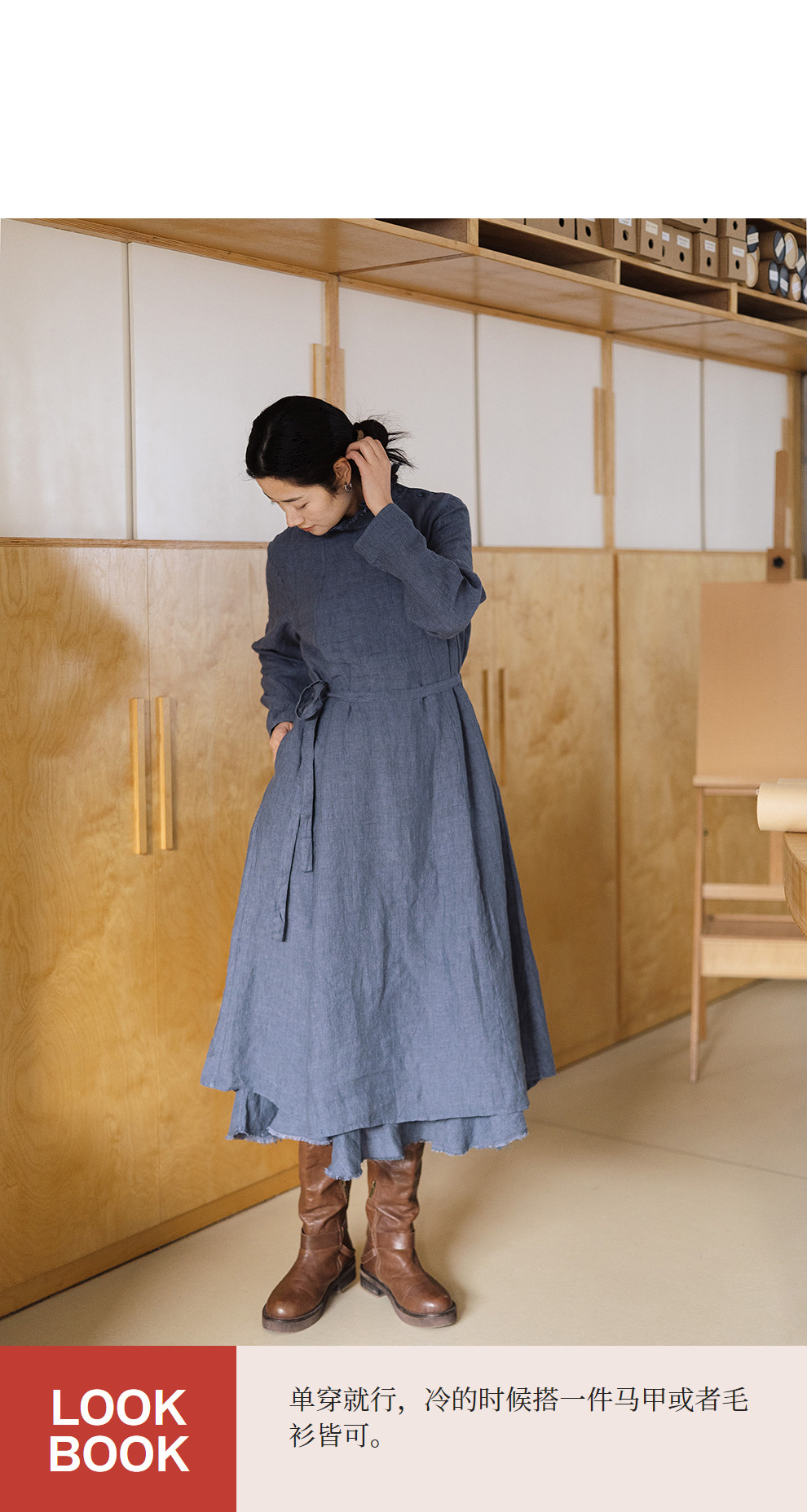 绽放049朵/色织亚麻双层毛边文艺长袖连衣裙女春季新款简约长裙子