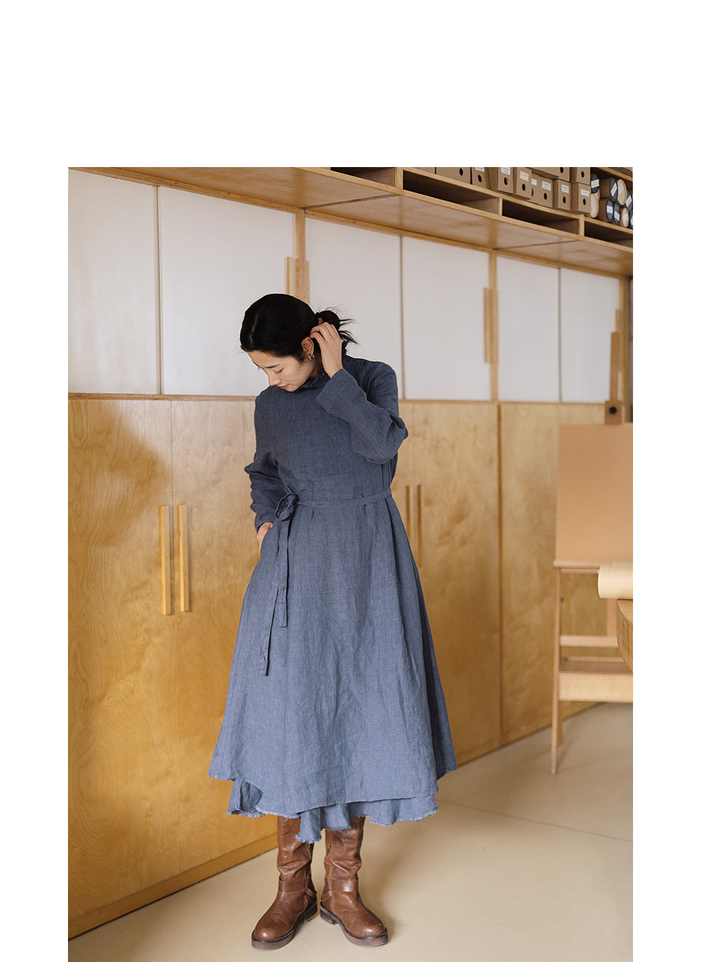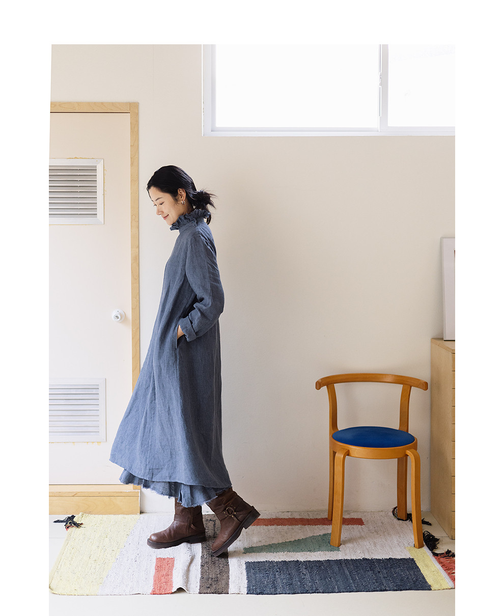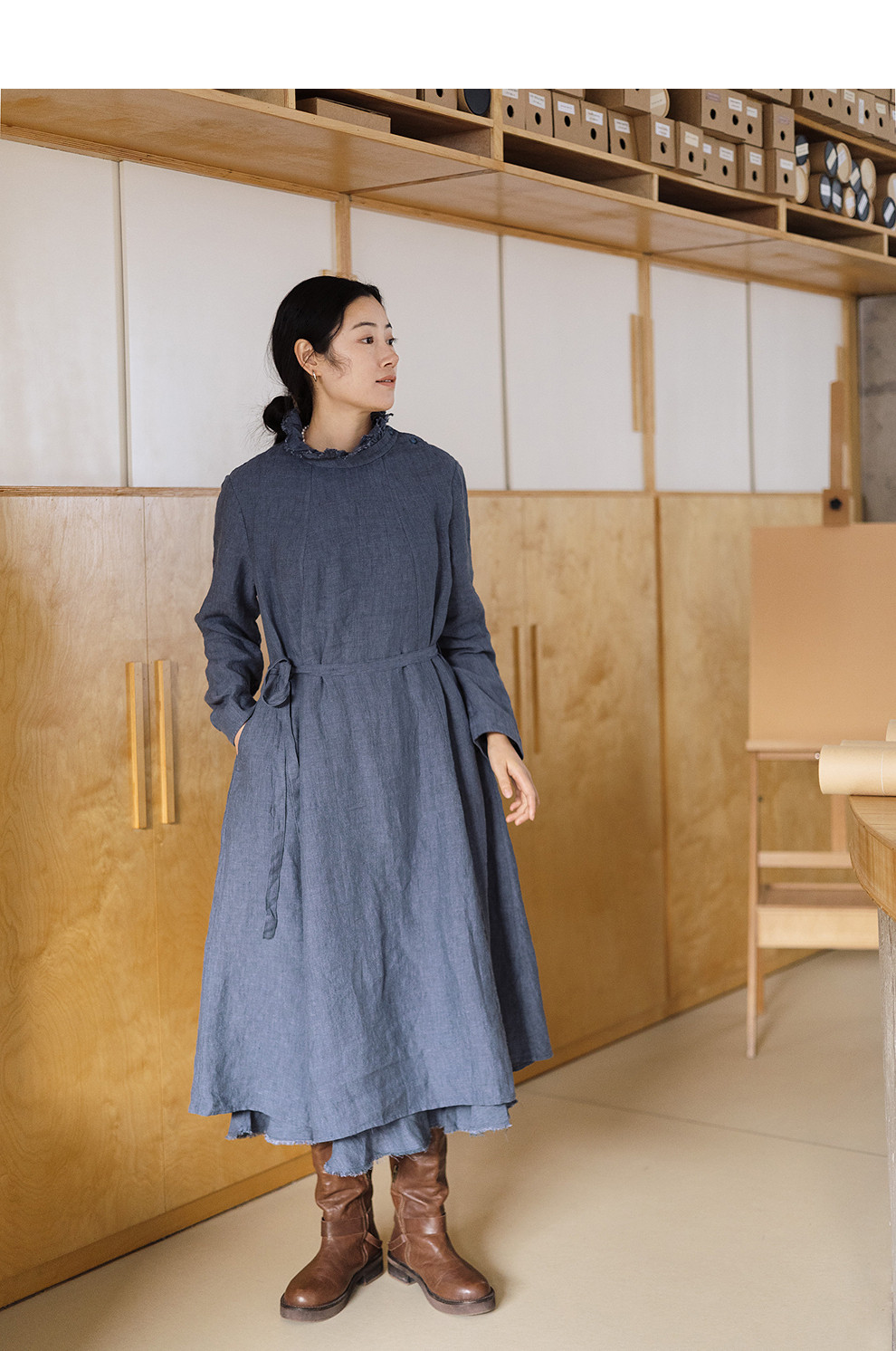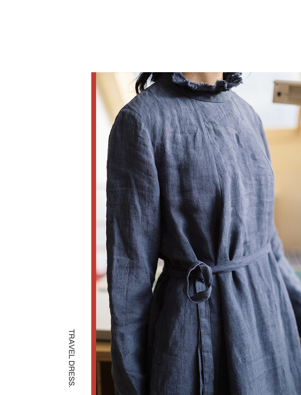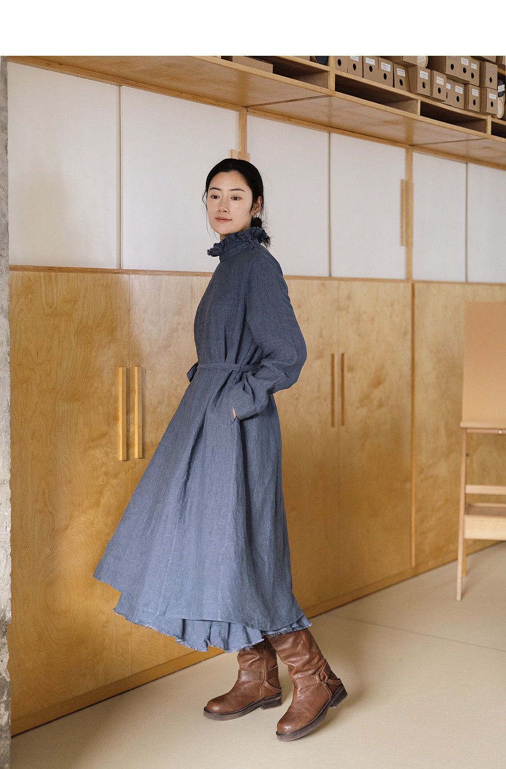 绽放049朵/色织亚麻双层毛边文艺长袖连衣裙女春季新款简约长裙子