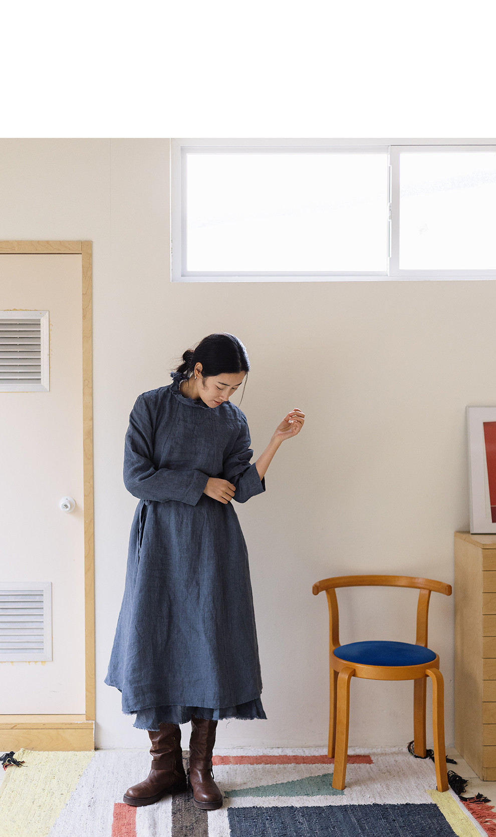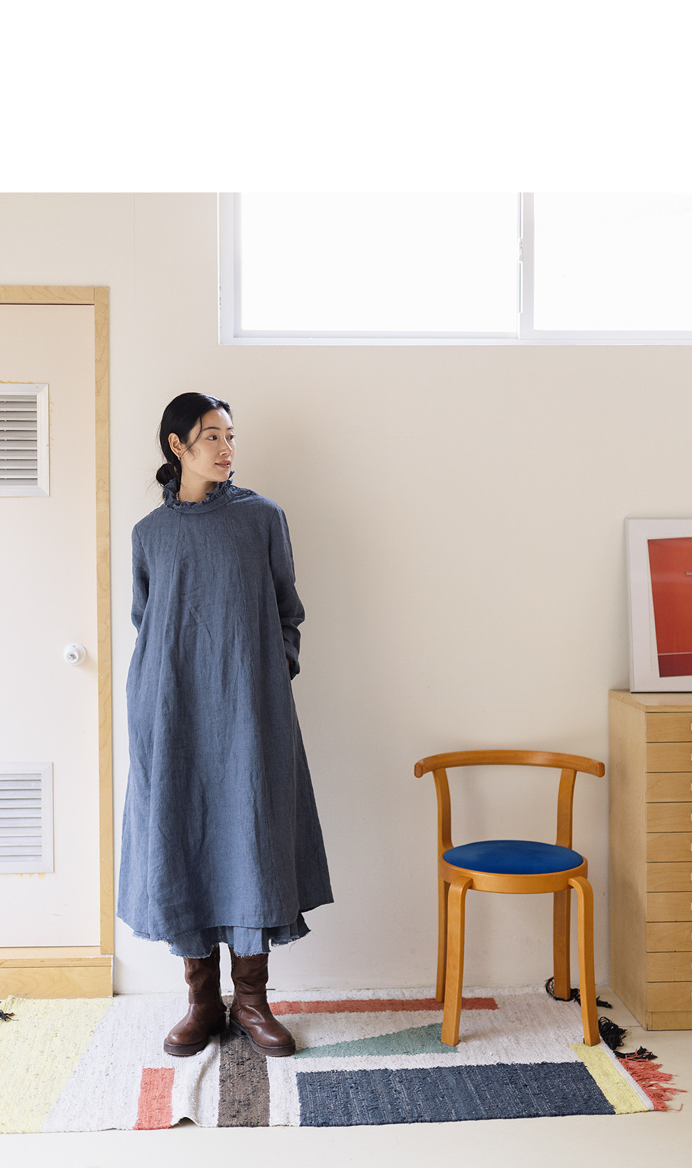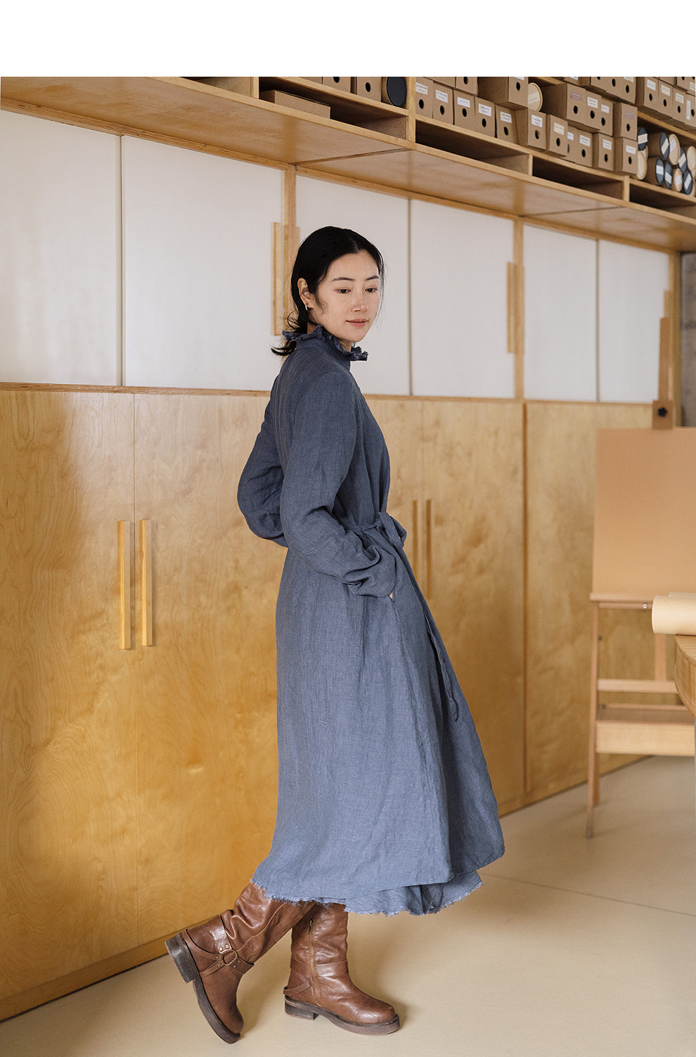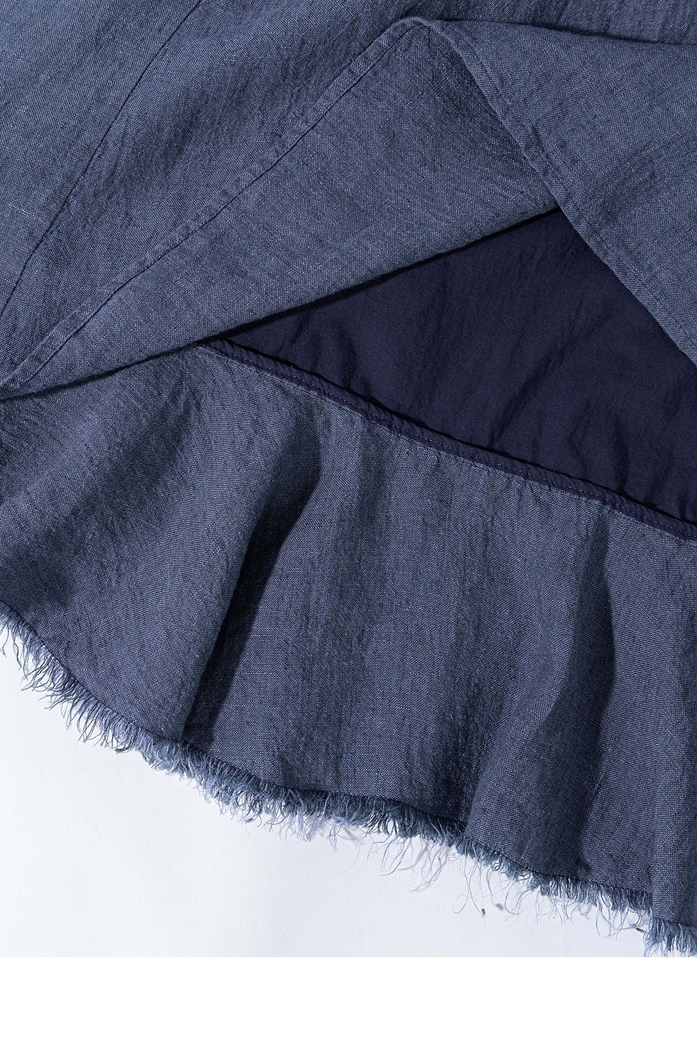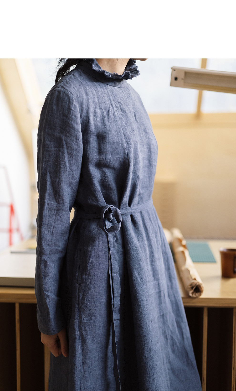 绽放049朵/色织亚麻双层毛边文艺长袖连衣裙女春季新款简约长裙子