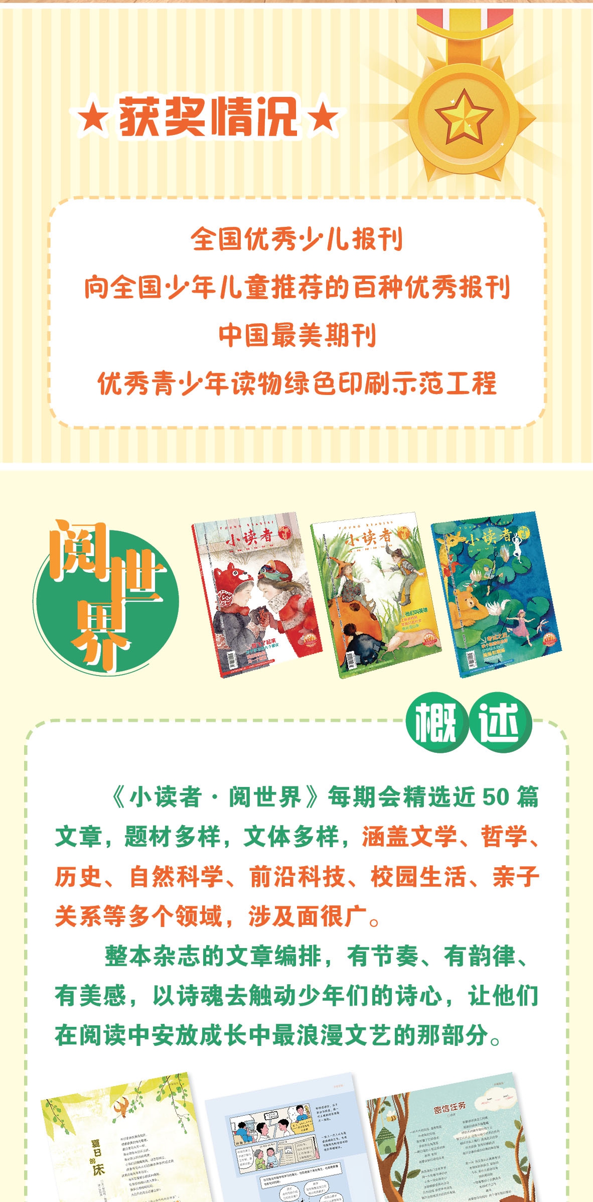 1、小读者,每月两本刊物 :《阅世界》和《爱读写》,适合3-6年级。