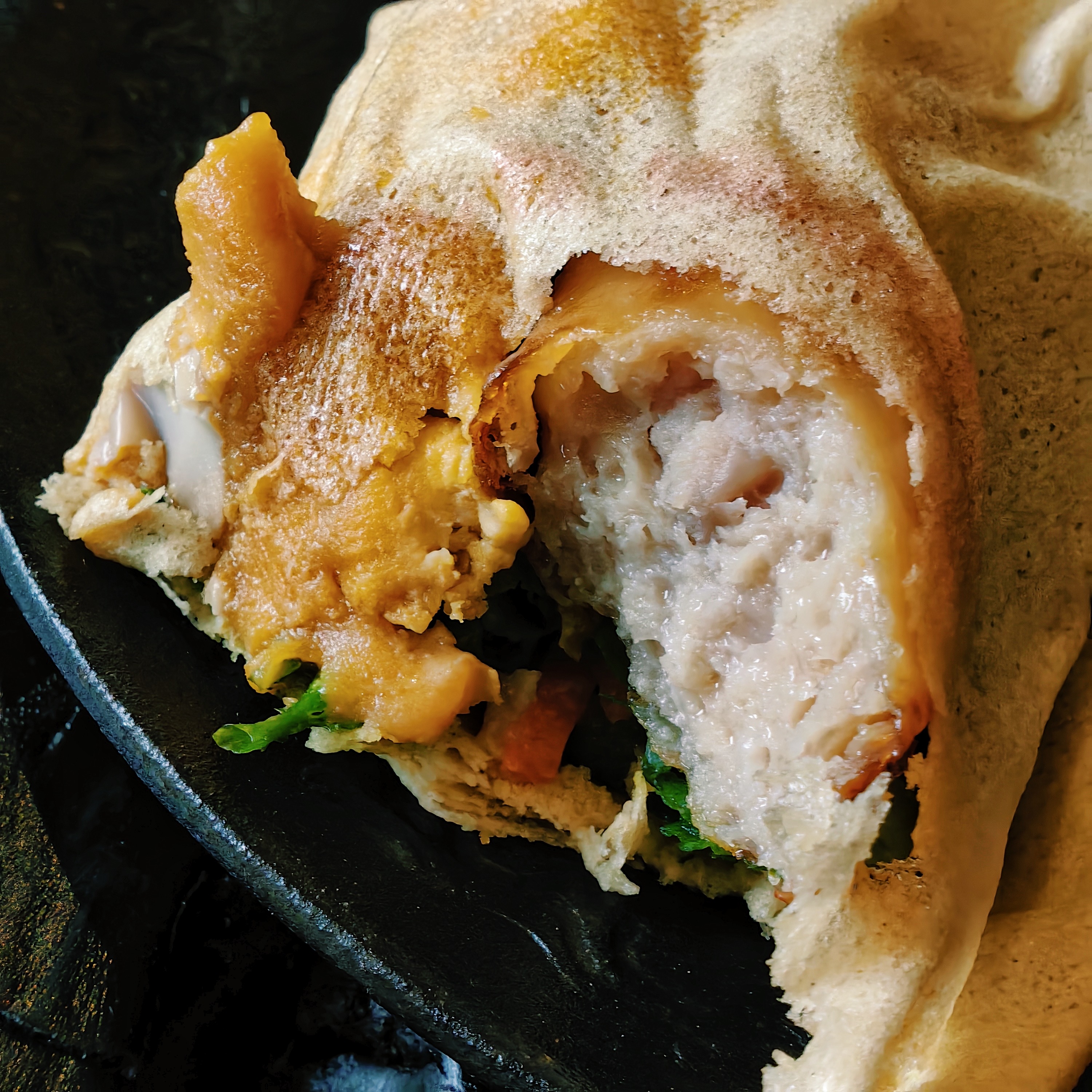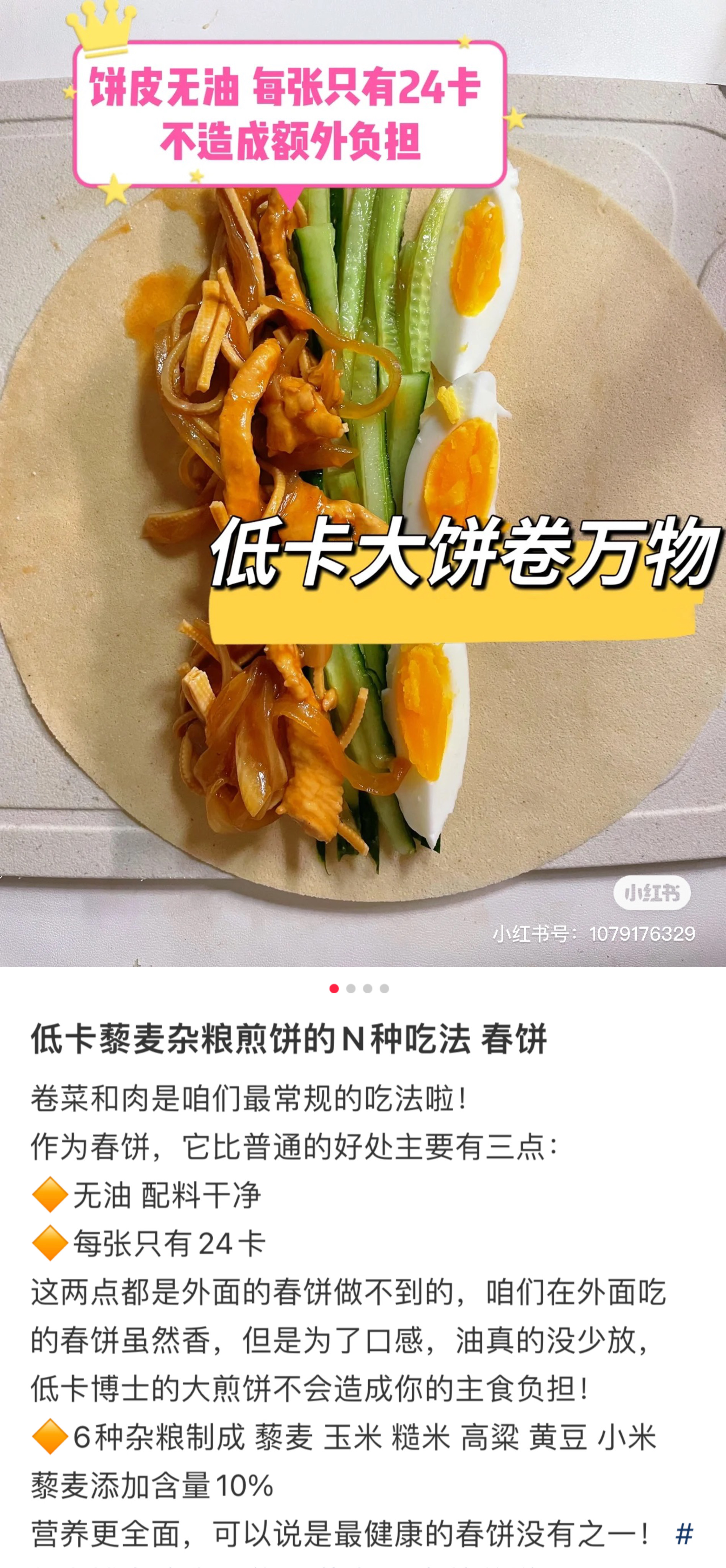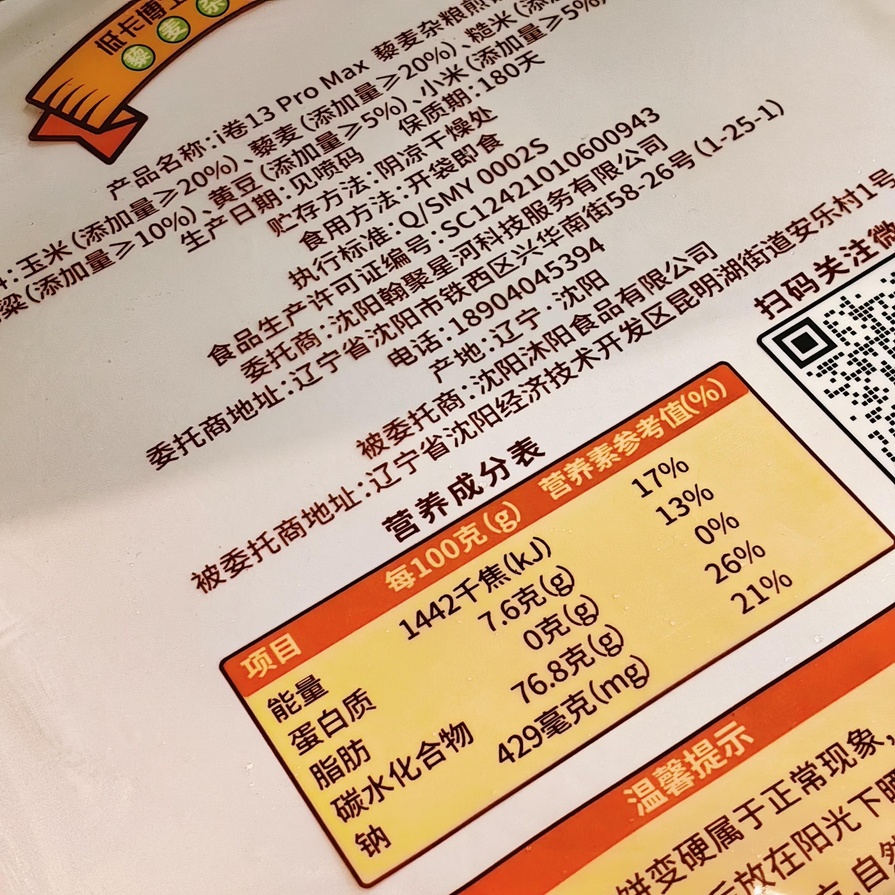今天上的黎麦杂粮饼,看配料表也真的是很健康:玉米、糙米、藜麦、高粱、黄豆、小米,虽然是杂粮饼,但口感并不干硬,而是含有一定水份,直接吃就很香,泛着杂粮本身的甜味儿,很有韧劲,挺适合减脂期当碳水的,毕竟1张热量只有24大卡哦!当然,用来裹菜夹肉做卷饼是更好吃了,杂粮饼直径20cm,放上一两片蔬菜、番茄,切个超爱的蟹皇蛋、还有含肉量达85%以上的本味肉肠,蛋白质、碳水、膳食纤维就达标了,不需要任何调味料就足够好吃,蟹皇蛋的咸味,正正够!
