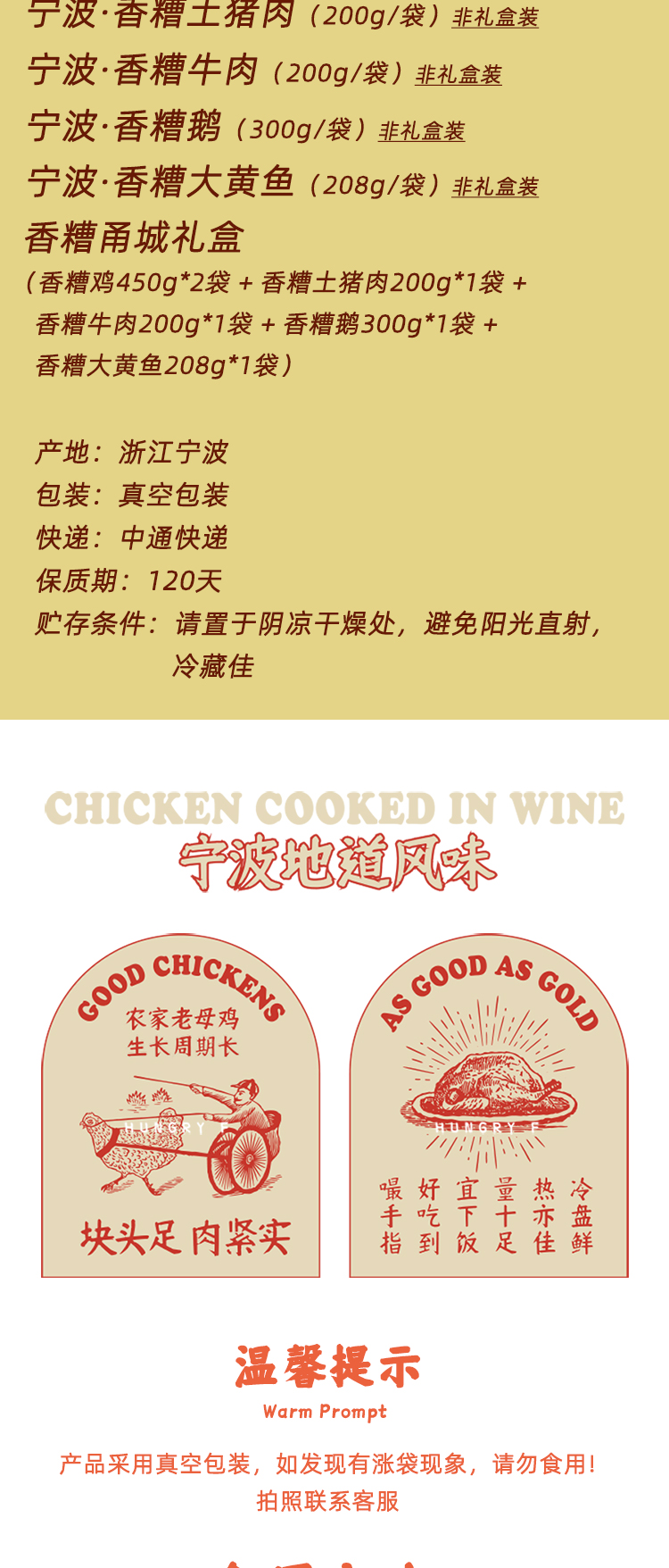 香糟鸡450g*2袋+香糟牛肉200g*1袋+香糟猪肉200g*1袋+香糟大黄鱼208g*1袋+香糟鹅300g*1袋