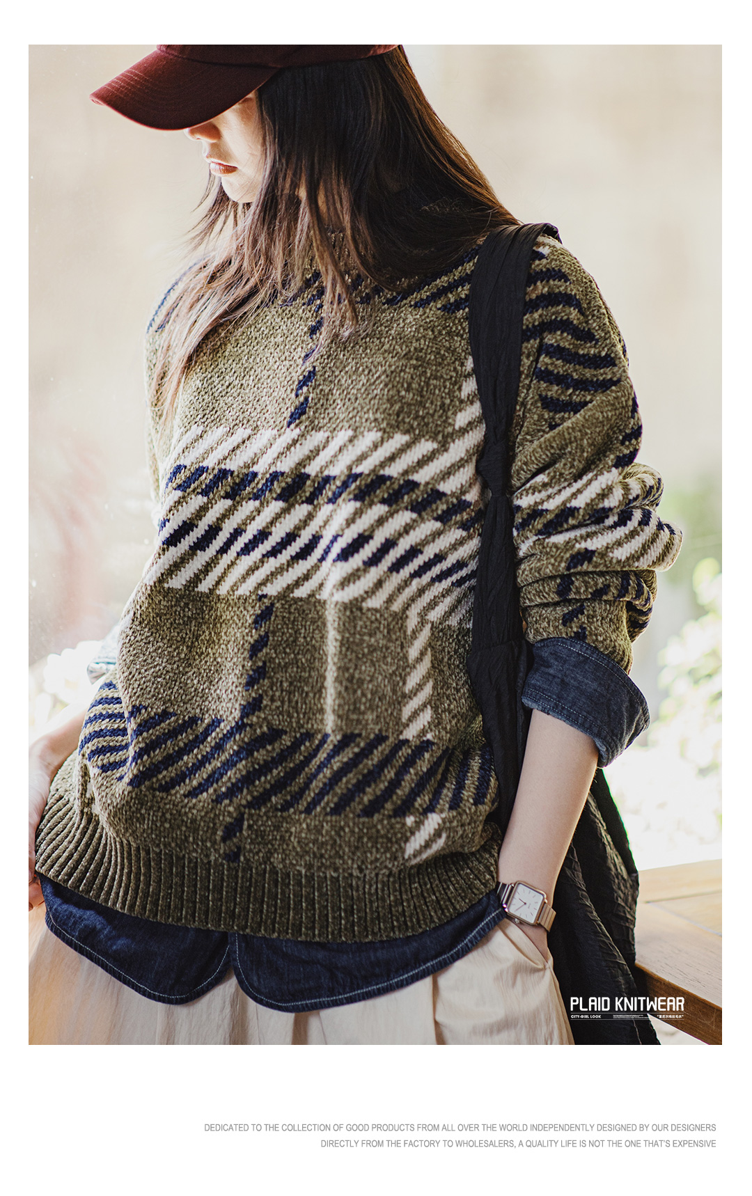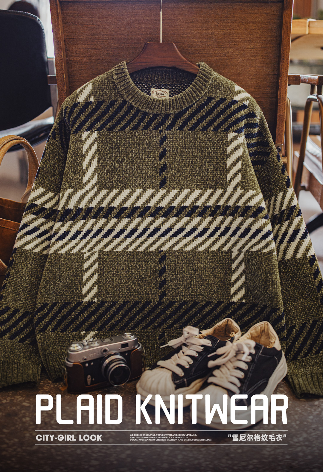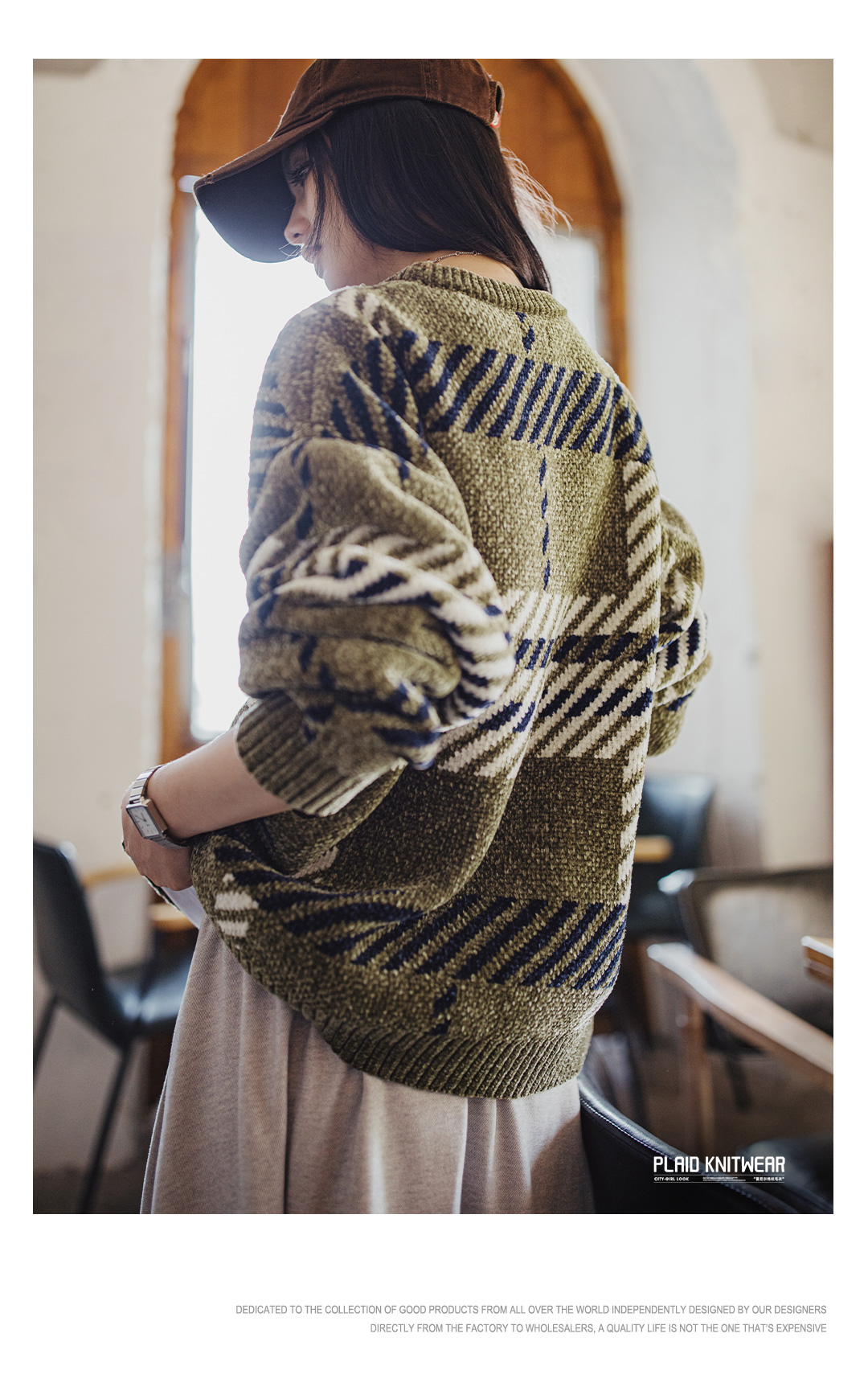 马登复古雪尼尔格纹宽松圣诞套头保暖加厚实毛衣软糯针织衫女秋冬