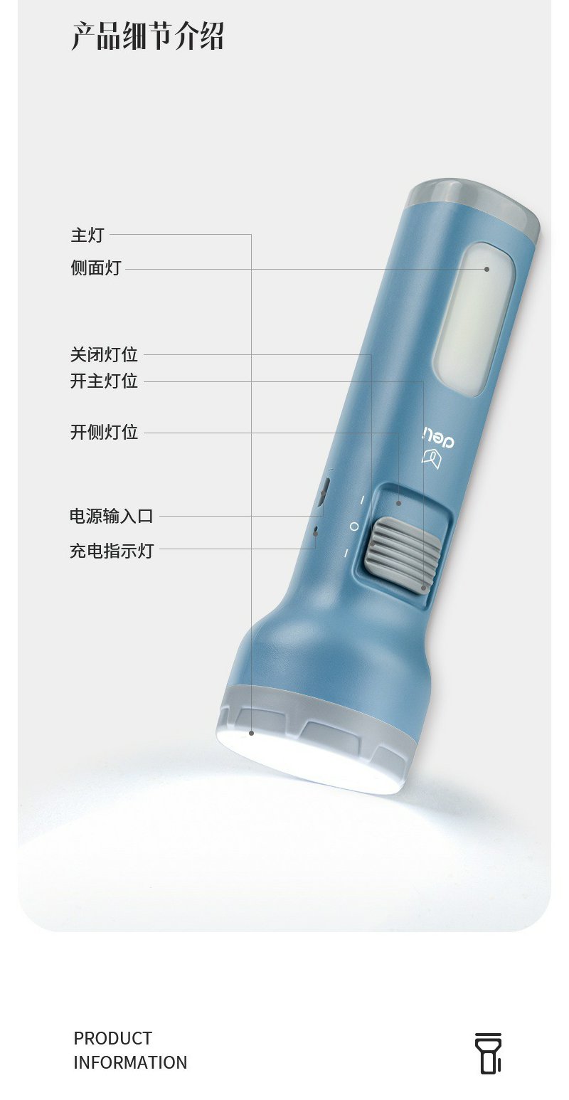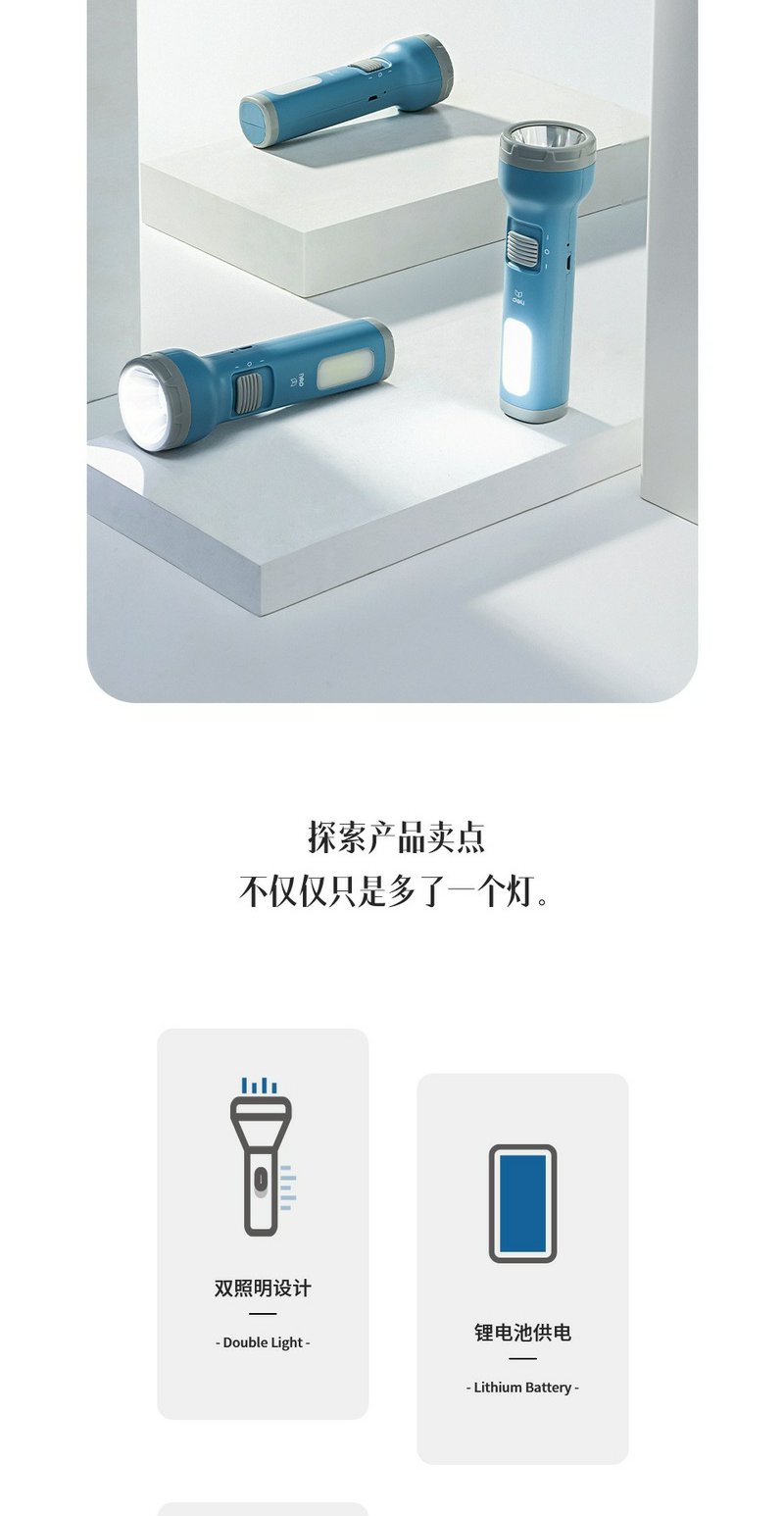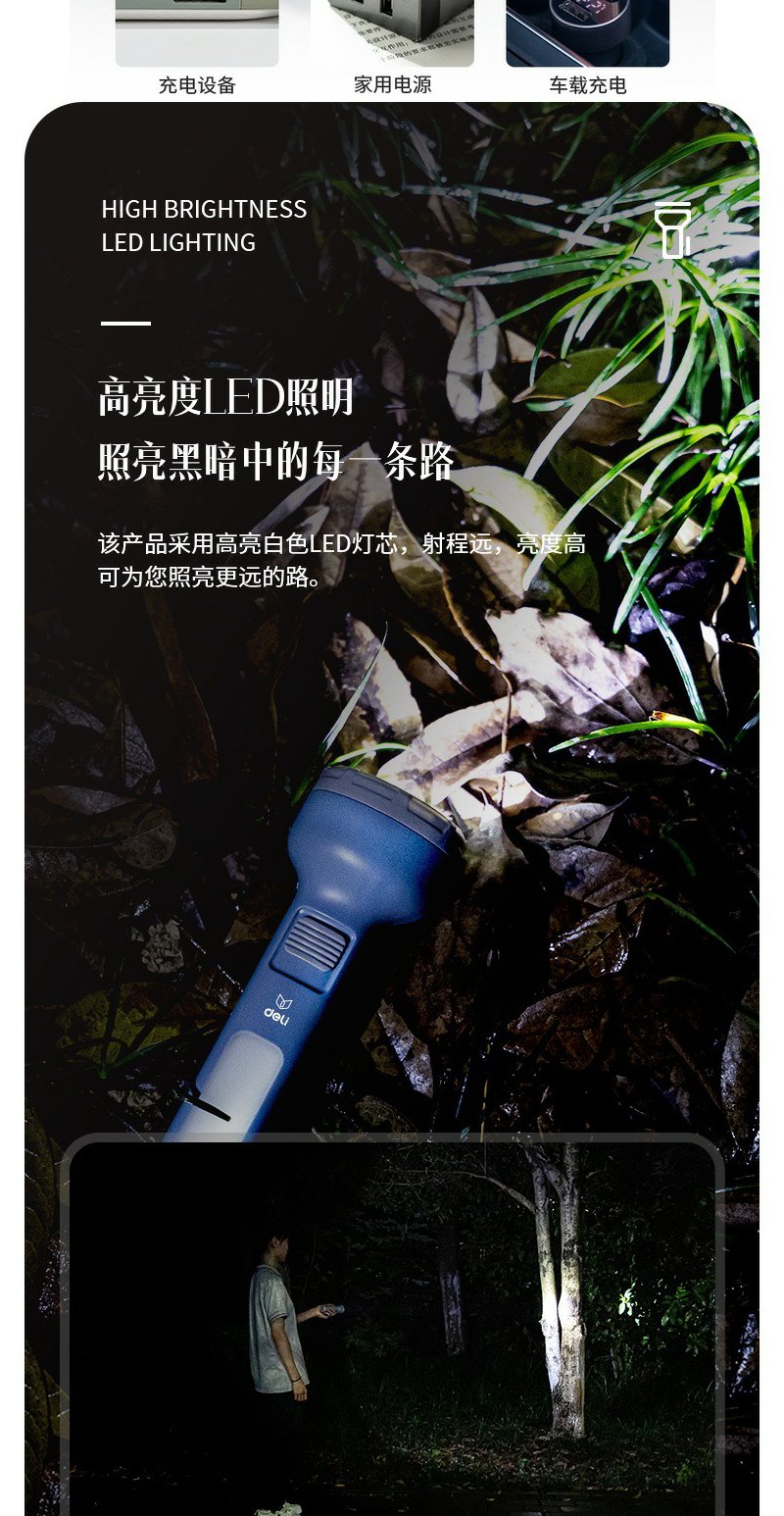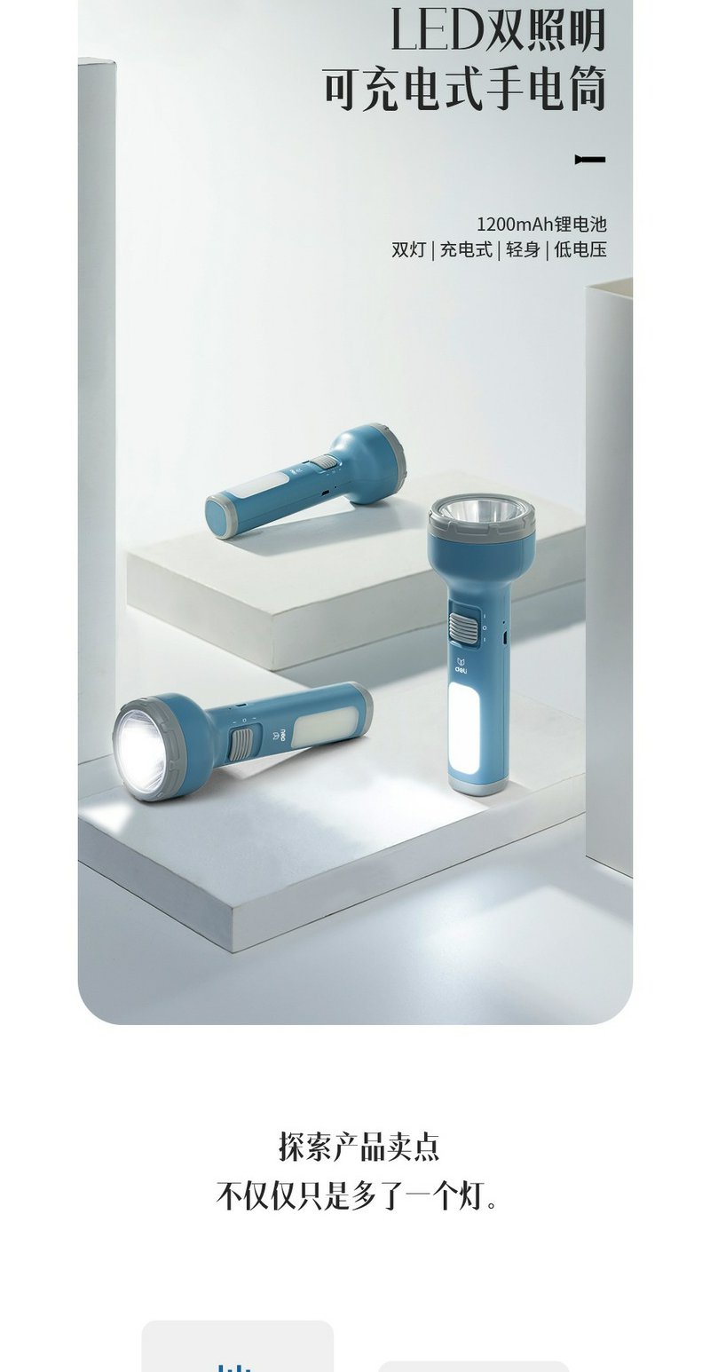 得力3662A充电式LED强光手电筒双照明设计