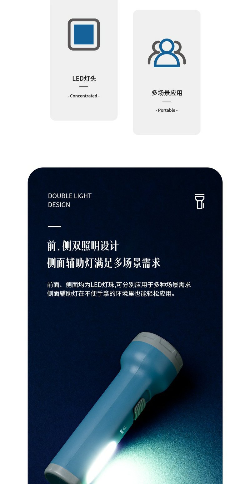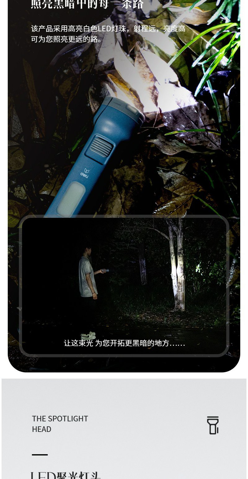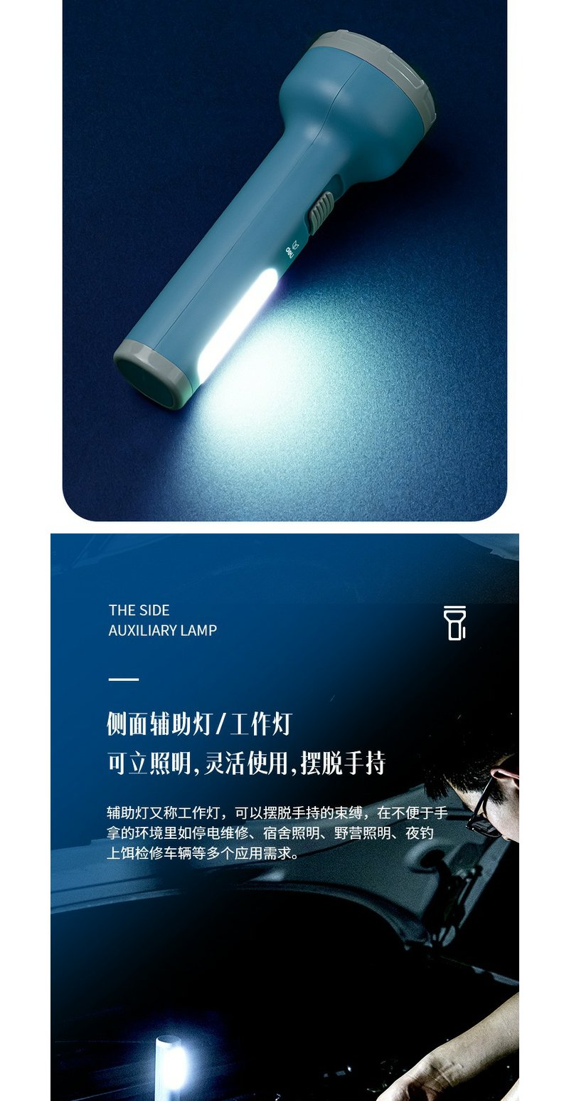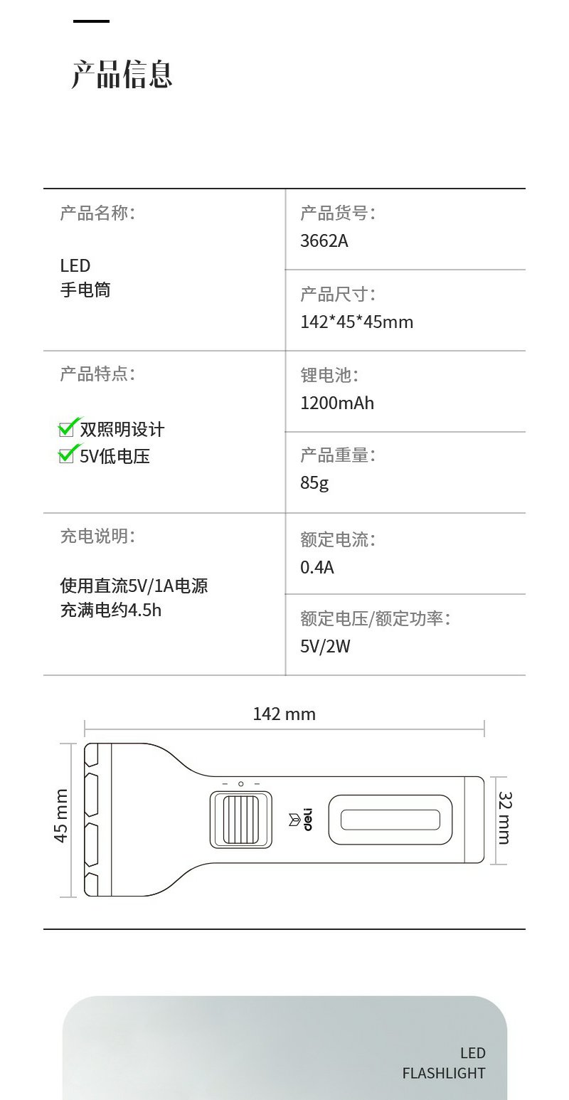 得力3662A充电式LED强光手电筒双照明设计