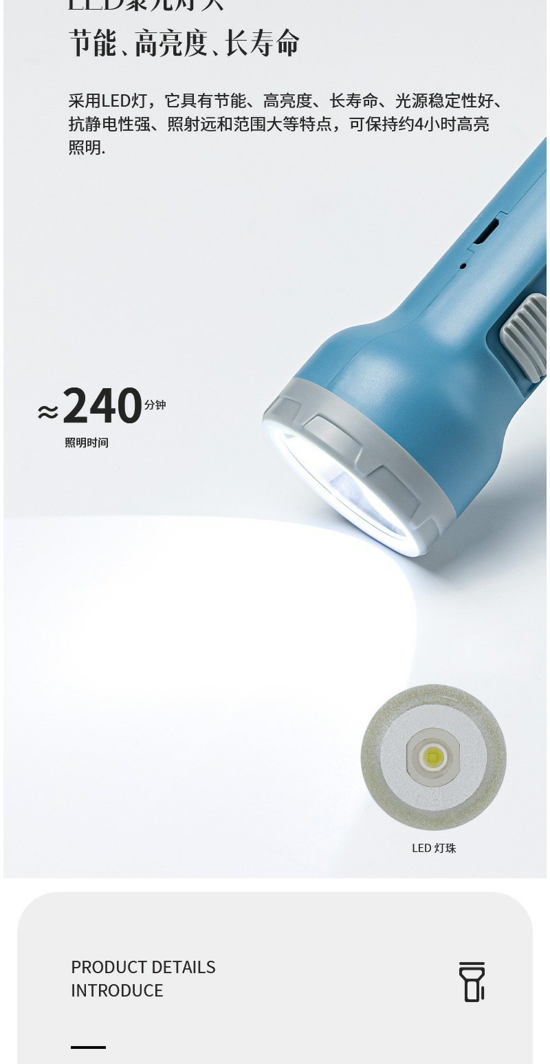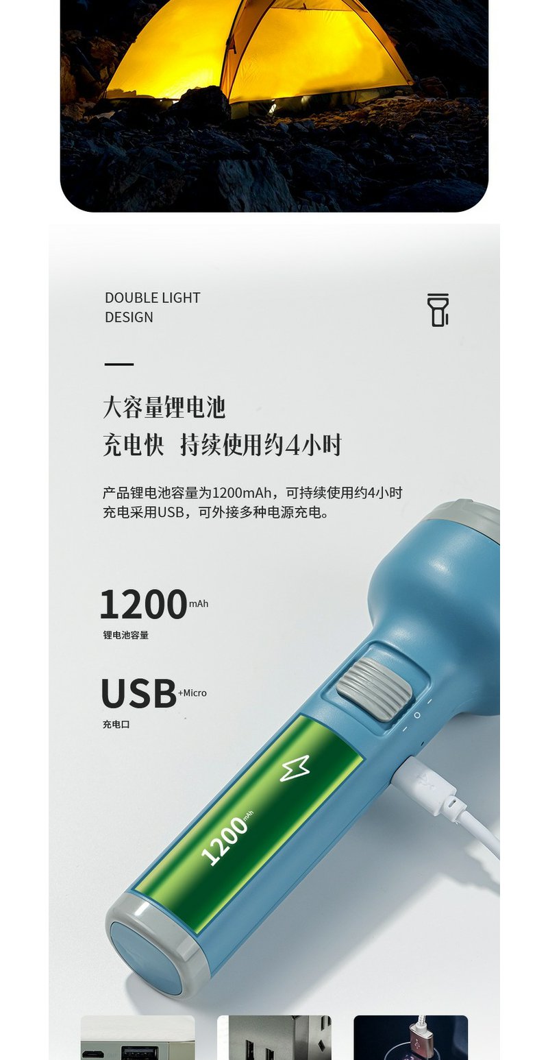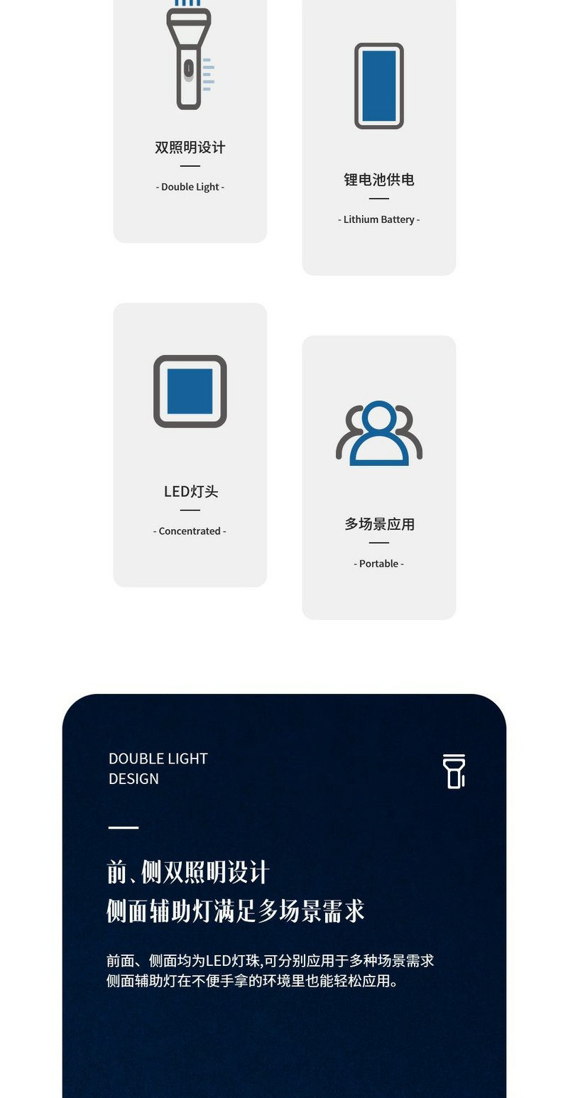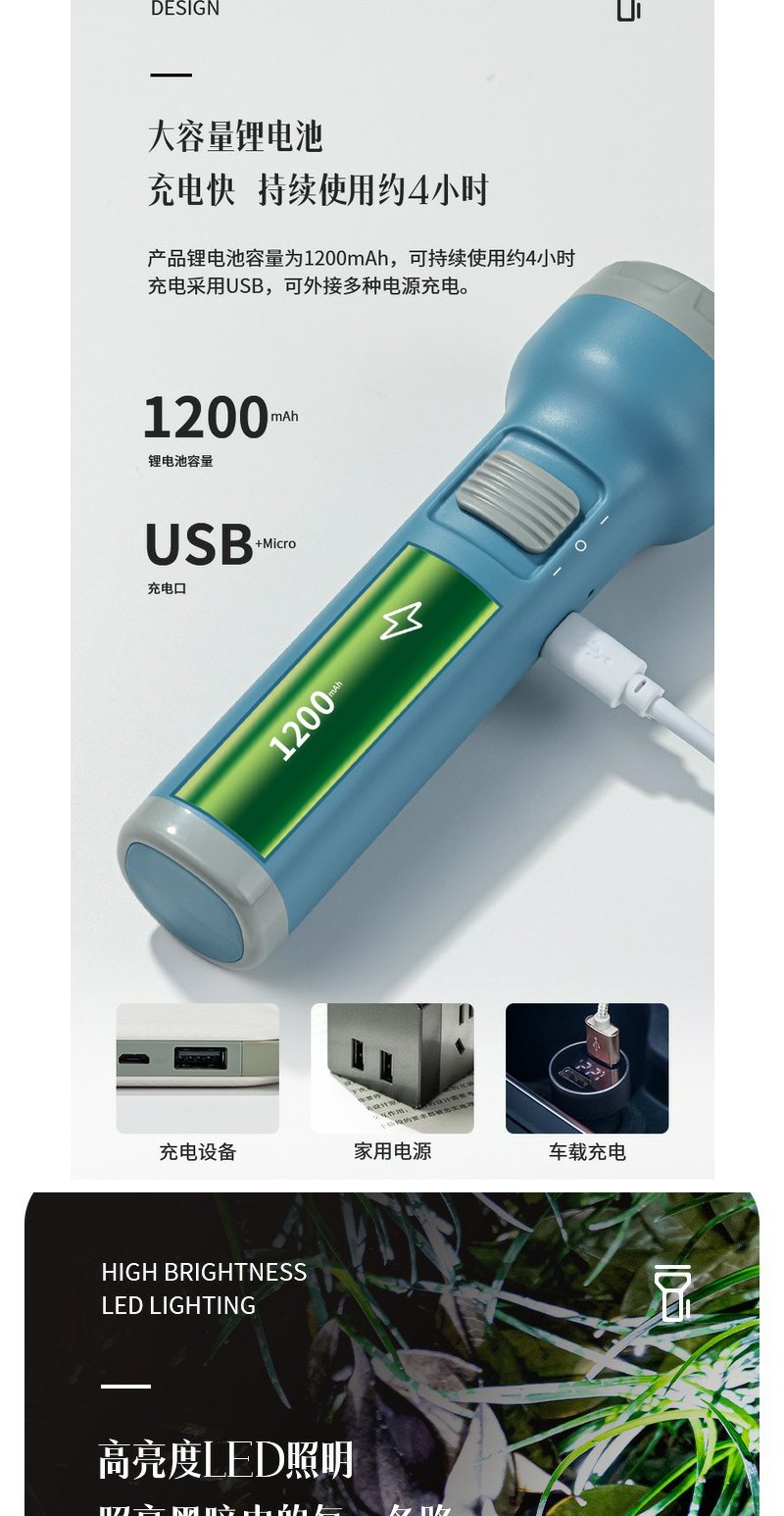 得力3662A充电式LED强光手电筒双照明设计