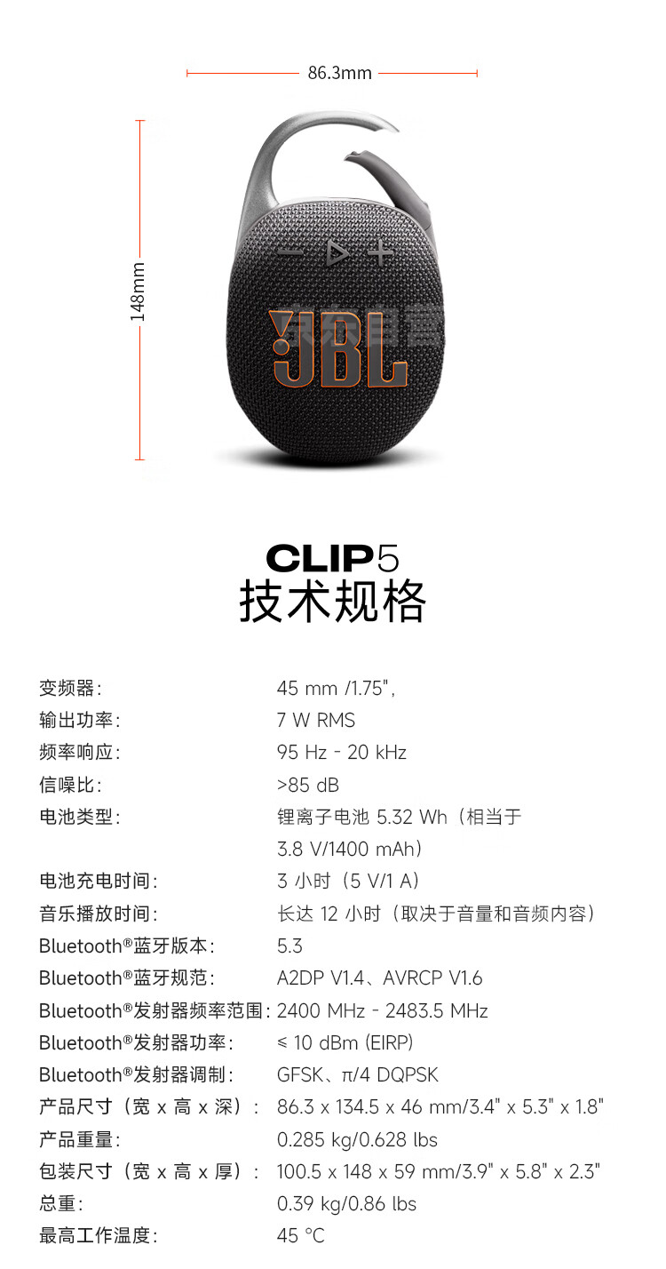 JBL CLIP5音箱*1、TypeC USB 连接线*1、快速入门指南*1、保修卡/安全数据表*1