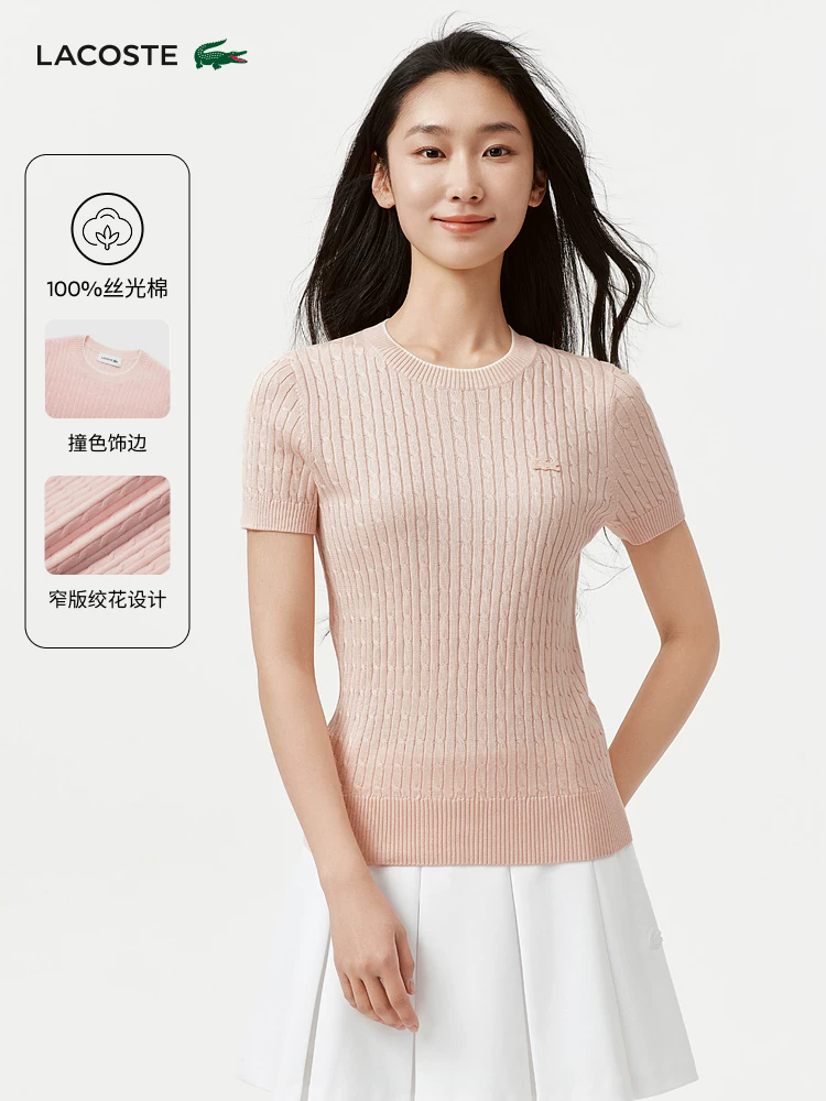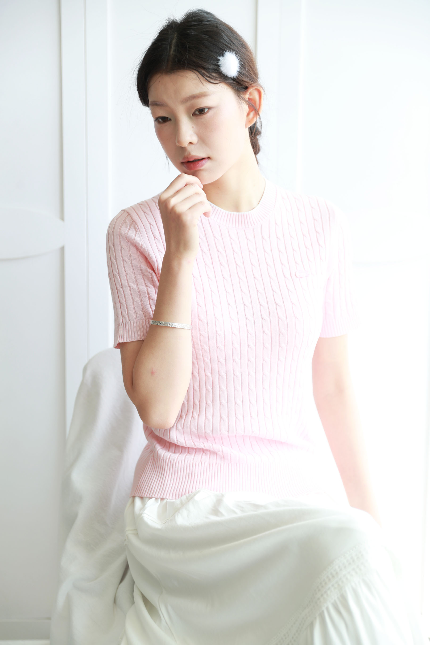 马卡龙配色,麻花针织衫。温柔绞花工艺小标刺绣短袖上衣E041466