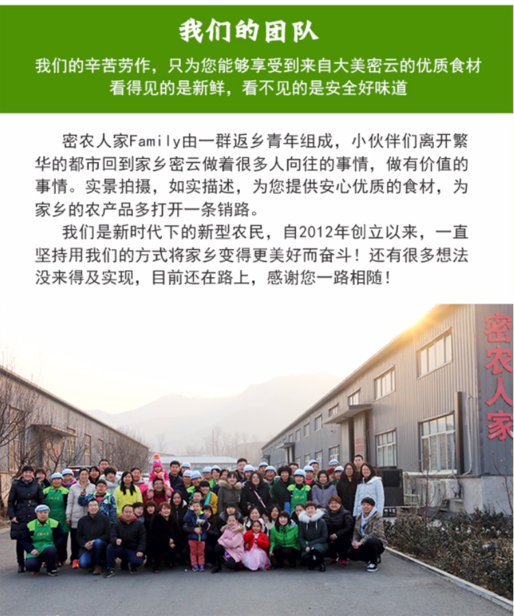- 一群返乡青年,离开繁华都市回到家乡密云,依托互联网数据指导生产,为您提供安心好味道的优质食材!