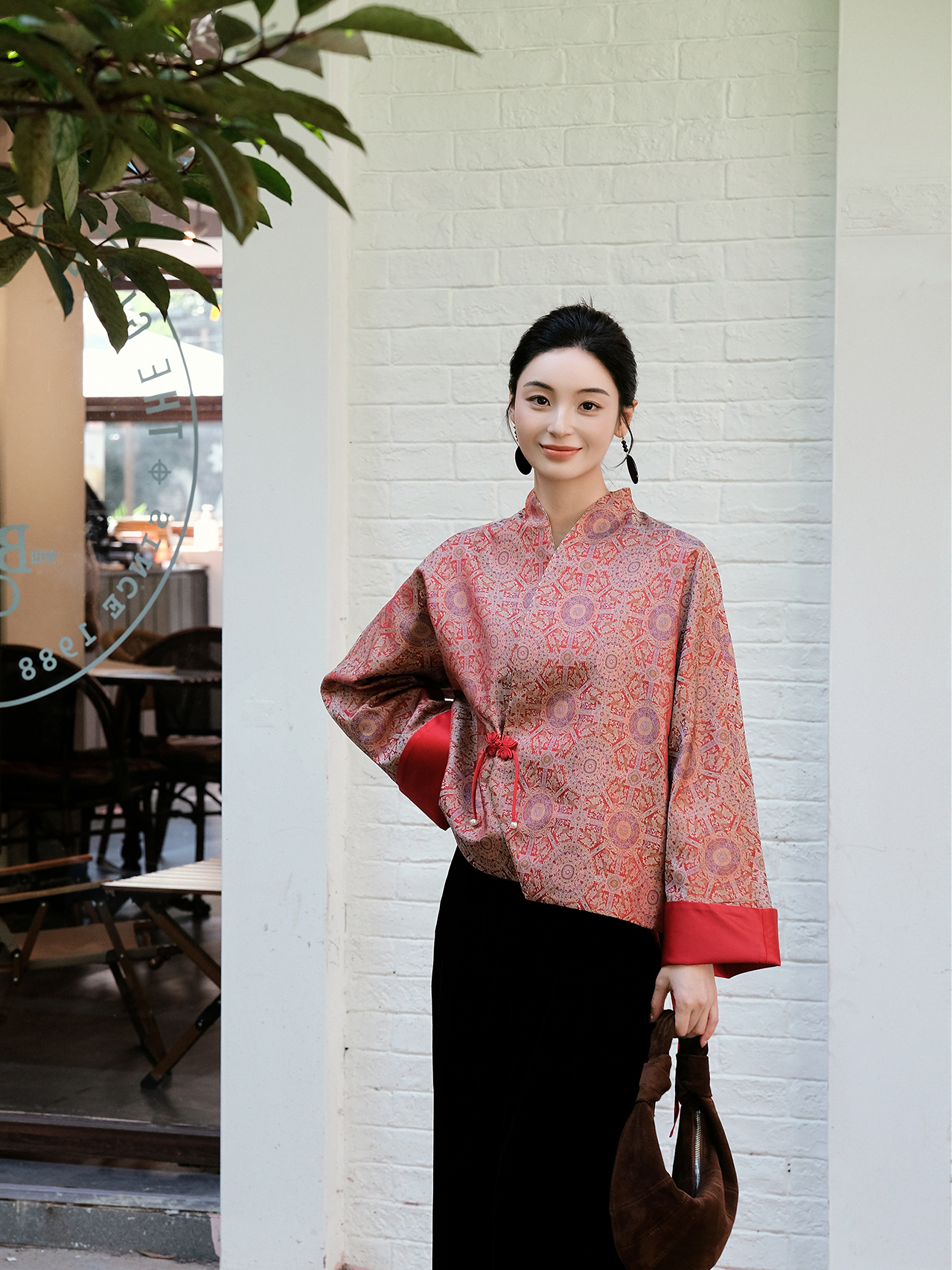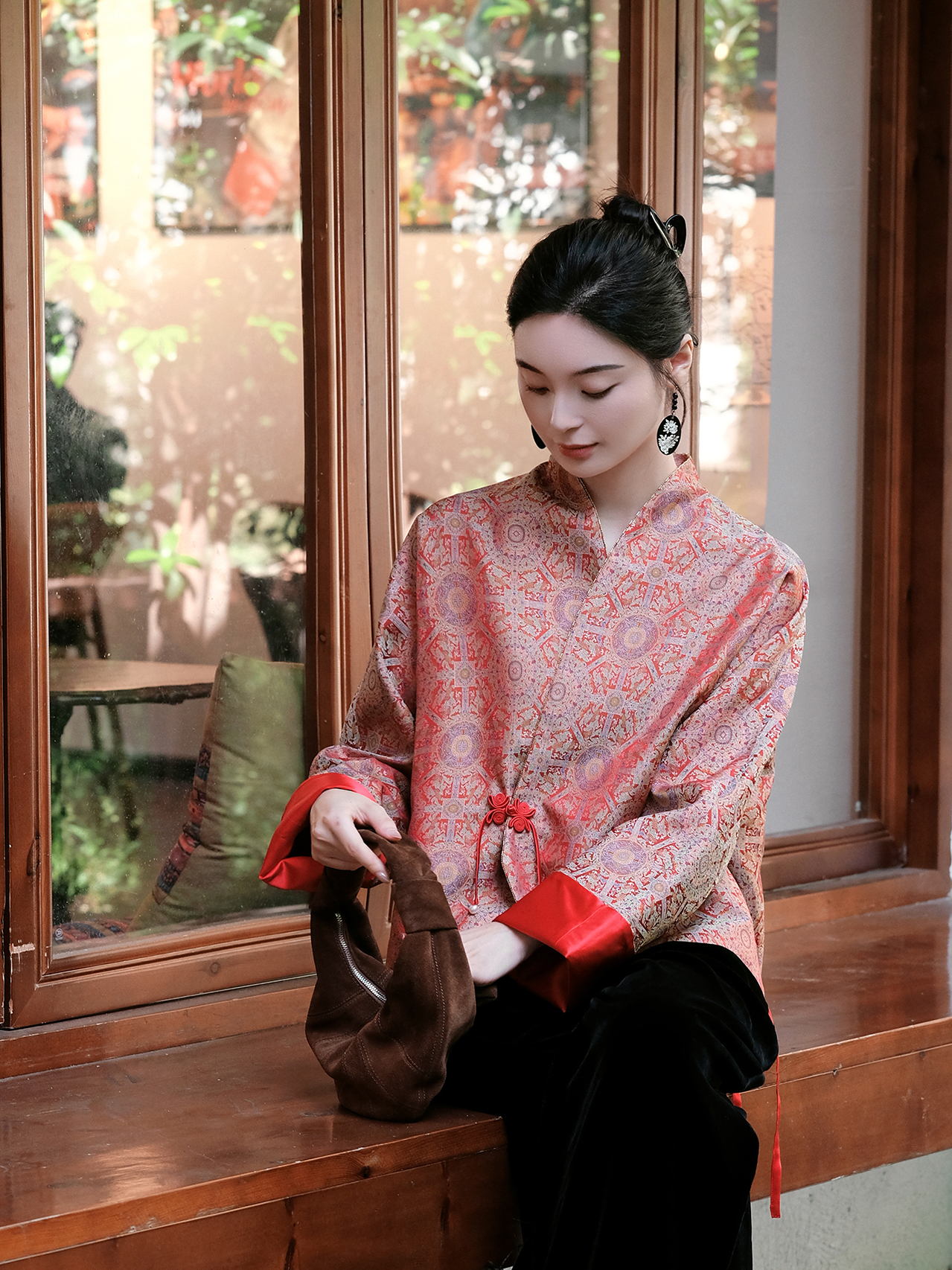 盛唐牡丹 |勃艮第红冠乐绉斜襟上衣