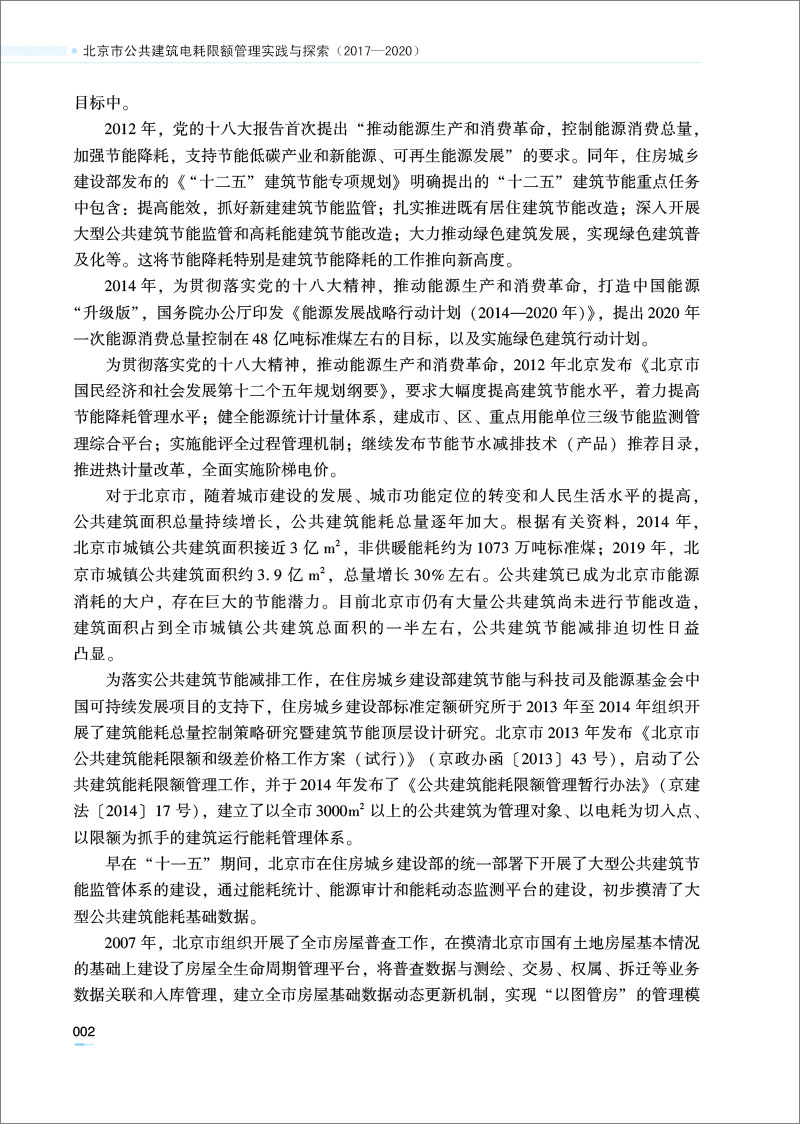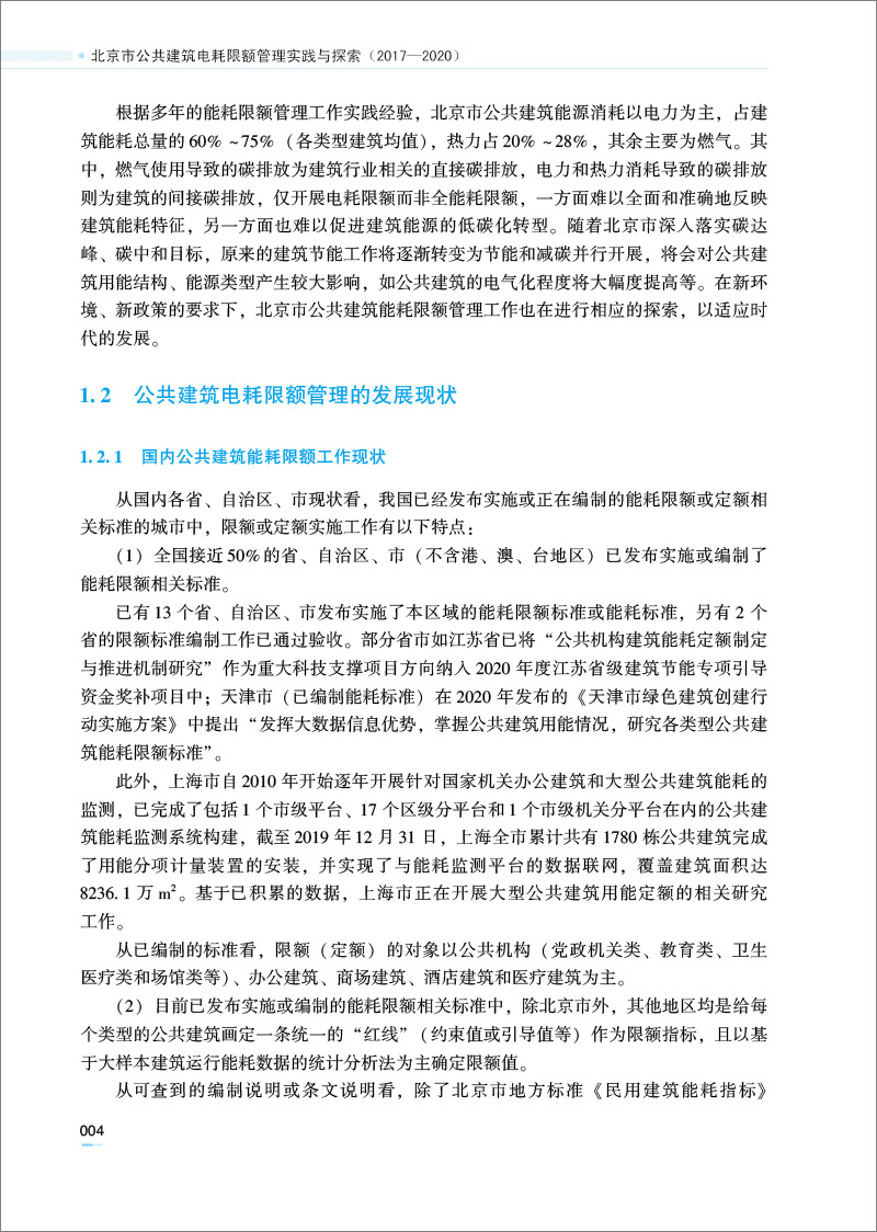 第2章:概述了北京市公共建筑能耗限额管理2013年至2016年积淀阶段的工作内容,并通过与2013年至2016年工作实践的对比,从构建制度体系、搭建专业管理系统、制定科学管理流程、优化考核方法,以及多举措联合、多媒体宣传等方面,全面总结了2017年至2020年公共建筑能耗限额管理充分发展阶段的工作内容更新与提升。