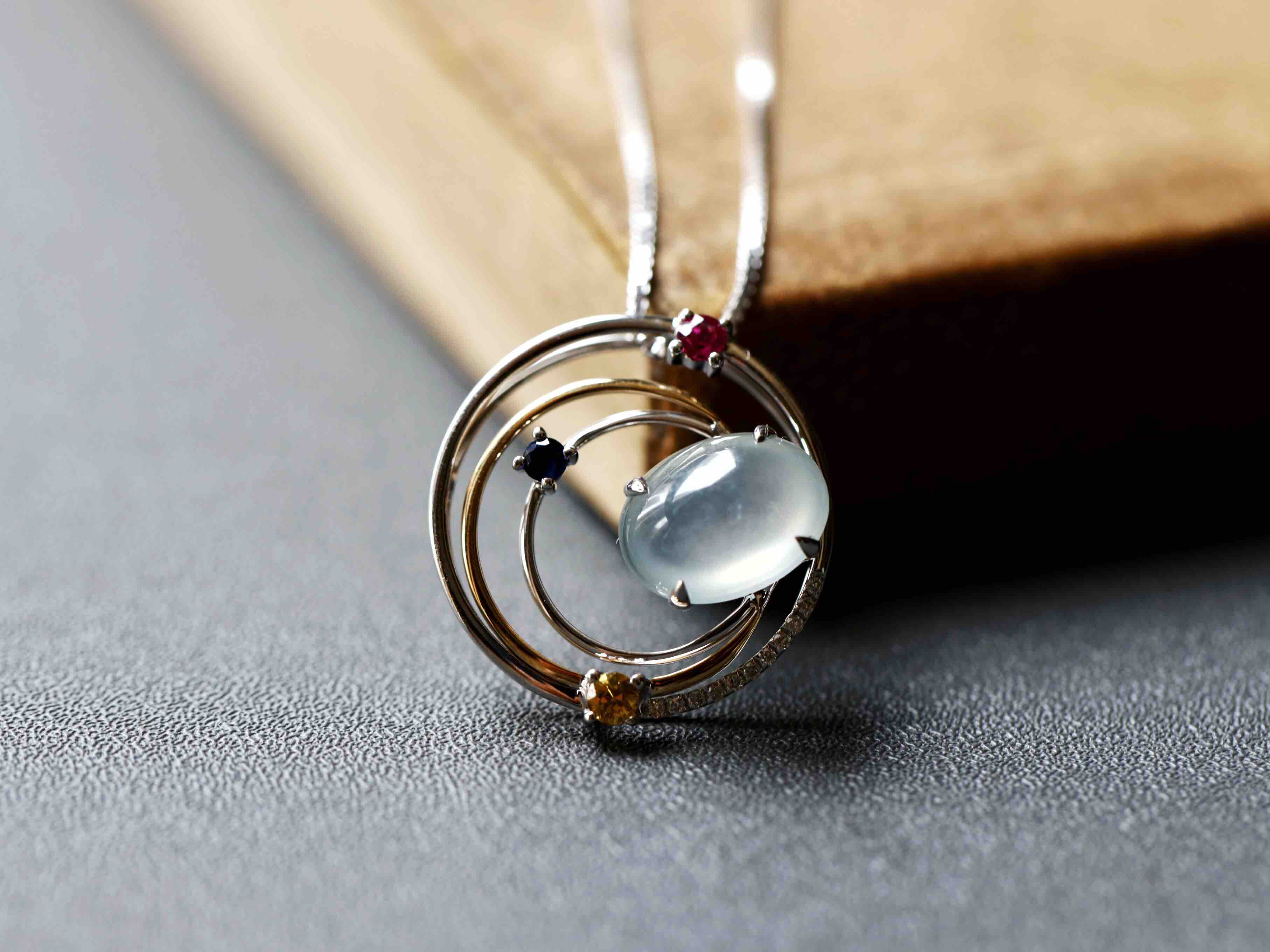 高冰种翡翠蛋面吊坠18k白金钻石彩宝镶嵌,翡翠禄来原创设计系列作品《恒星》。带给你颇具设计感的现代风格翡翠首饰,大气饱满的高冰种蛋面,10×7.6×4.5mm,镶嵌后19+19×7.2mm。18k白金钻石镶嵌的轨道,黄水晶,蓝宝石,红碧玺。究竟是什么神秘力量,让大家相互吸引,如此神秘而又浪漫