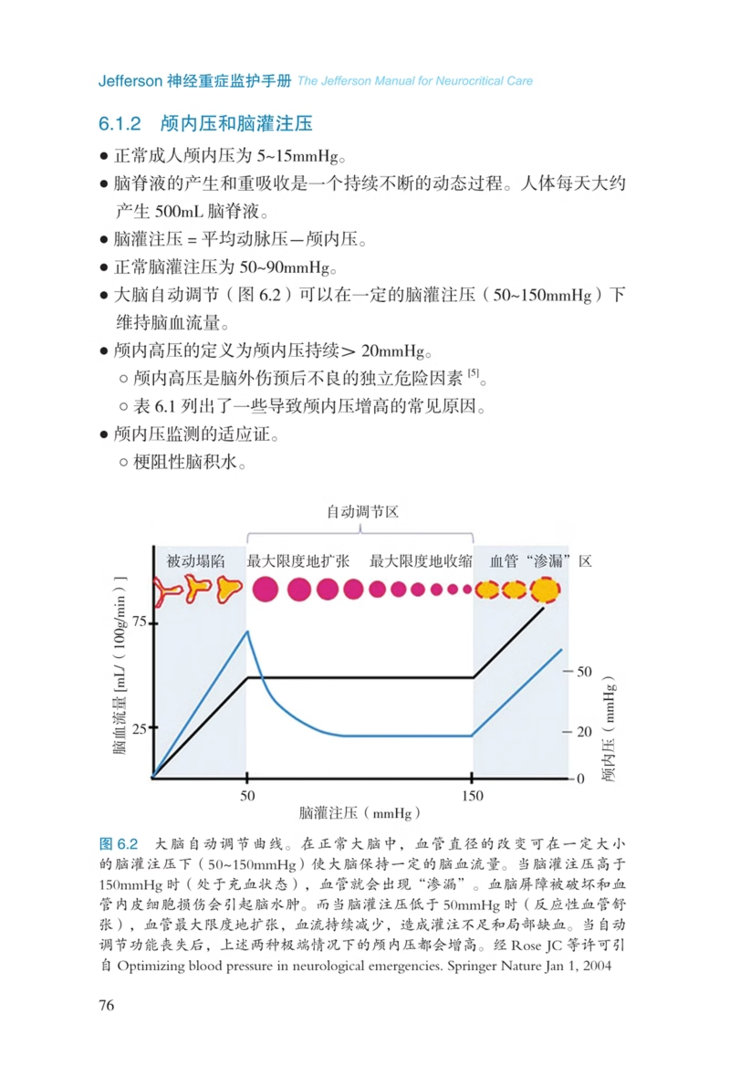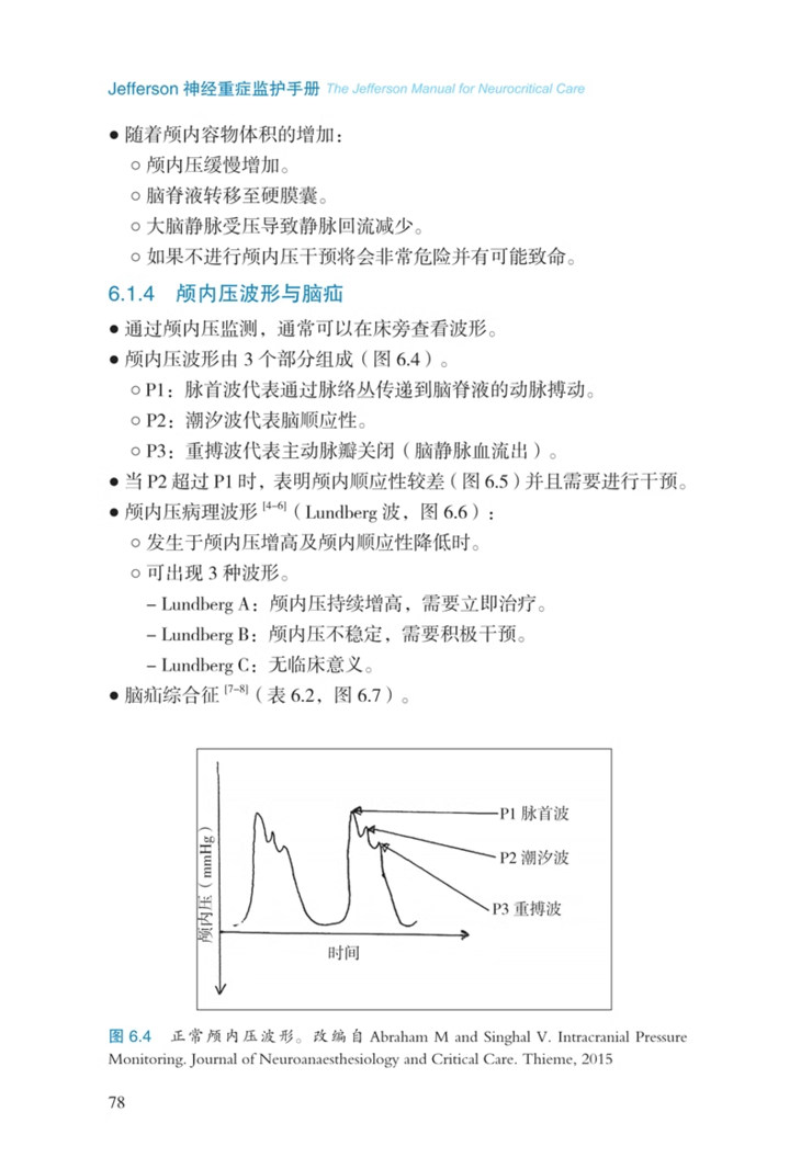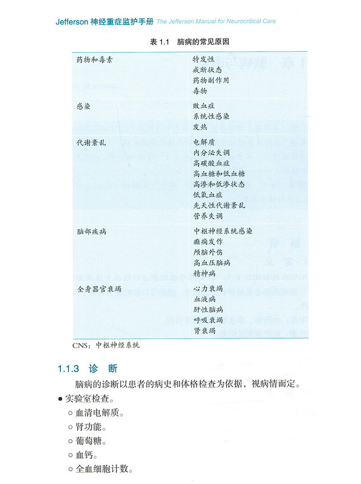 Thomas Jefferson大学医学院是美国一所历史 悠久的大型 医疗机构,2014年 名为Sidney Kimmel医学院,其 的医药研究水平和 的患 者个体化管理水平享誉 。本书凝聚了Thomas Jefferson大学医学院在神经重症监护方面的临床 经验之精华,全面总结了神经重症监护中常见病的 诊断和治疗流程,对于临床中的疑难问题进行了详 细地阐述,为临床医生提供了早期预警和明确指导 。全书共19章,涵盖了脑卒中、脑水肿、创伤、 脑死亡等常见急症,谵妄、颅内压 、发热、代 谢紊乱、疼痛等常见临床表现,抗凝、抗感染、抗 癫痫、营养支持、机械通气等规范诊疗流程,血流 动力学、神经影像学等辅助检查。本书各章编写相 对独立,以分条列举的方式呈现,辅以大量总结性 表格和患者管理流程图,清晰简明,专业实用。