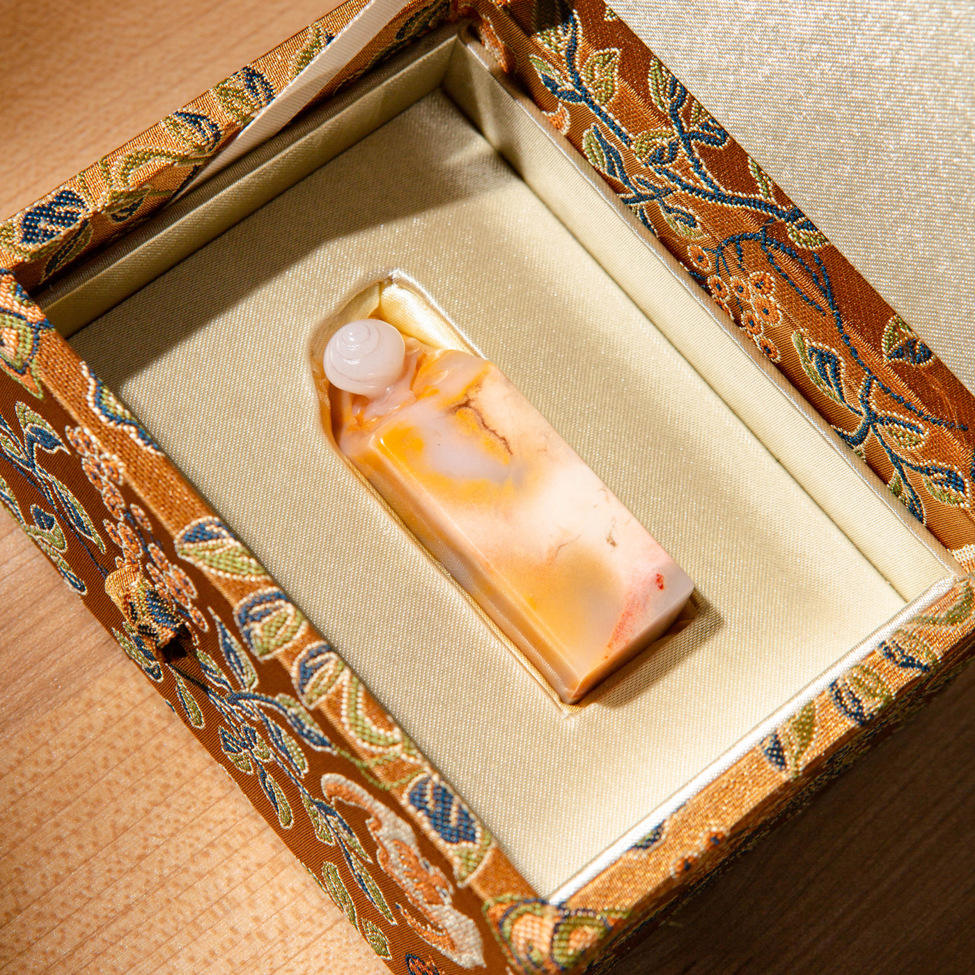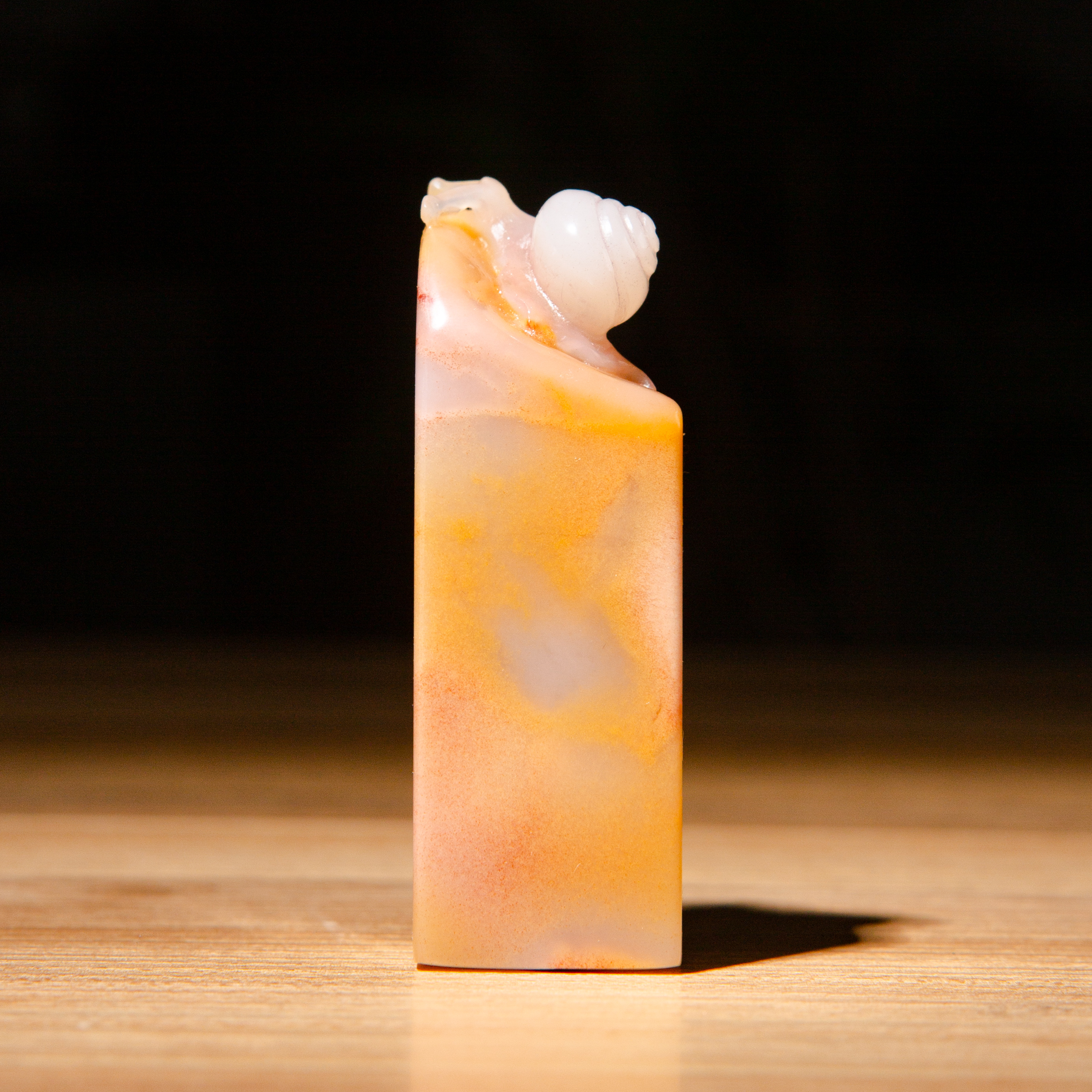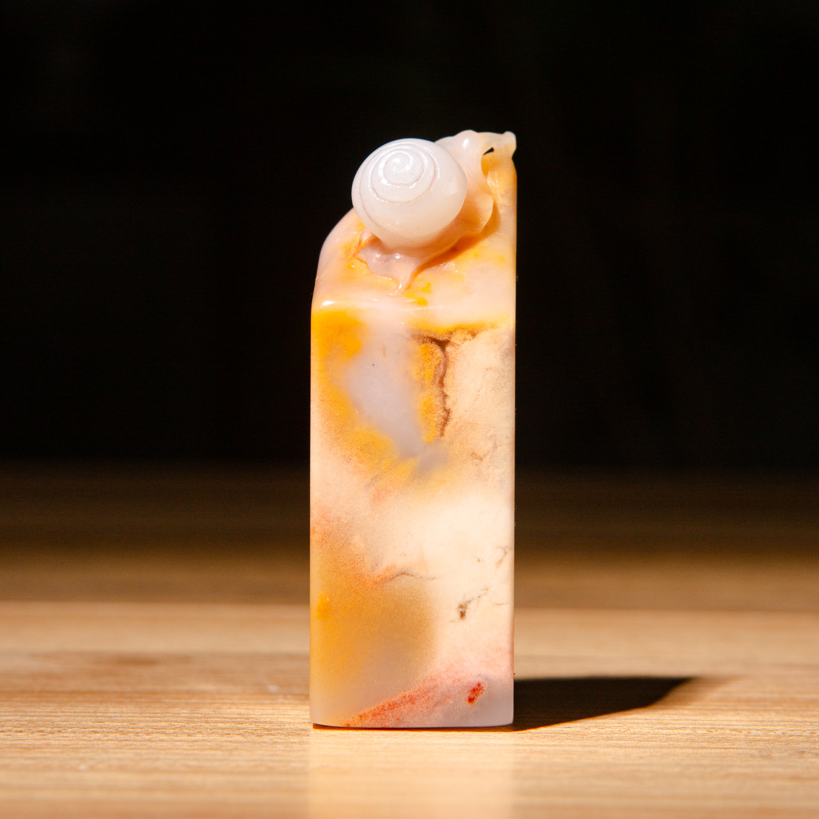 寿山石老料巧雕“蜗牛”方章,均采用存放几十年的老料,纯手工精雕而成。其雕工精美,质地温润,石性稳定。