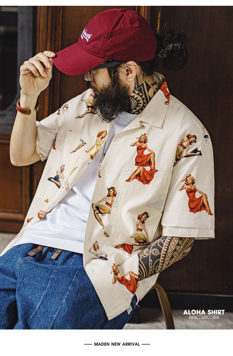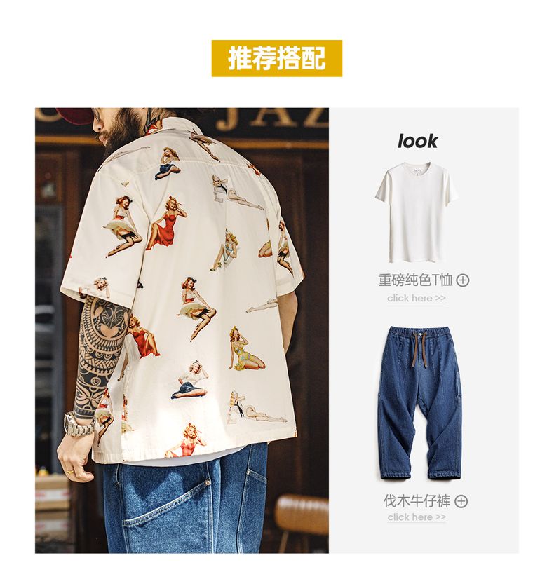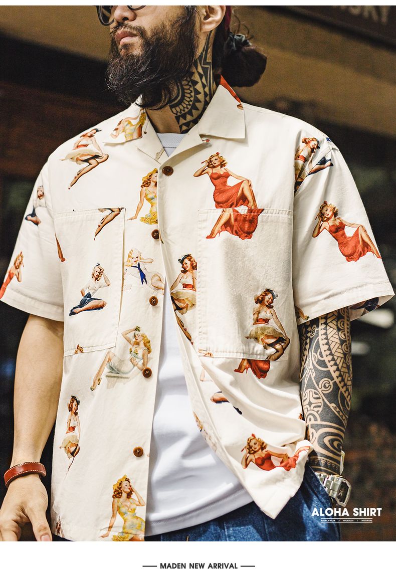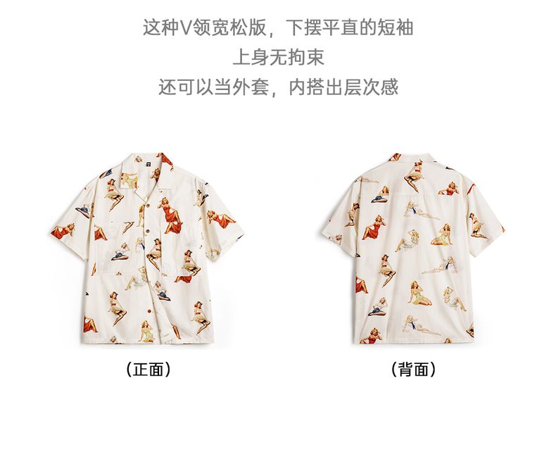 工装优选美式复古满印花古巴领衬衫夏威夷短袖沙滩衬衣外套男款夏