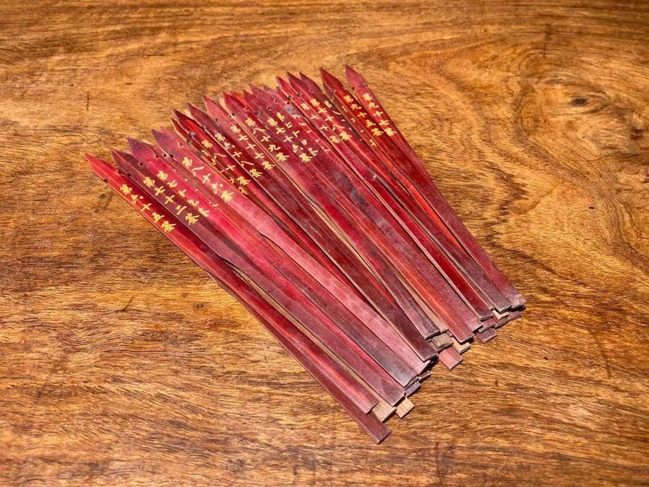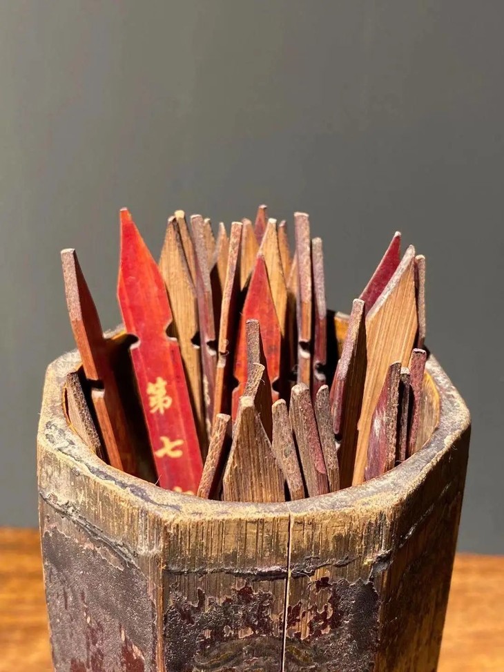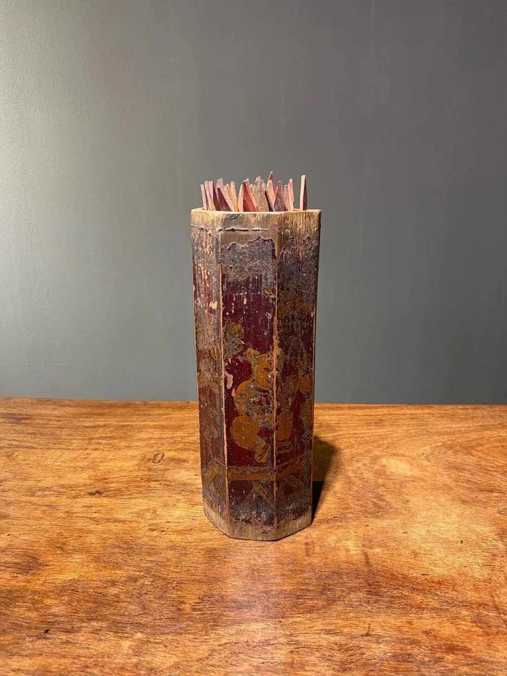 抽签的占卜方式起源于道教,在道观中,签筒是不可少的物品,筒中放着竹木片制成的签条,上边写着签语或是签纸的编号,从道教的签筒上不难看出抽签有着久远的历史。此组签筒与签条设计精巧、大漆彩绘纯朴自然,流传数百年后仍然气质优雅,竹筒与竹签质地温润、色泽柔美,是重要寺庙或富贵阶层家庙之物。其珍贵与稀有度超过清代之玉雕或一般之佛教用具。