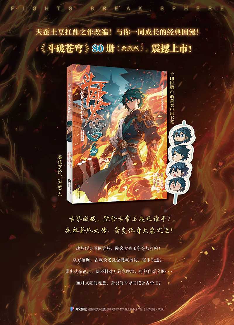 1. 亿万点击、起点中文网人气玄幻小说漫画版!网络作家天蚕土豆,畅销大神周洪滨与人气偶像漫画家任翔联手,知音动漫重磅巨献,与你一同成长的经典国漫!2. 知音动漫倾力打造,《斗破苍穹》动态漫第5季全平台热播中,重温萧炎强者之路!3. 魂族暴露狼子野心,不择手段掠夺各族保管的陀舍古帝玉!为救父亲、粉碎魂天帝的阴谋,萧炎破釜沉舟,再次踏入危机四伏的古族天墓《斗破苍穹》80册,为夺古玉,魂族全面开战!再入天墓,萧炎实力大进阶!首印附赠Q萌萧炎串串书签!