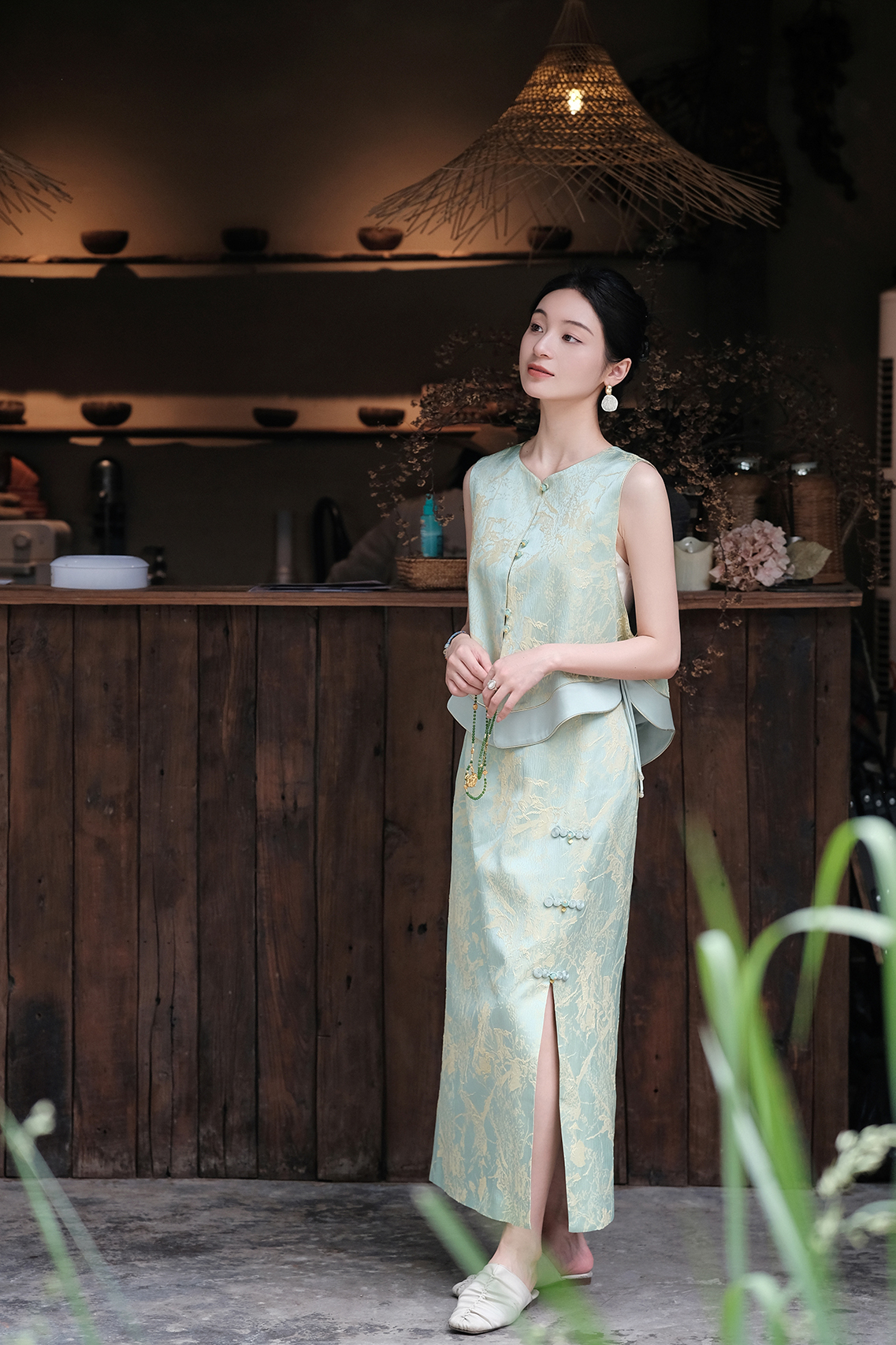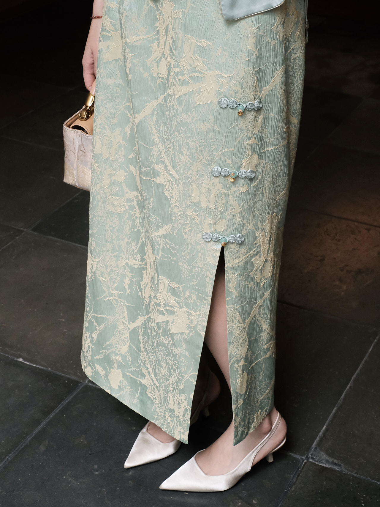 盛唐婧| 新中式真丝双色冠乐皱开叉半裙-绿色