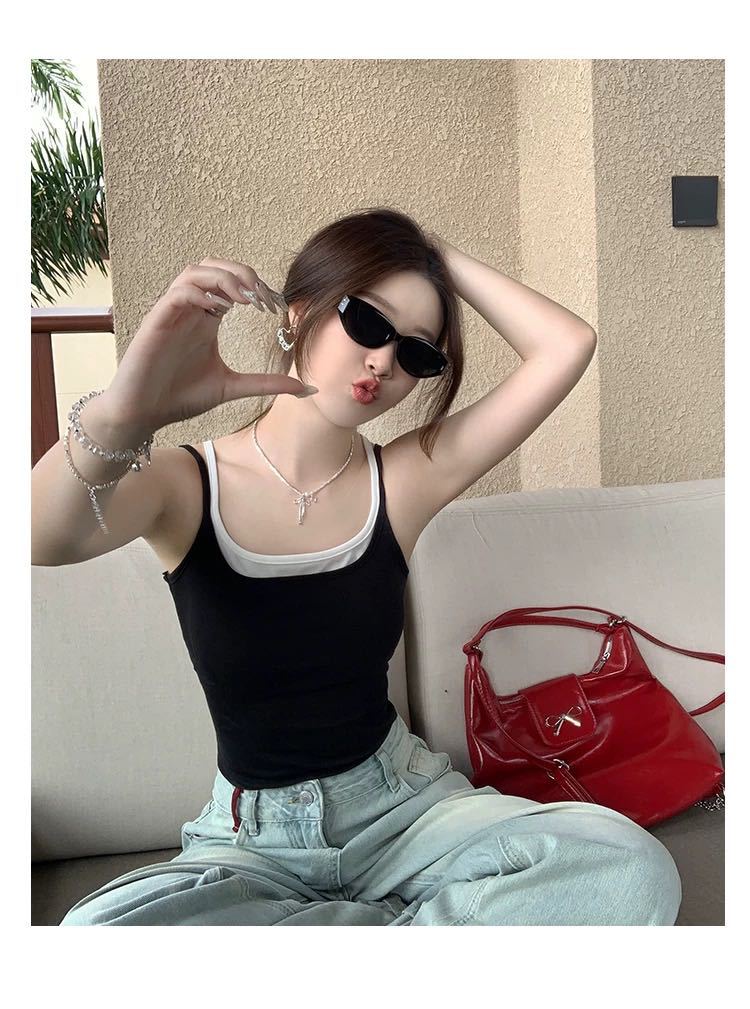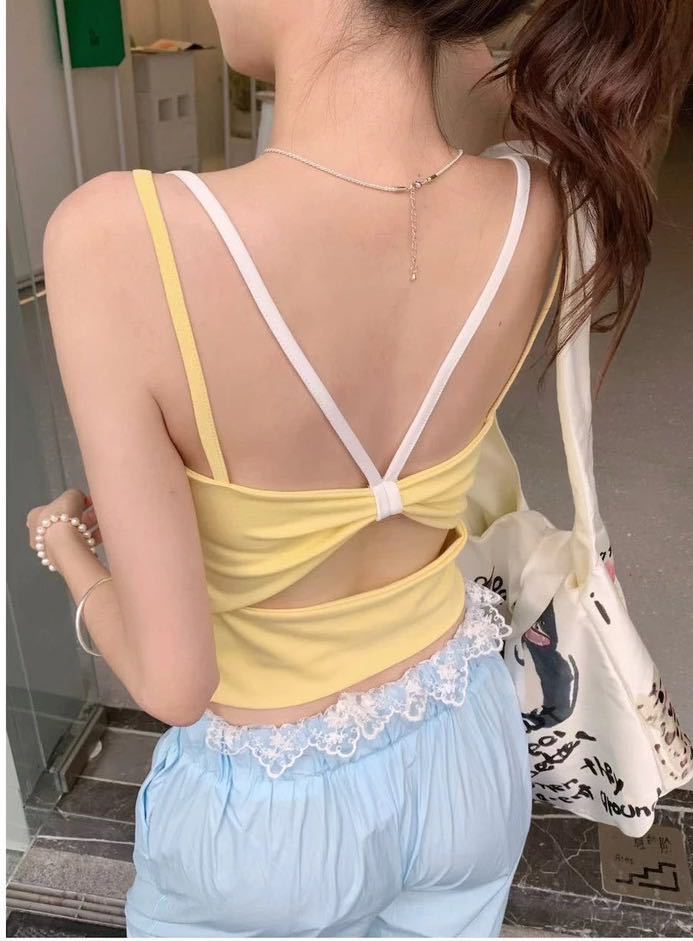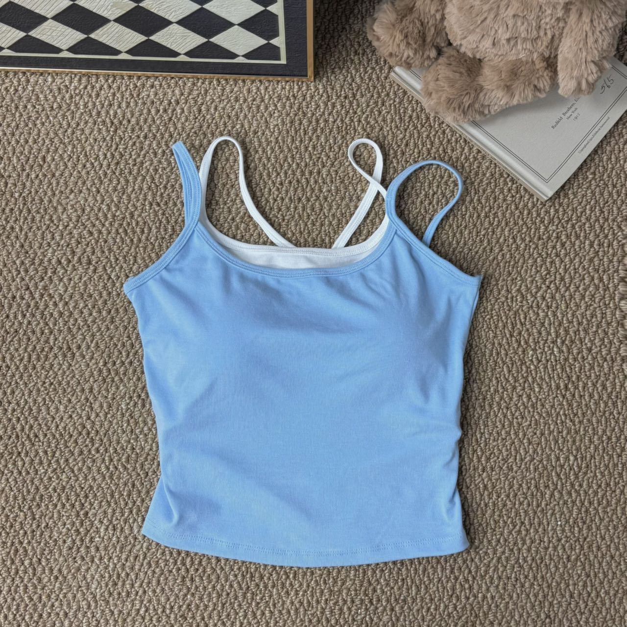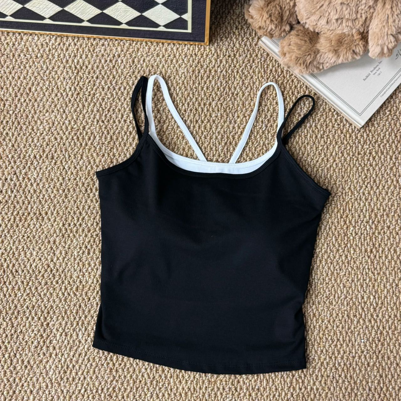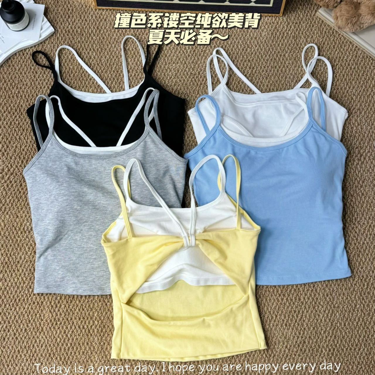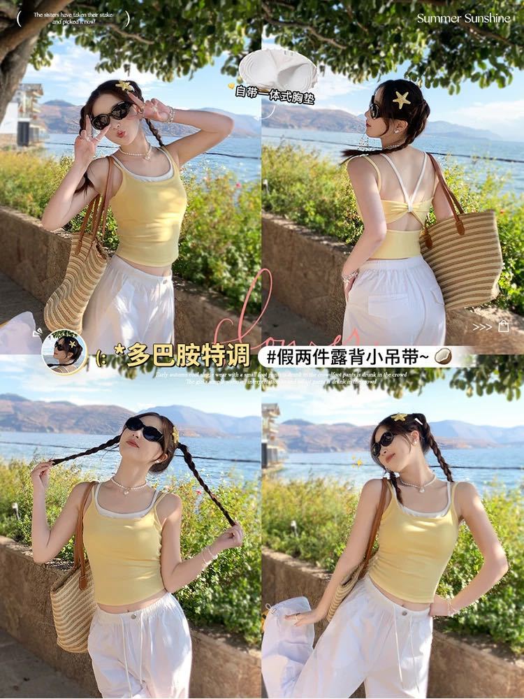 【夏天必备❗️假两件撞色辣妹吊带】撞色系镂空纯欲美背,多巴胺特调,假两件露背小吊带,新款外穿修身显瘦内搭短款上衣L