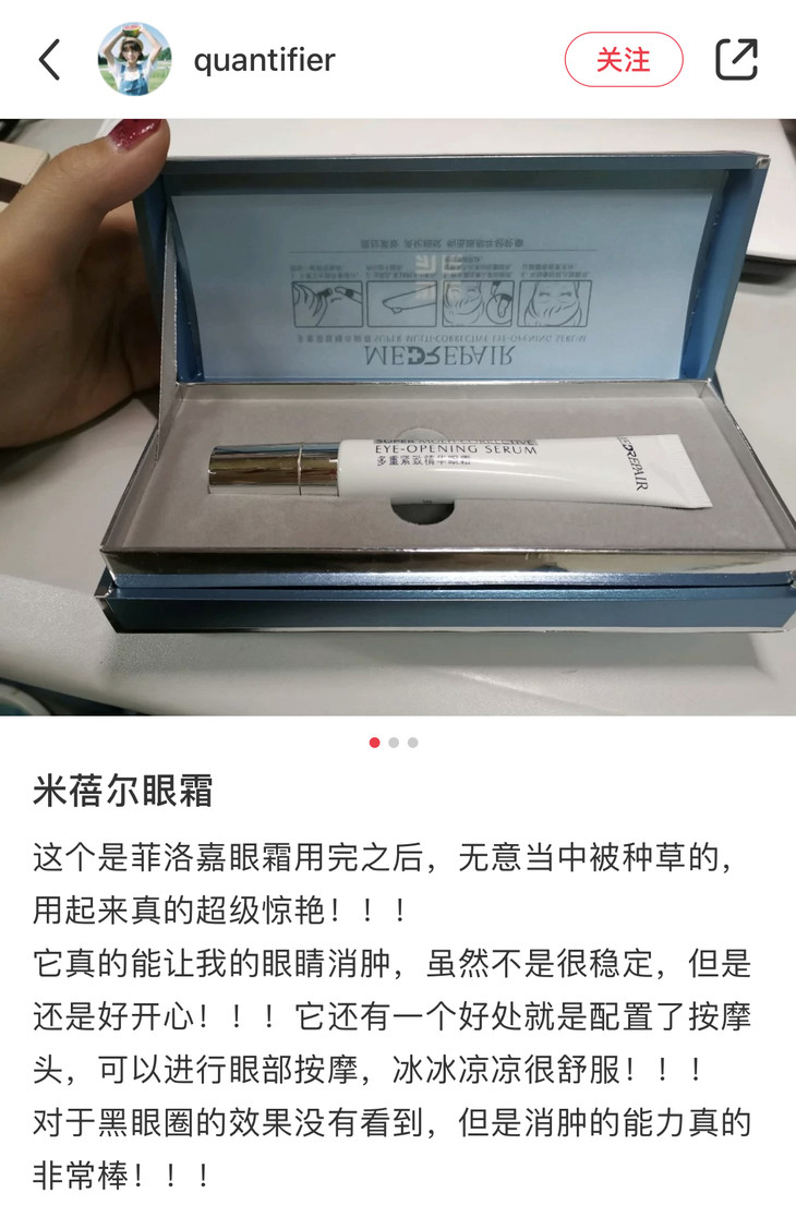 因为有很多好用的医美国货,所以我现在比较少用大牌护肤品了,基本上都是店里的,老粉和EC,还有一些比较喜欢的品牌的单品,成分好,也有效果,性价比比较高,护肤上省下来的钱,就去做医美。这支眼霜也真的是成分党必入了,特别适合熬夜党和25+的初熟龄肌哦!