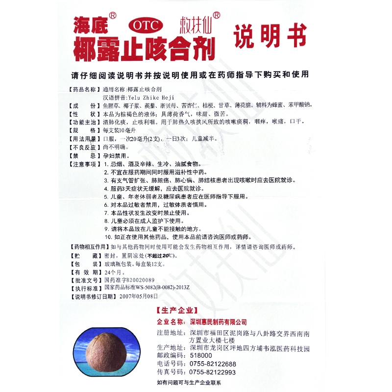 海底椰露止咳合剂12支 清肺化痰 止咳利咽 咳嗽痰稠咽痒喉痛口干