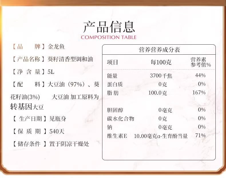 【十堰主城区包邮】金龙鱼葵花清香型食用调和油5L