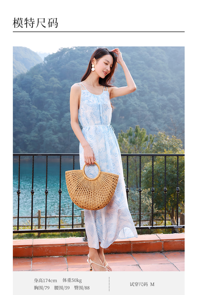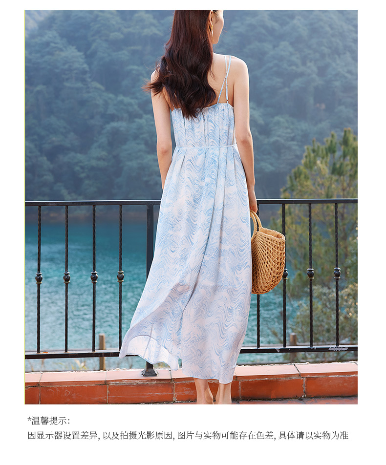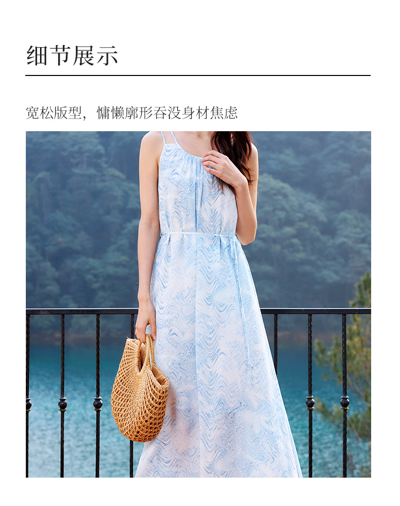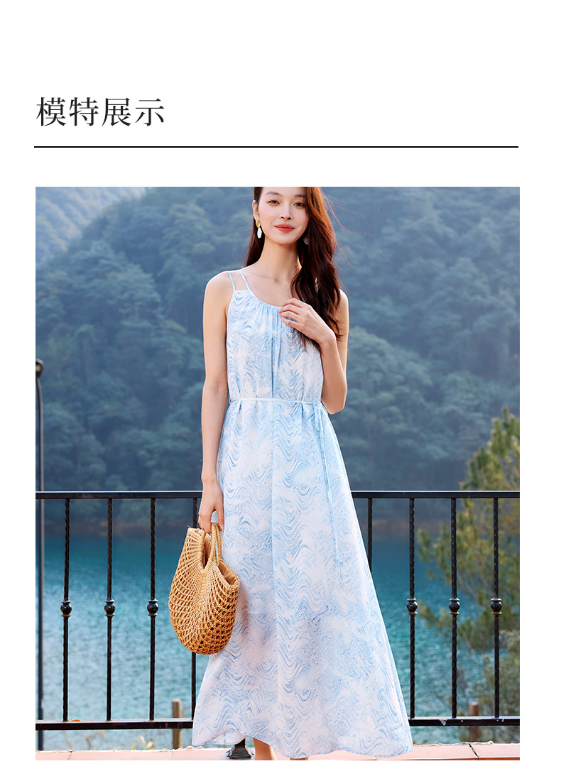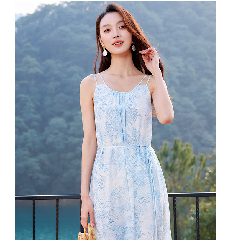 玳莎印花真丝吊带裙2025年夏季新款清新休闲系带收腰桑蚕丝连衣裙 FB35007