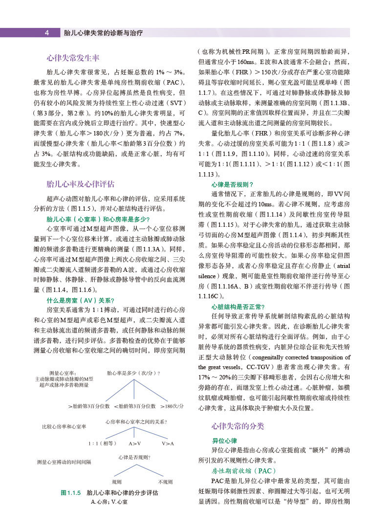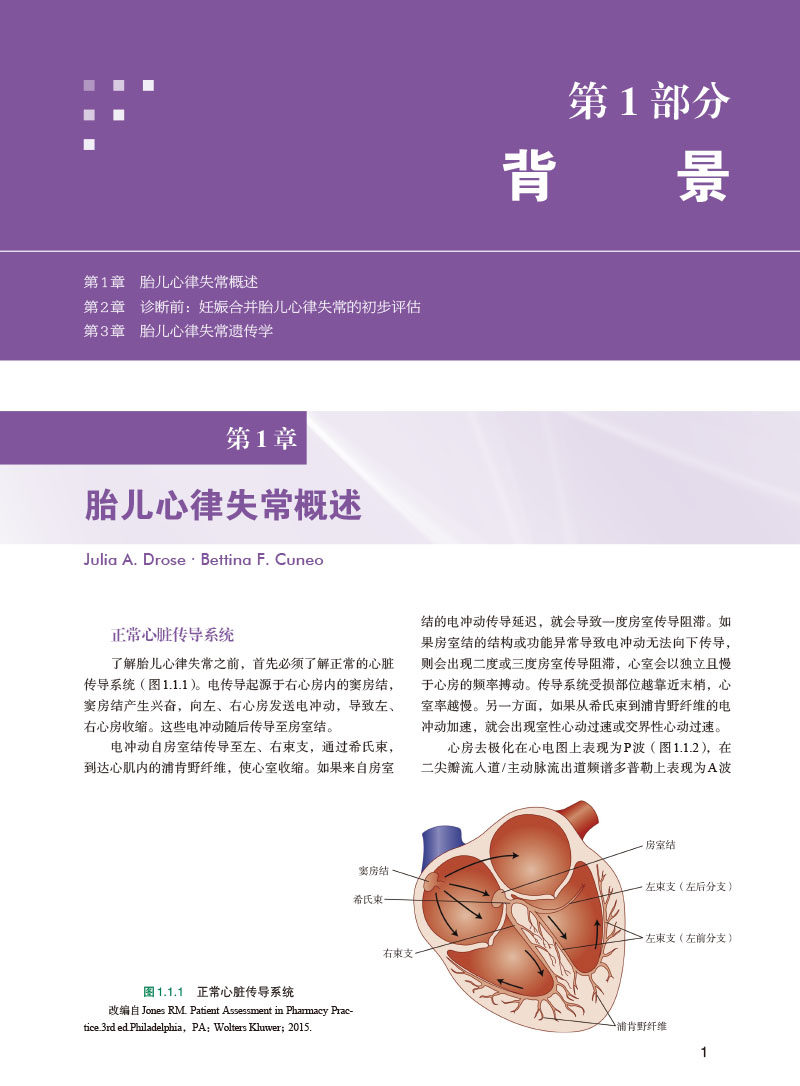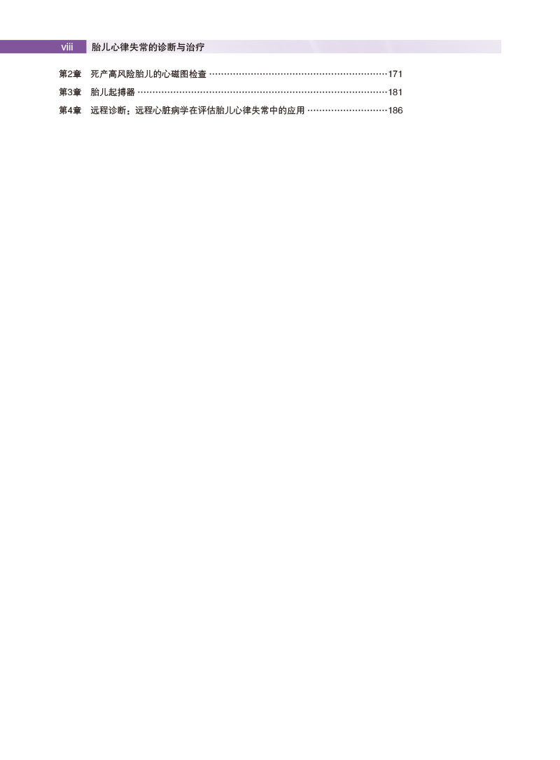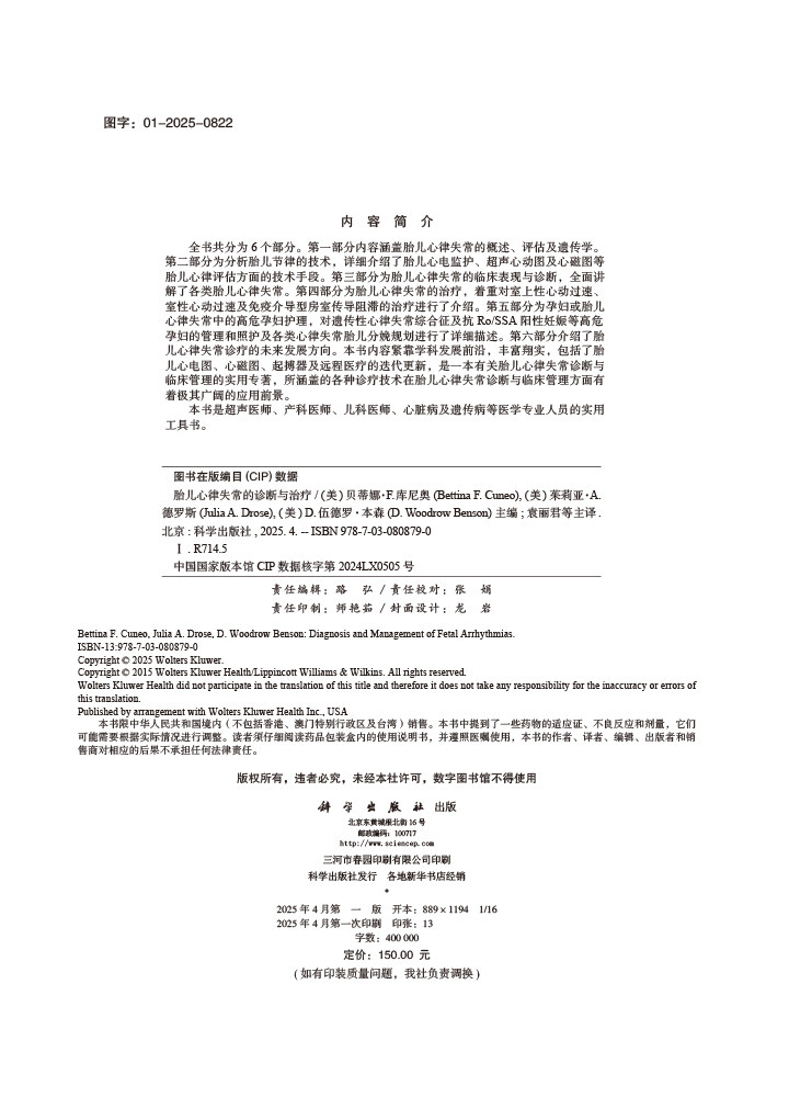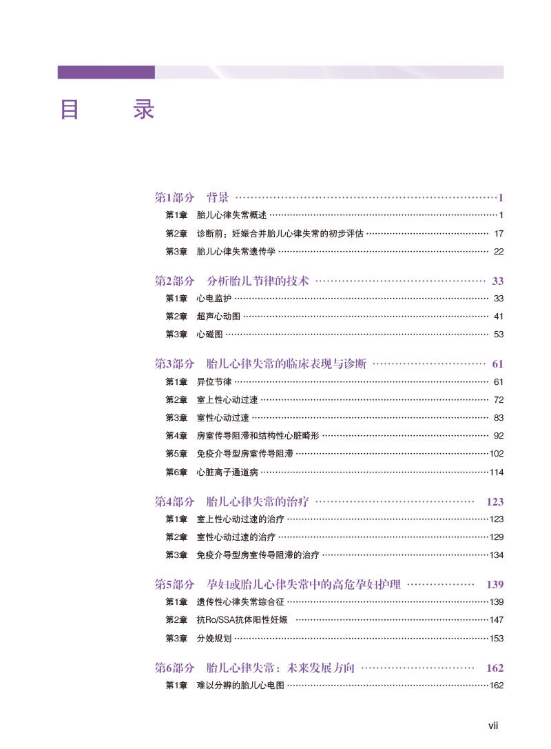 全书共分为6个部分。**部分内容涵盖胎儿心律失常的概述、评估及遗传学。第二部分为分析胎儿节律的技术,详细介绍了胎儿心电监护、超声心动图及心磁图等胎儿心律评估方面的技术手段。第三部分为胎儿心律失常的临床表现与诊断,全面讲解了各类胎儿心律失常。第四部分为胎儿心律失常的治疗,着重对室上性心动过速、室性心动过速及免疫介导型房室传导阻滞的治疗进行了介绍。第五部分为孕妇或胎儿心律失常中的高危孕妇护理,对遗传性心律失常综合征及抗Ro/SSA阳性妊娠等高危孕妇的管理和照护及各类心律失常胎儿分娩规划进行了详细描述。第六部分介绍了胎儿心律失常诊疗的未来发展方向。本书内容紧靠学科发展前沿,丰富翔实,包括了胎儿心电图、心磁图、起搏器及远程医疗的迭代更新,是一本有关胎儿心律失常诊断与临床管理的实用专著,所涵盖的各种诊疗技术在胎儿心律失常诊断与临床管理方面有着极其广阔的应用前景。