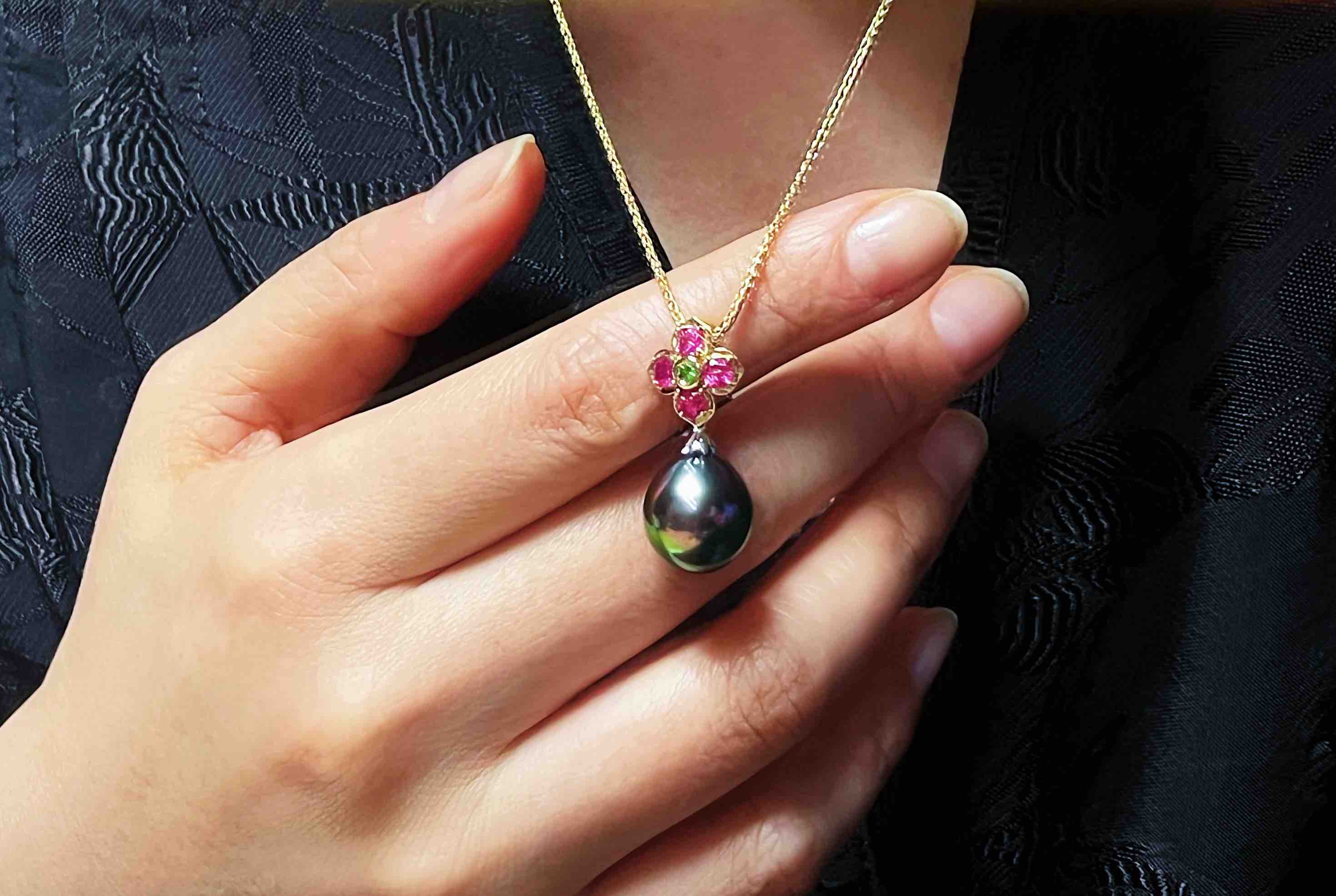 作品名称:18K镶红宝石、沙弗莱和大溪地珍珠