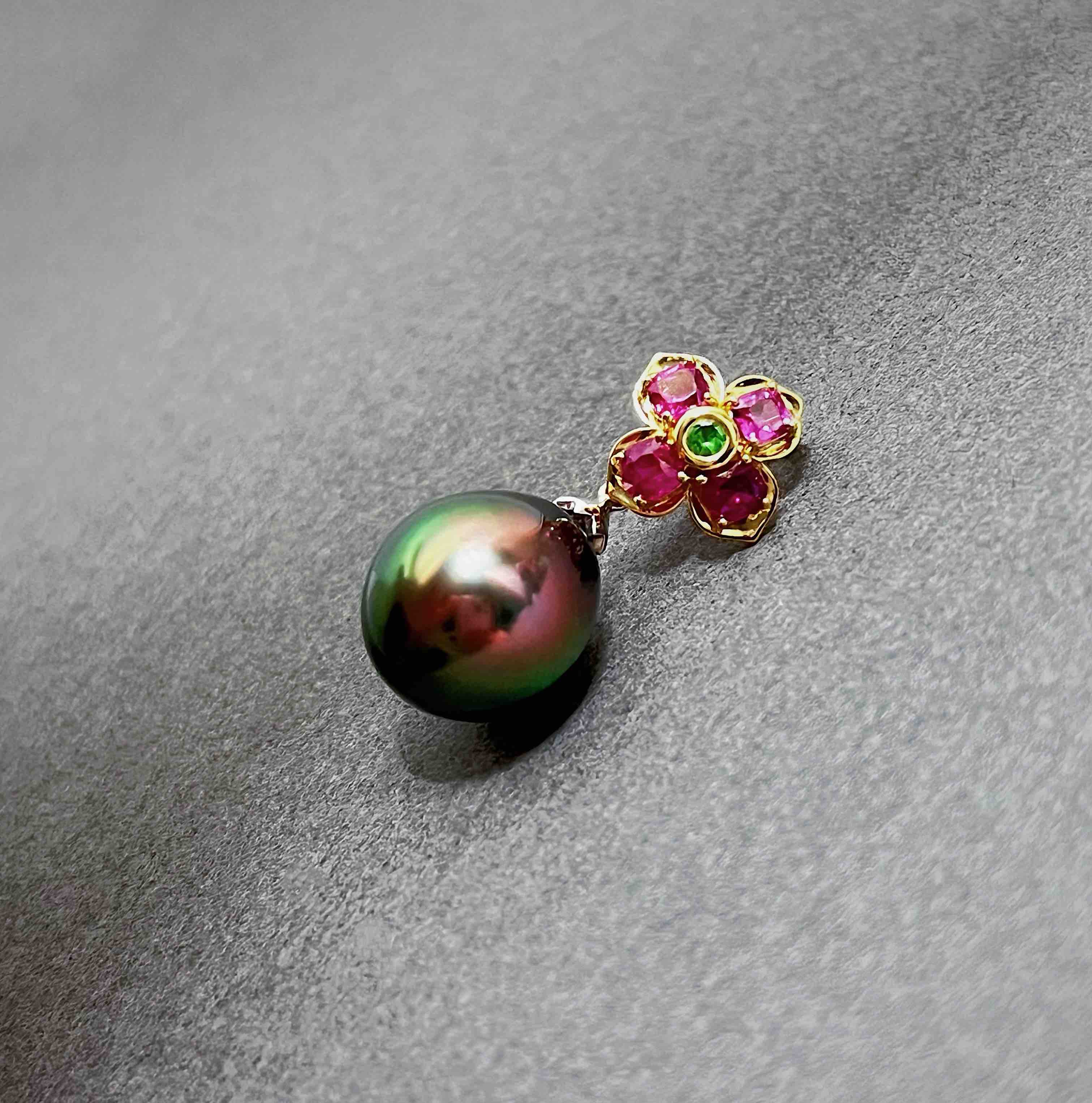 BY EVITA系列 18K镶红宝石、沙弗莱和孔雀绿色大溪地珍珠 坠子