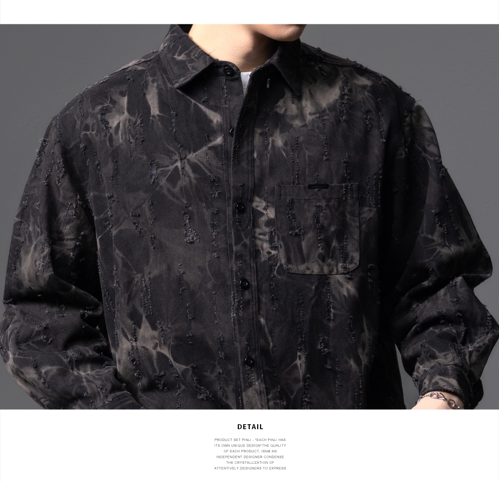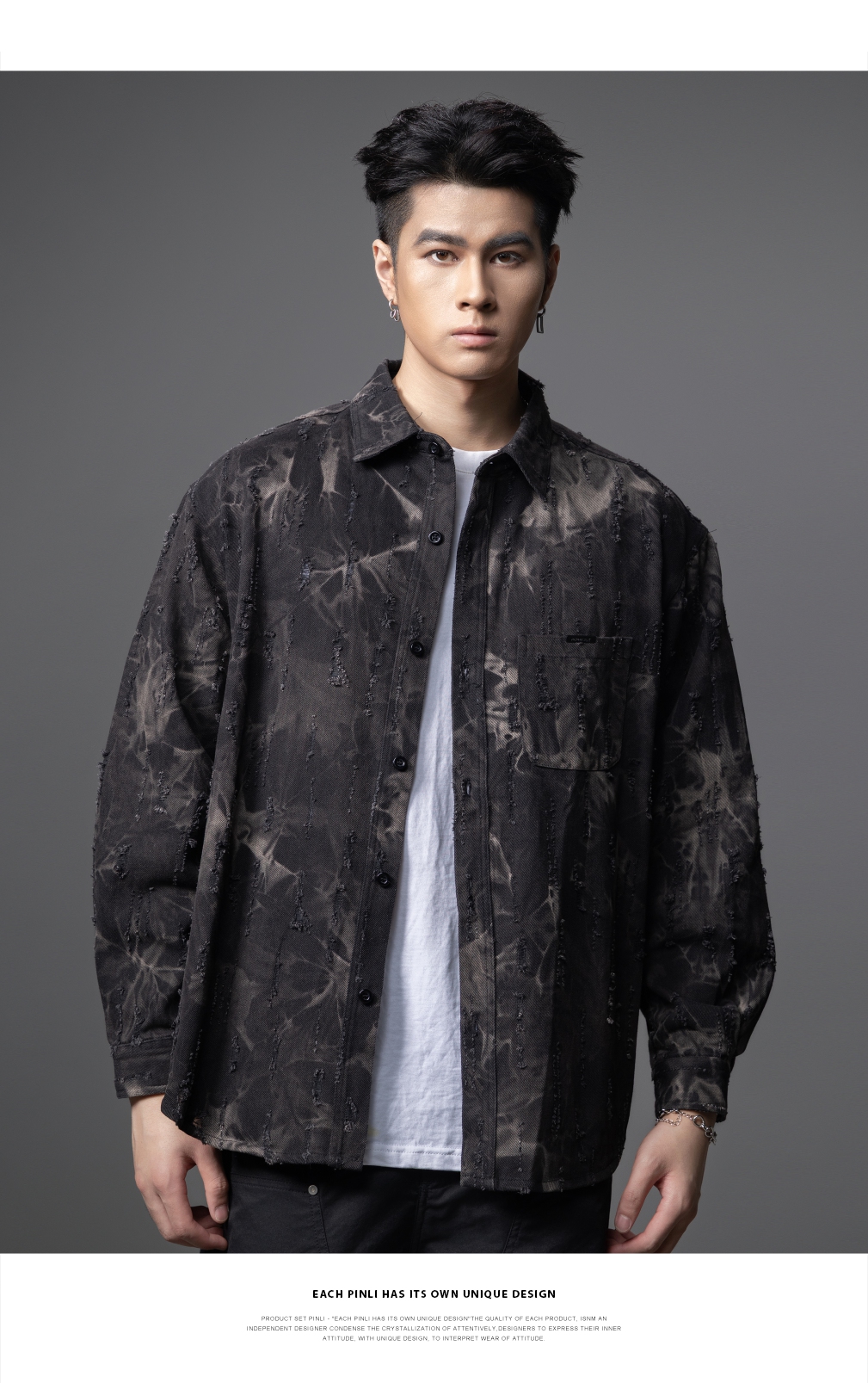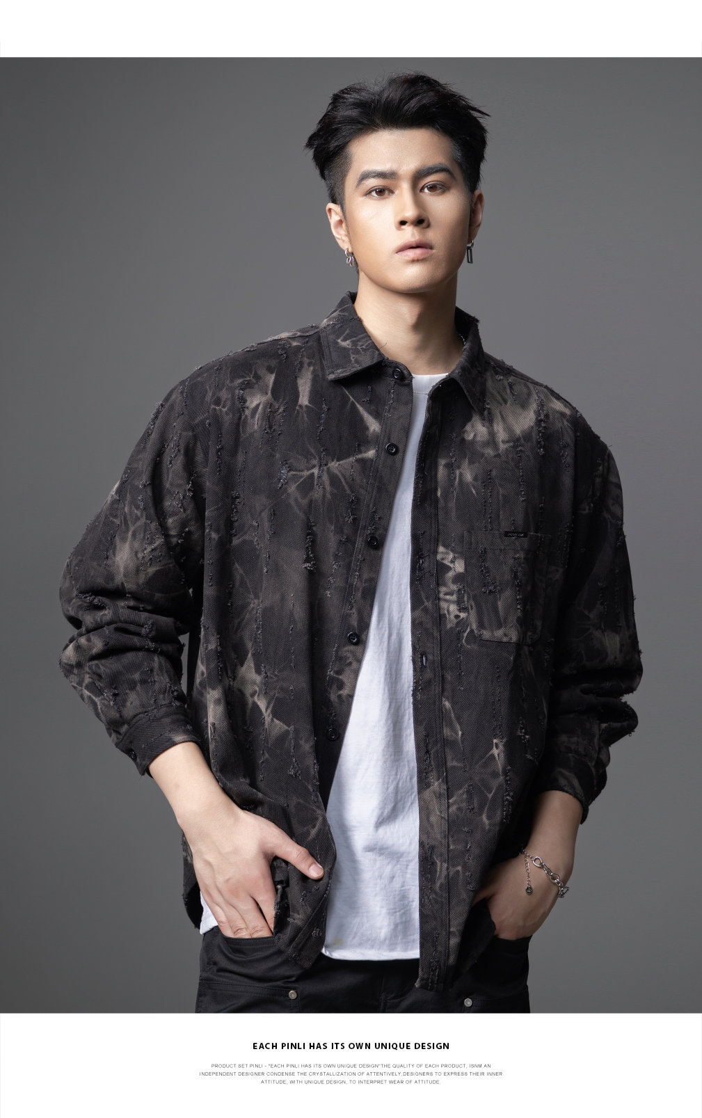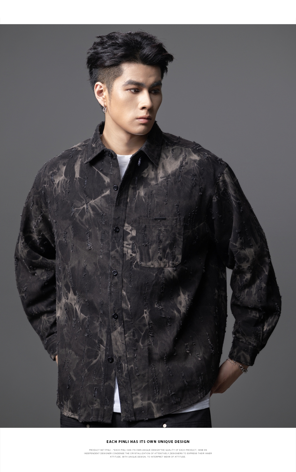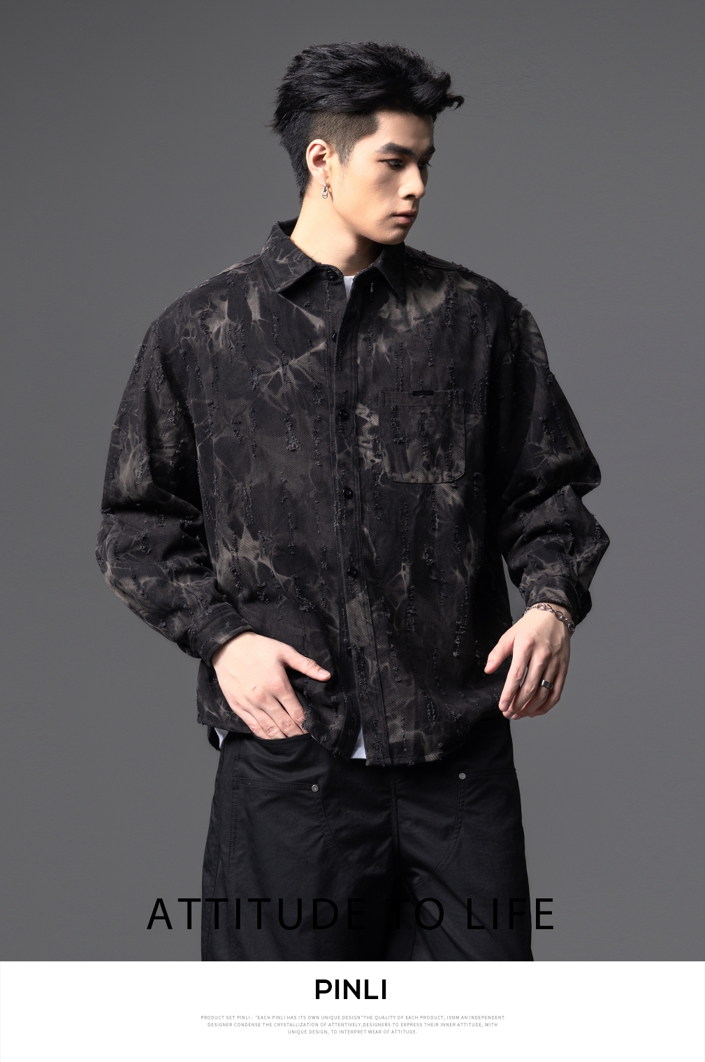 PINLI品立春季新款复古扎染长袖牛仔衬衫男潮牌宽松休闲外套GD253113115