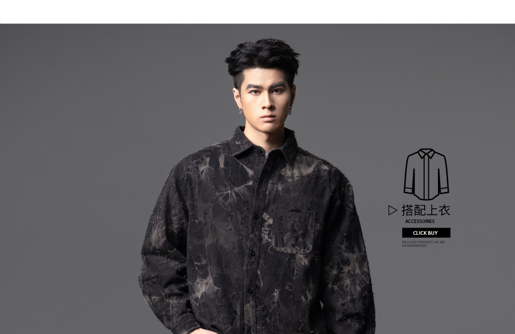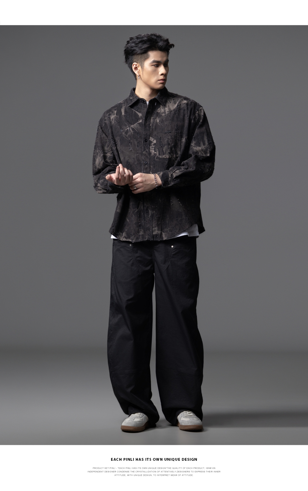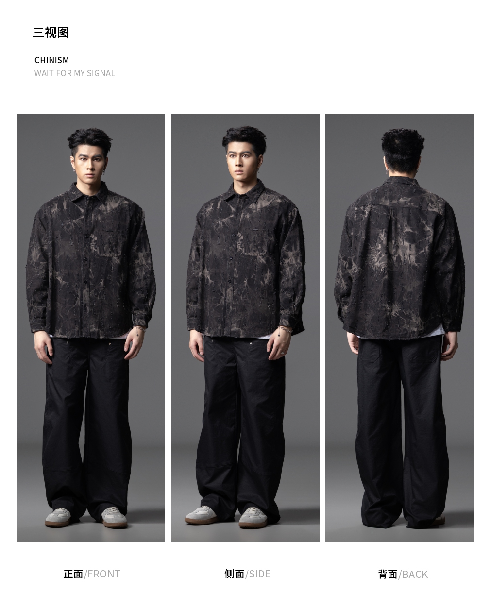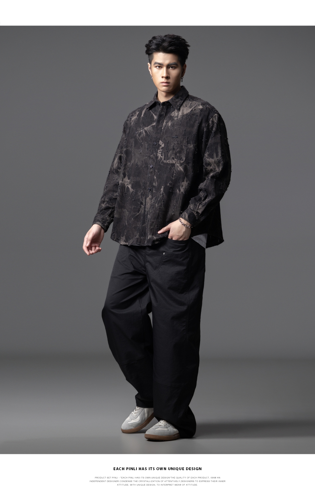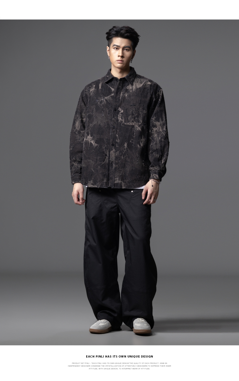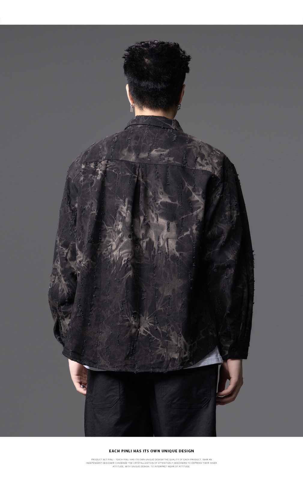 PINLI品立春季新款复古扎染长袖牛仔衬衫男潮牌宽松休闲外套GD253113115