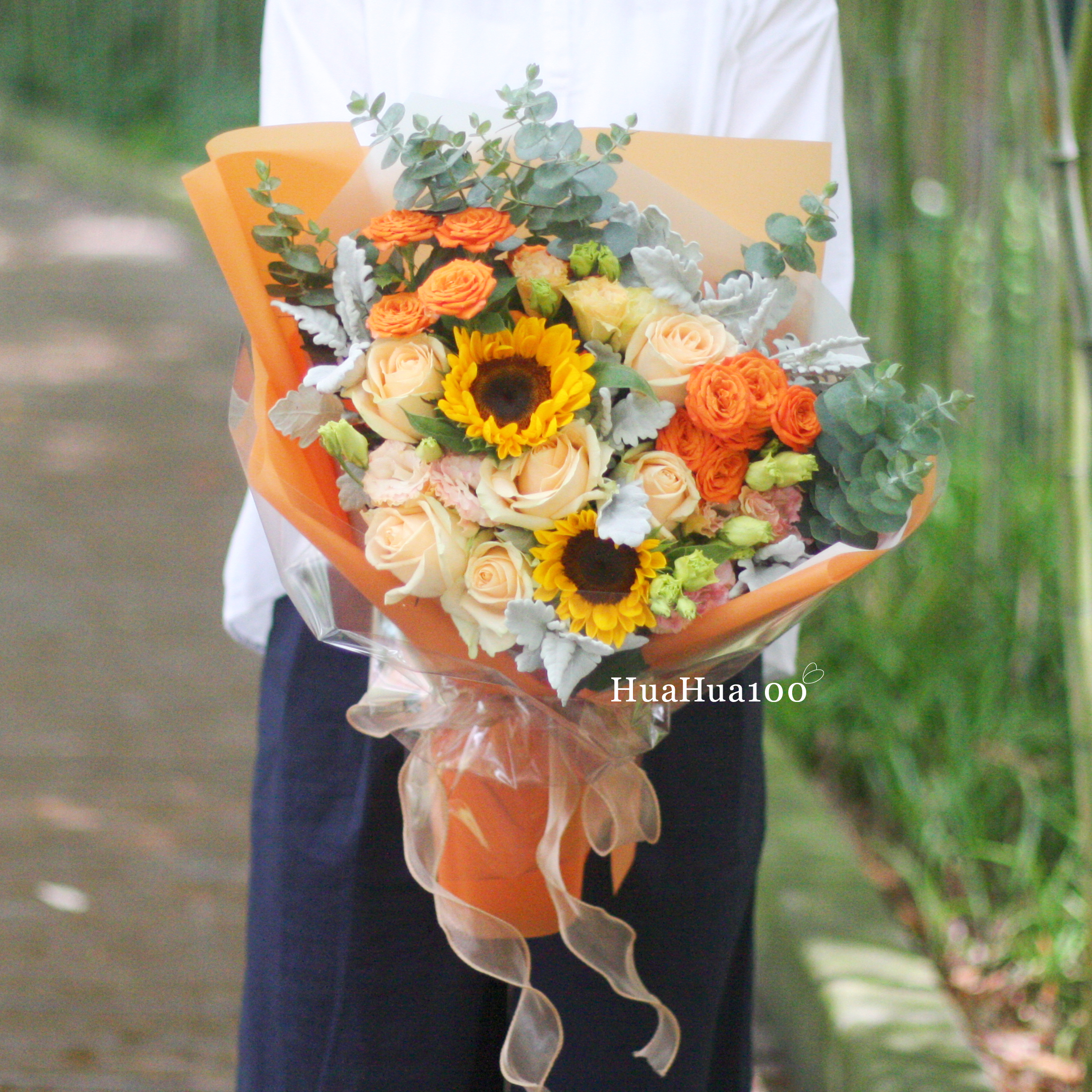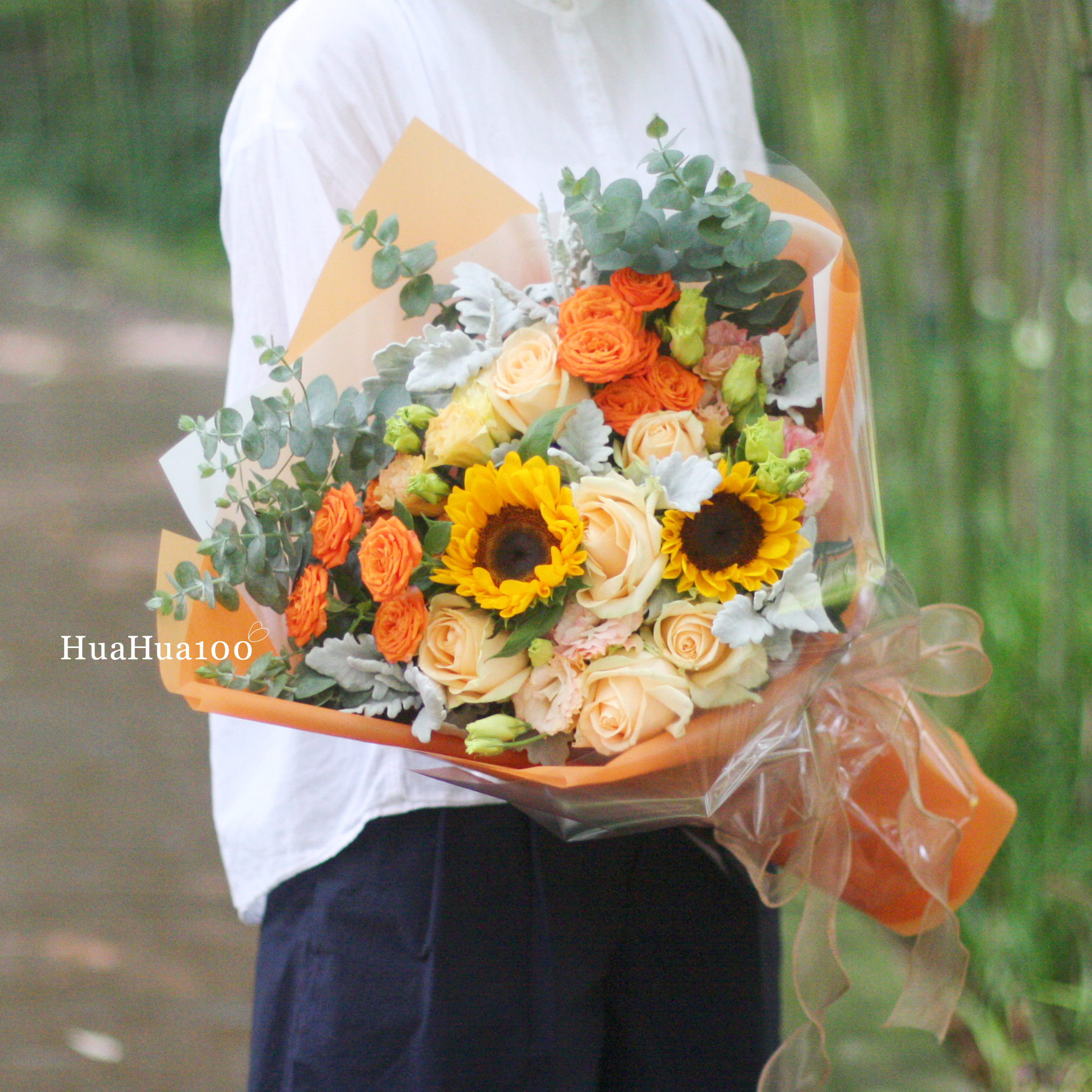 橘彩星光丨香槟玫瑰向日葵混合花束