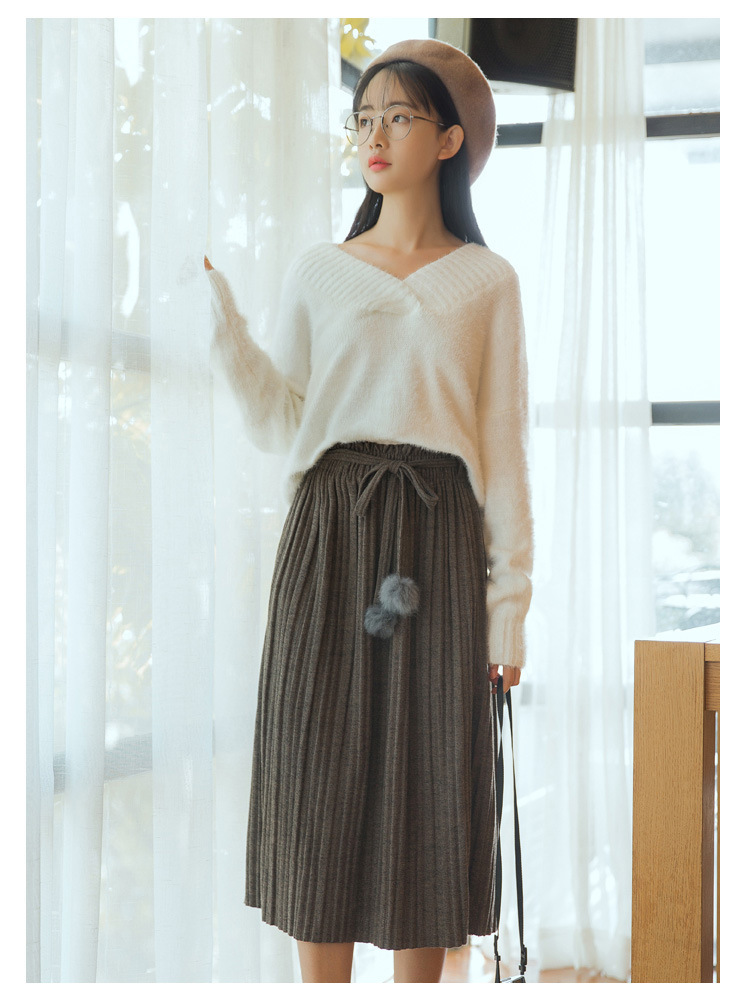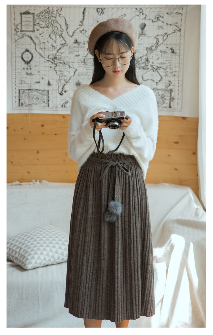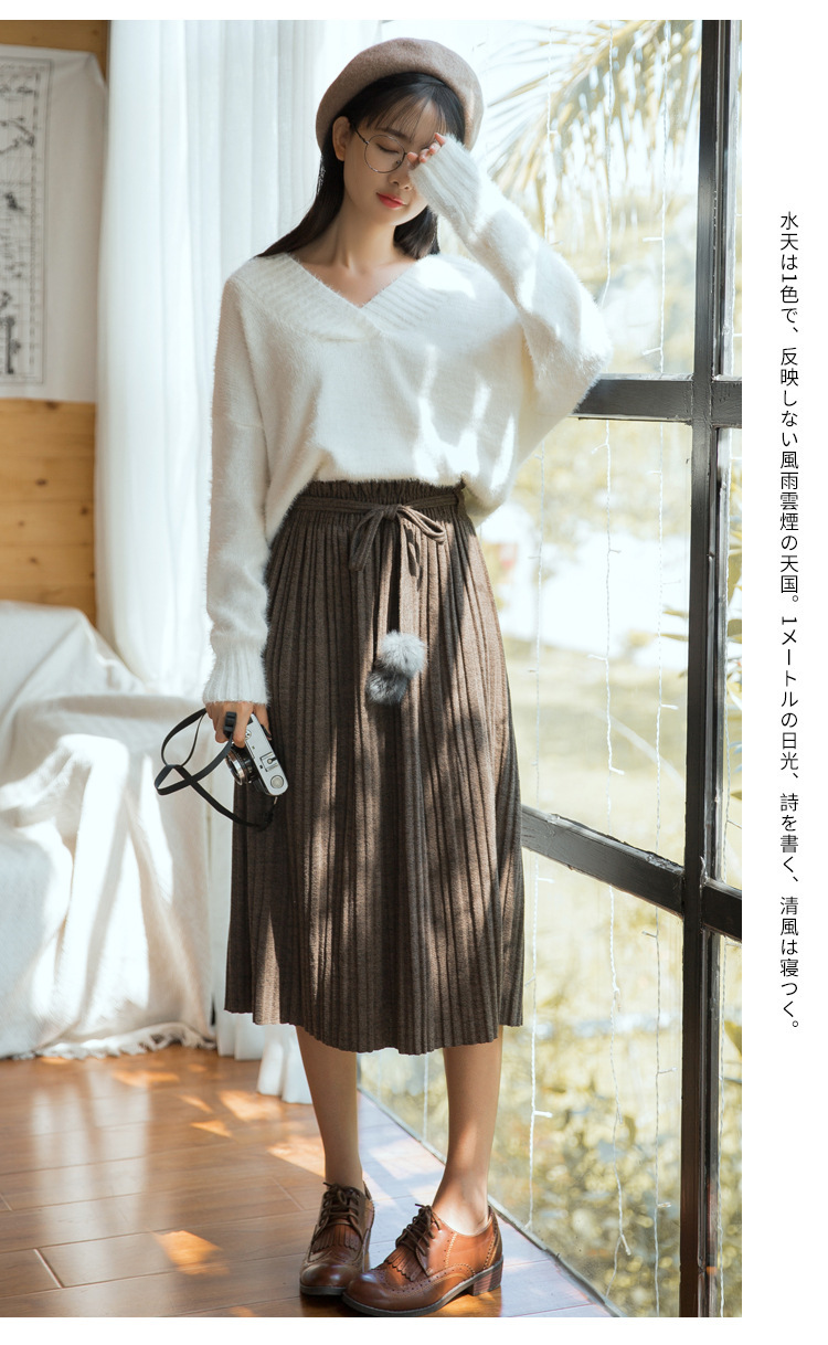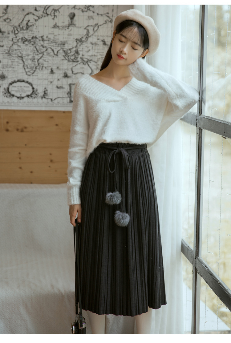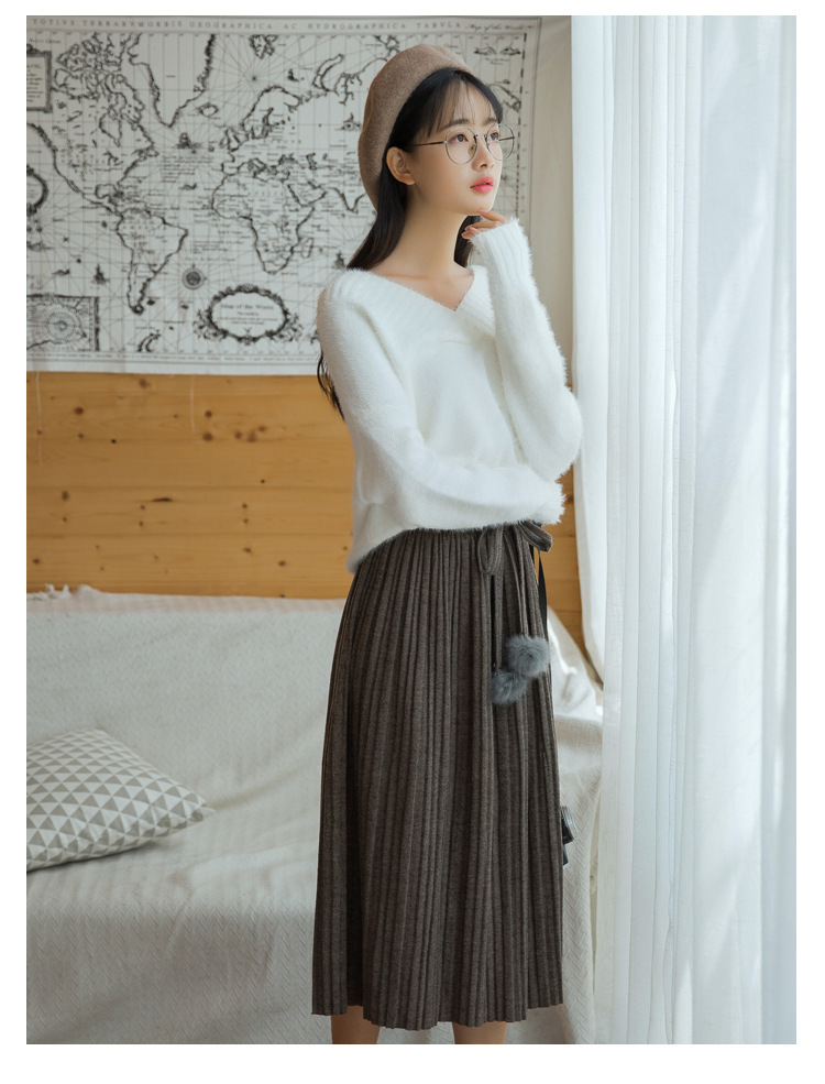 【毛衣】秋冬新款韩版纯色气质高腰系带毛球针织百褶半身裙女