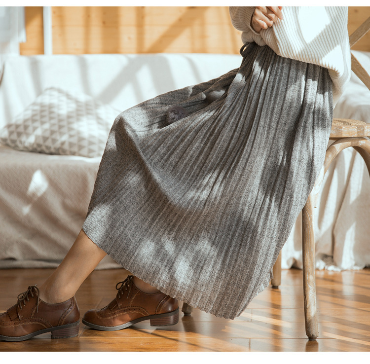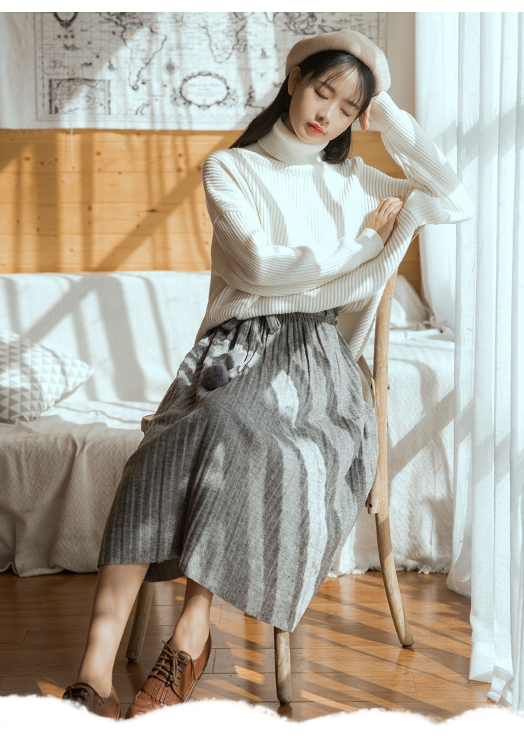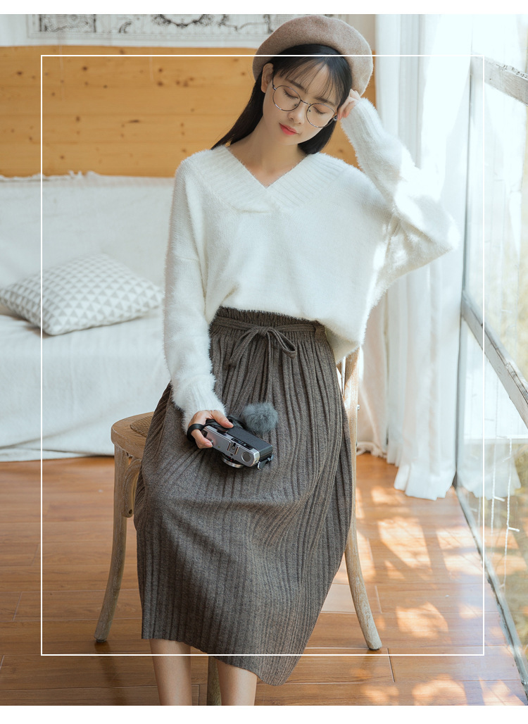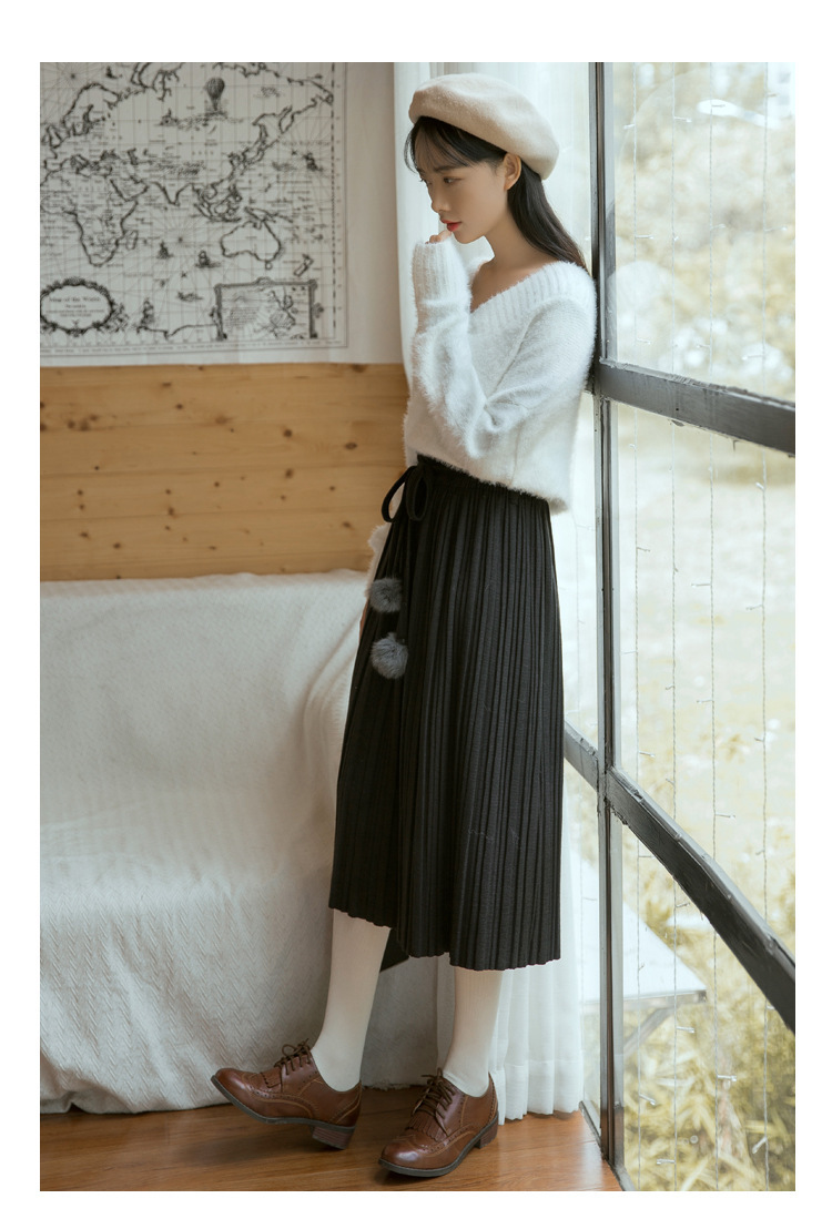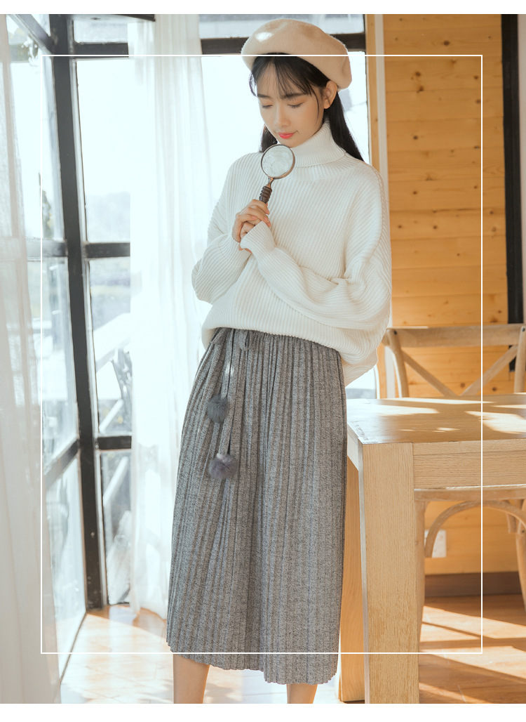 【毛衣】秋冬新款韩版纯色气质高腰系带毛球针织百褶半身裙女