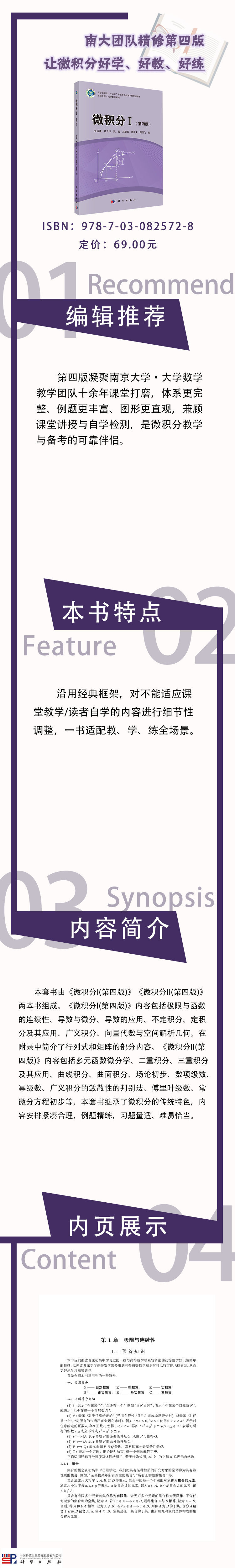 《微积分I》内容包括极限与函数的连续性、导数与微分、导数的应用、不定积分、定积分及其应用、广义积分简介、向量代数与空间解析几何. 在附录中简介了行列式和矩阵的部分内容.本教材关于微积分在经济学中的应用,在物理学中的应用等章节,以及各章节中安排的与其他学科相关的例题和习题,充分考虑了不同专业领域对数学的共性要求以及个性需求,既可以使学生了解数学在不同学科背景奠定应用,也适合不同专业的学生有针对性地选择学习,使不同专业学生都能从中得到所需的数学训练,以应对后续专业课程学习。