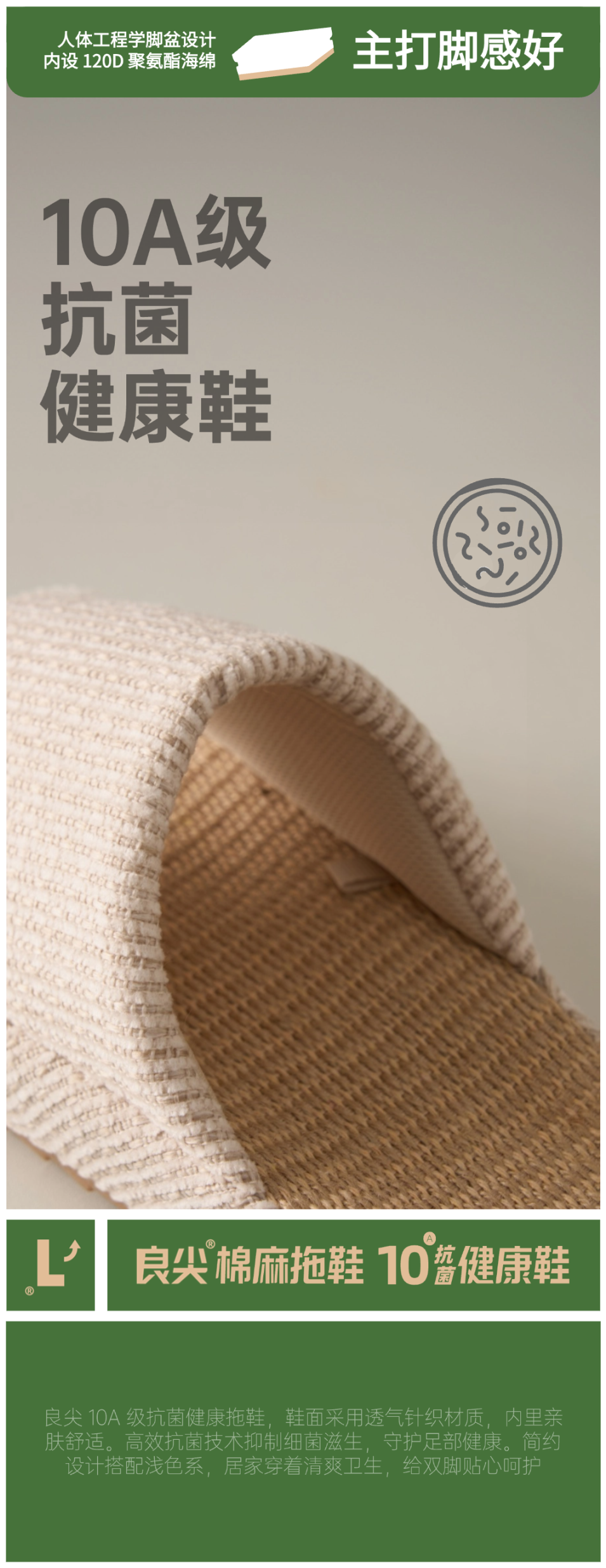 更安心的是它的10A抑菌力,抑菌率高达99%。普通拖鞋越穿越脏,满鞋底的细菌,但良尖就算水洗300次依旧在线,汗液不堆积、脚也不发痒啦!还做到0邻苯、0甲醛、0异味,老人小孩穿着干净清爽,脚汗多、有脚气的更是要来一双,抗菌耐洗,特别舒服!