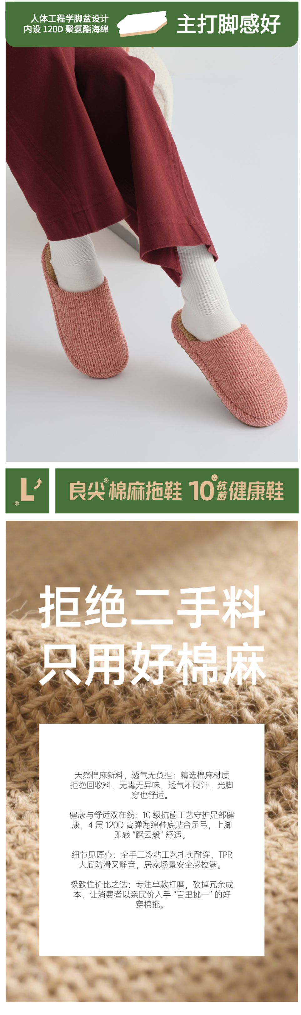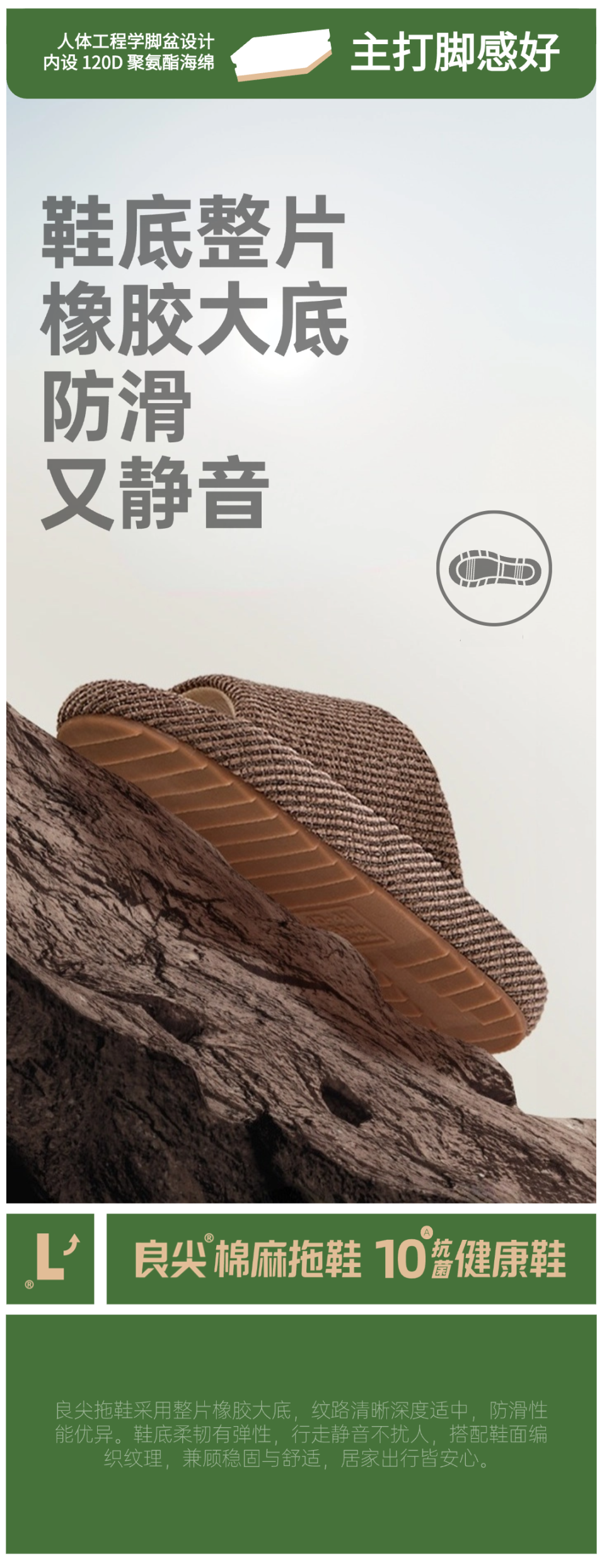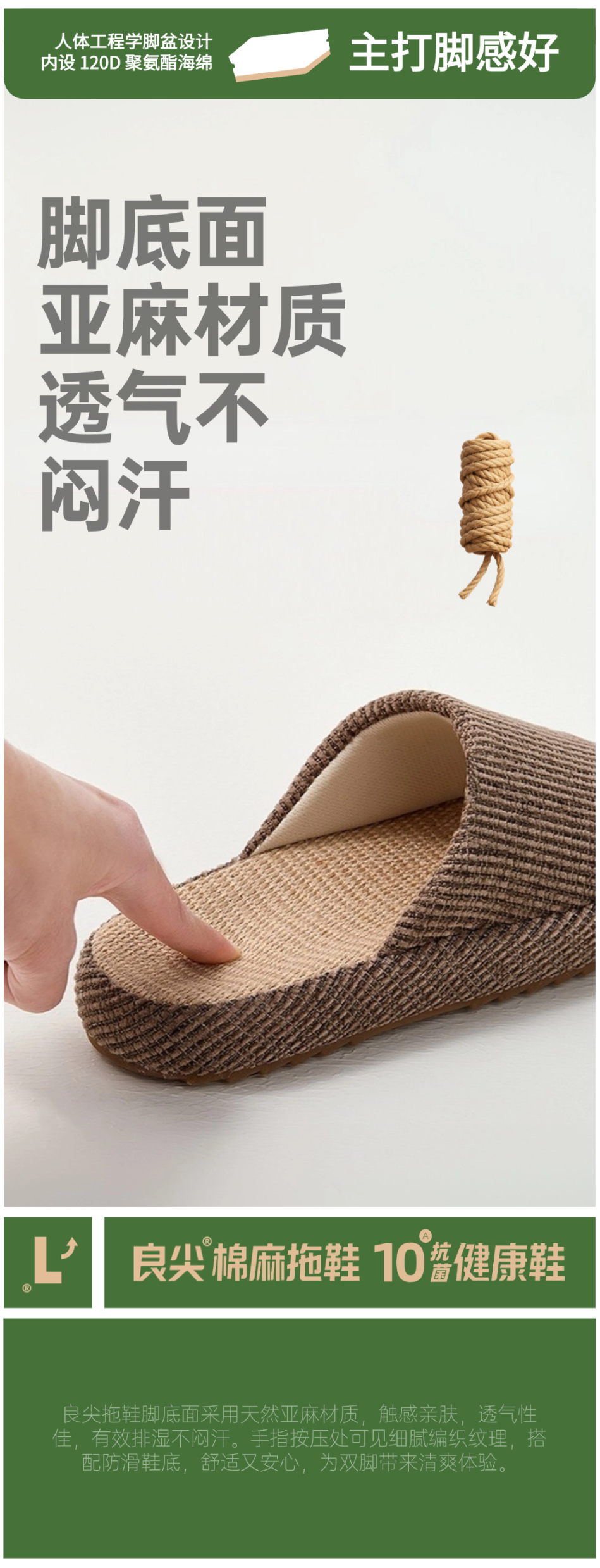 良尖棉麻拖鞋,脚踏面是亚麻混纺材质,摸着手感就很细腻,光脚踩更像是贴了层透气云朵,而且还做了混纺精编工艺,中和了纯亚麻的粗糙,只有轻柔的按摩感。关键是透气吸湿性很强,搭配米通金丝布内里,上万个小孔能排走脚面的热气和汗气——夏天不闷、冬天不臭、回南天不黏脚,一年穿到底,省心又省钱!